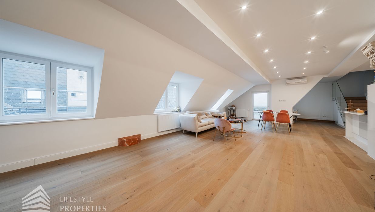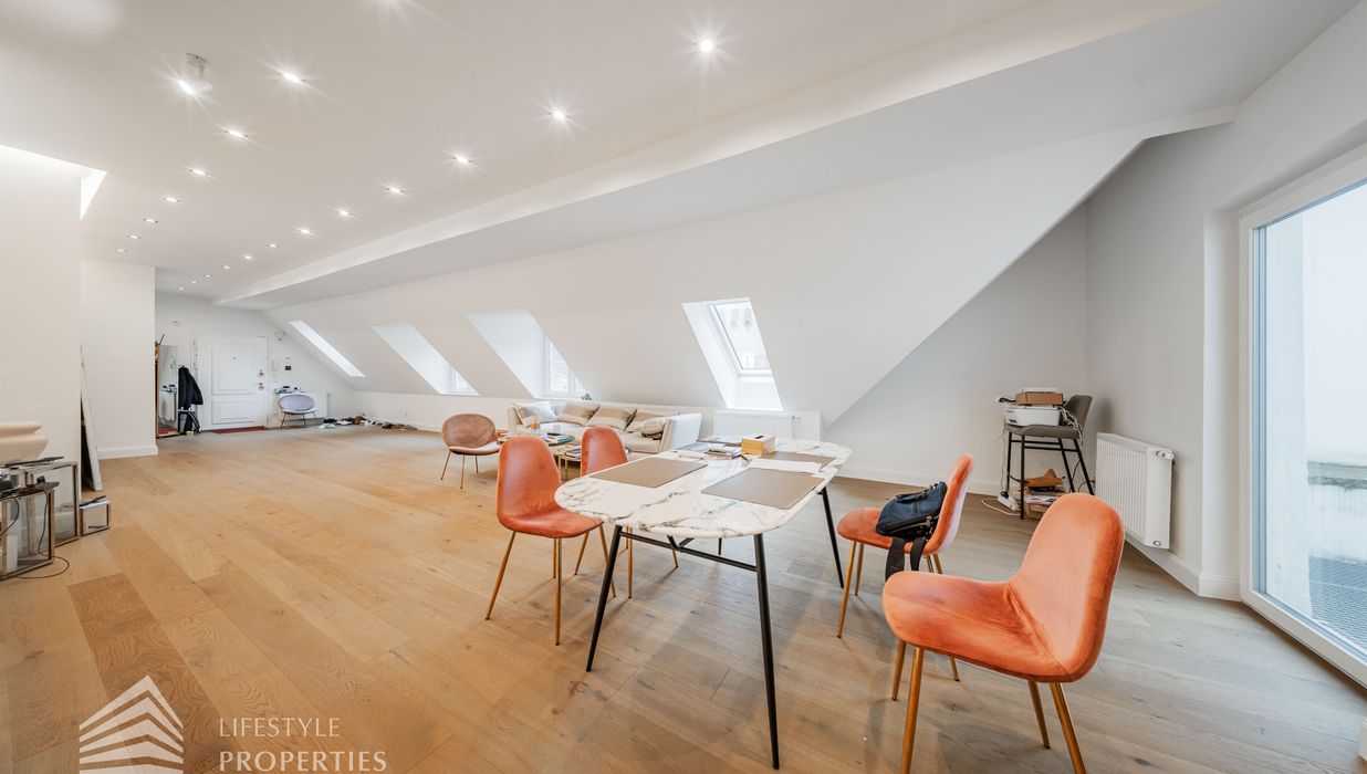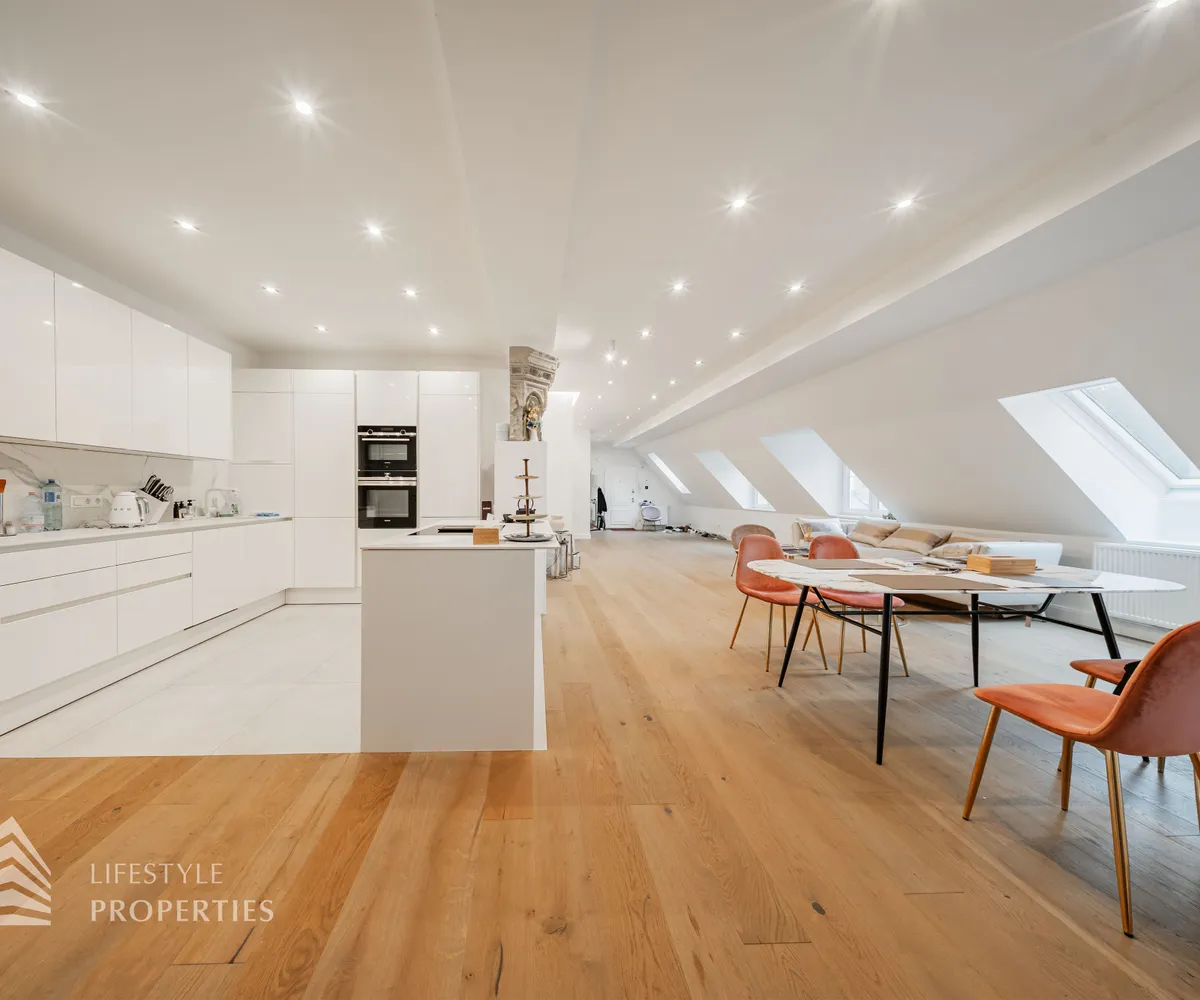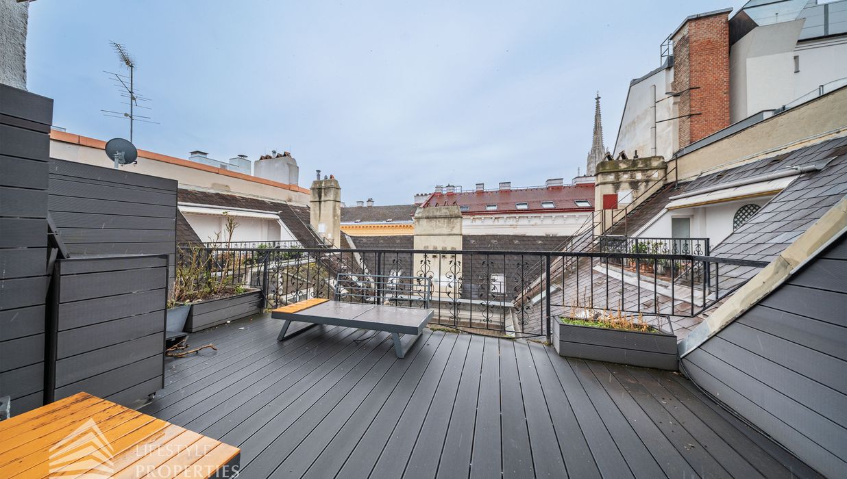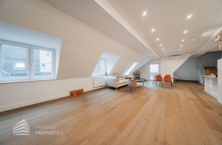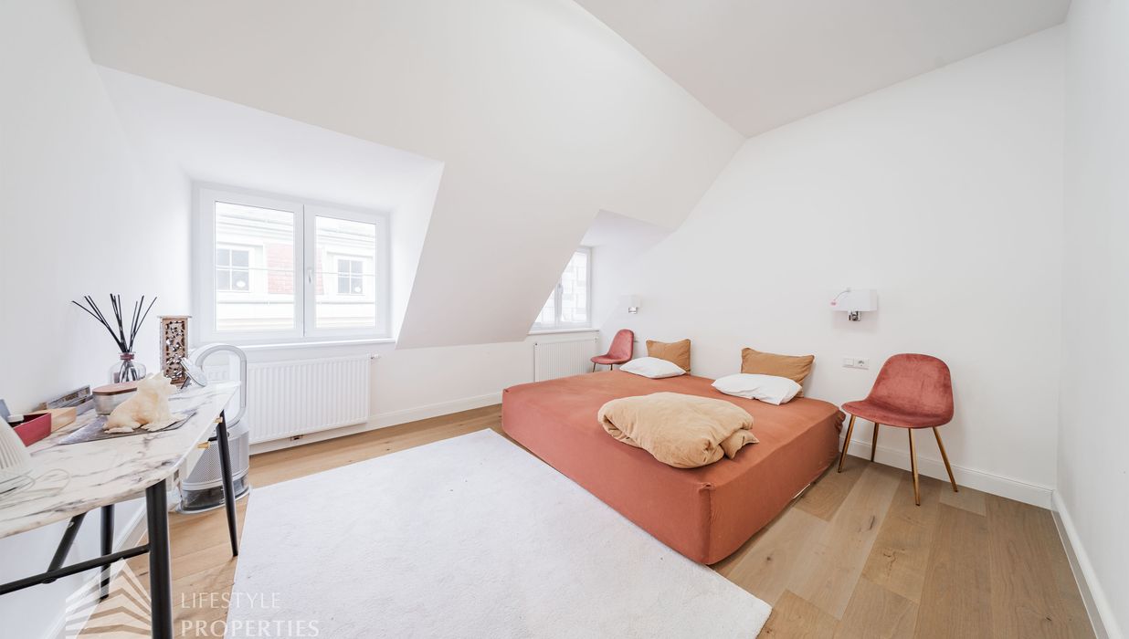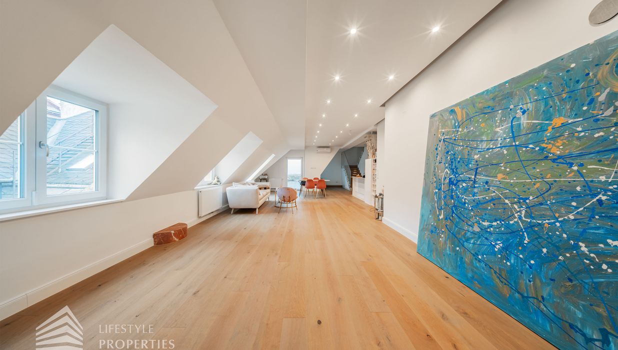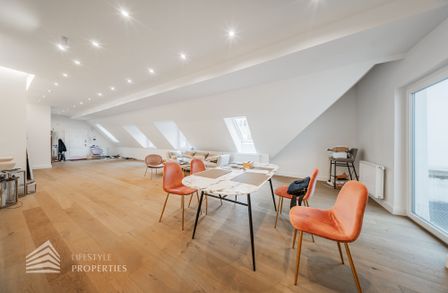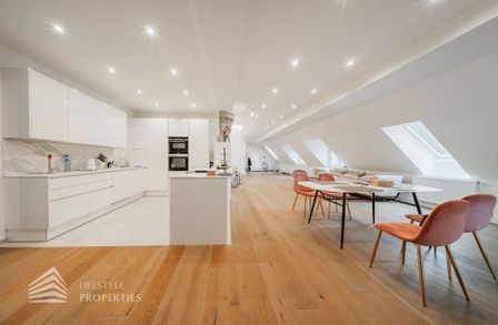 Die traumhafte Wohnung befindet sich im 1. und 2. Dachgeschoss eines gepflegten Altbaus und erstreckt sich über eine großzügige Wohnfläche von ca. 175 m². Diese teilt sich auf in eine Wohnküche, 3 Zimmer, 2 Badezimmer, ein Gäste-WC sowie einen praktischen Abstellraum. Eine Terasse sowie ein charmanter Balkon runden das Angebot perfekt ab. In den Wohnräumen wurde edles Parkett verlegt, die Nassräume sind mit modernen Fliesen ausgestattet. Beheizt wird mittels Gasetagenheizung. Eine kühle Atmosphäre an warmen Sommertagen garantiert die installierte Klimaanlage.