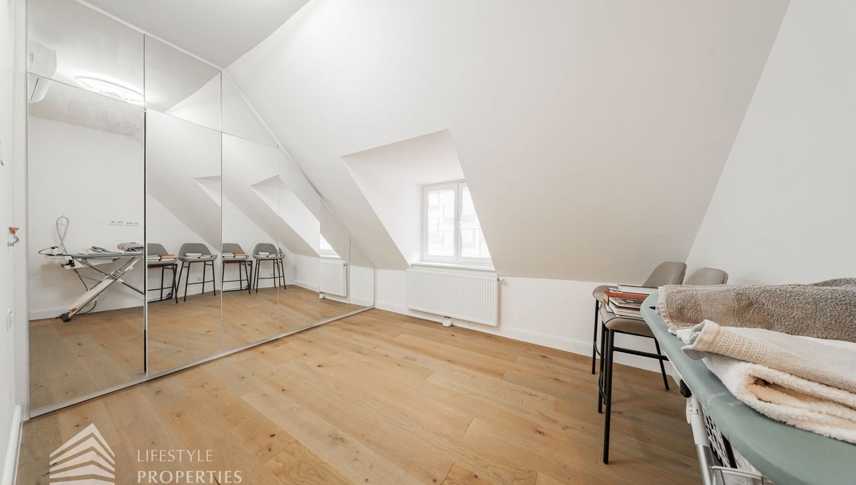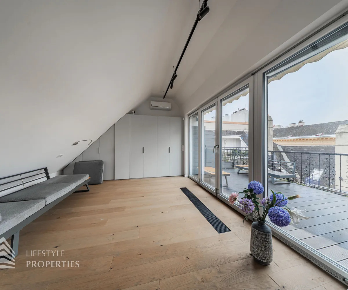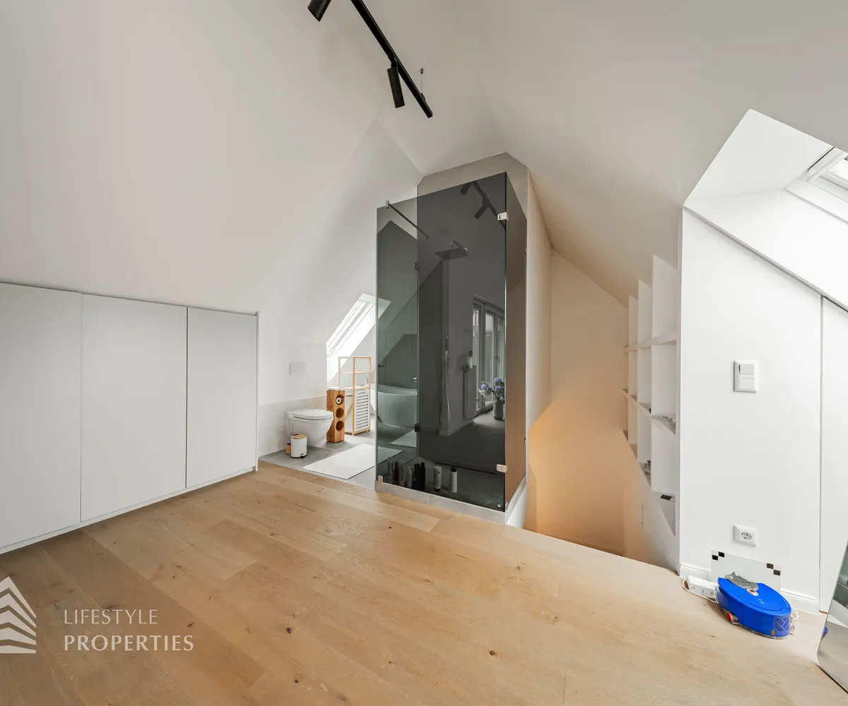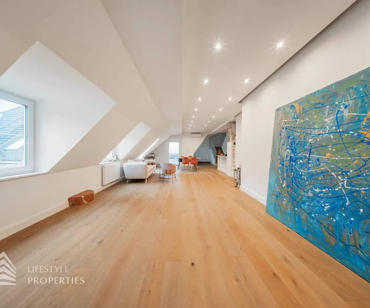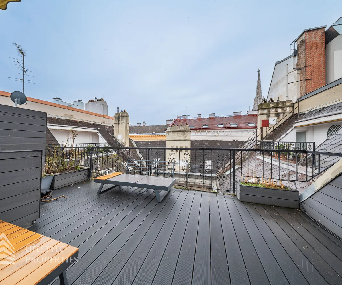 Die traumhafte Wohnung befindet sich im 1. und 2. Dachgeschoss eines gepflegten Altbaus und erstreckt sich über eine großzügige Wohnfläche von ca. 175 m². Diese teilt sich auf in eine Wohnküche, 3 Zimmer, 2 Badezimmer, ein Gäste-WC sowie einen praktischen Abstellraum. Eine Terasse sowie ein charmanter Balkon runden das Angebot perfekt ab. In den Wohnräumen wurde edles Parkett verlegt, die Nassräume sind mit modernen Fliesen ausgestattet. Beheizt wird mittels Gasetagenheizung. Eine kühle Atmosphäre an warmen Sommertagen garantiert die installierte Klimaanlage.