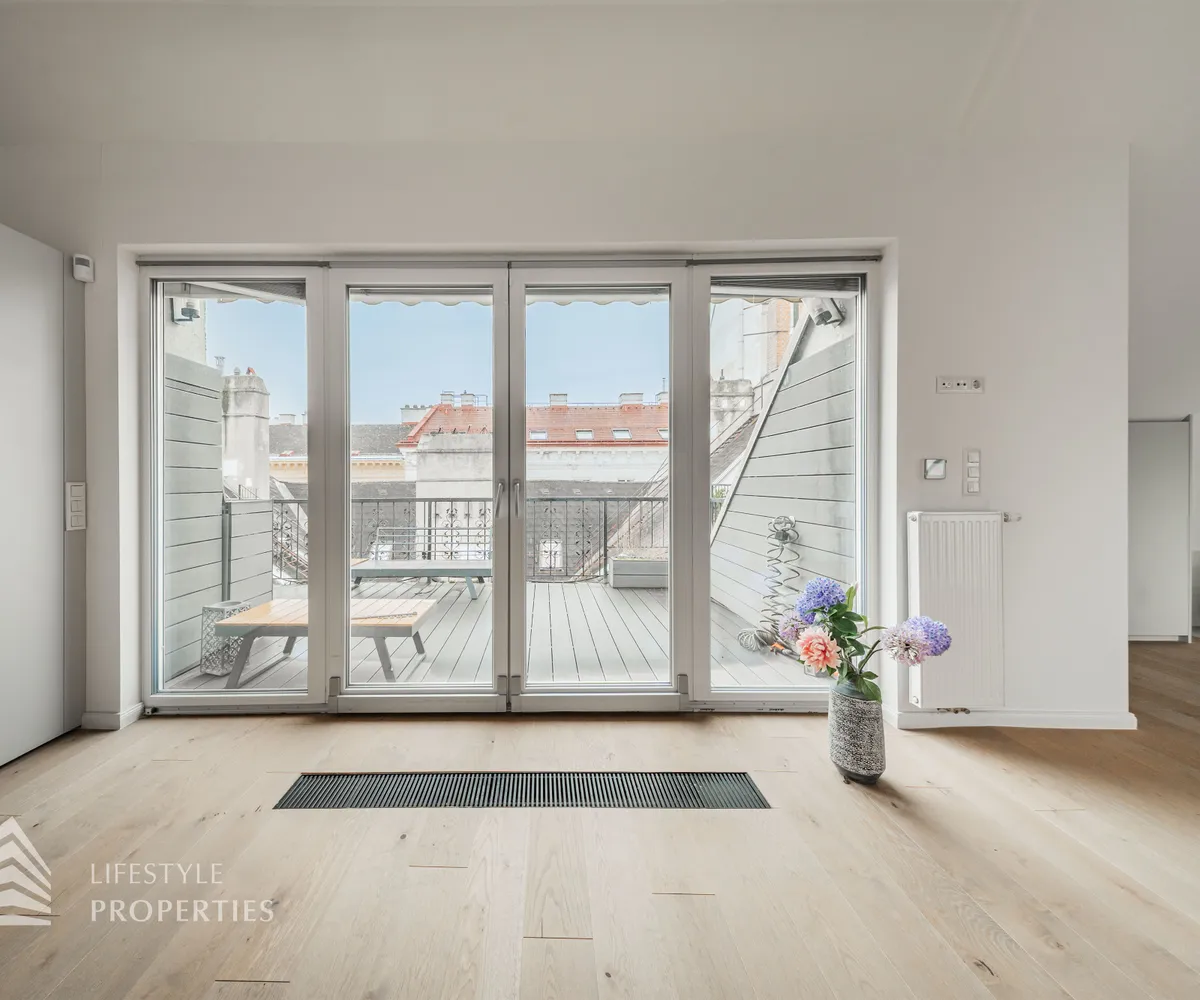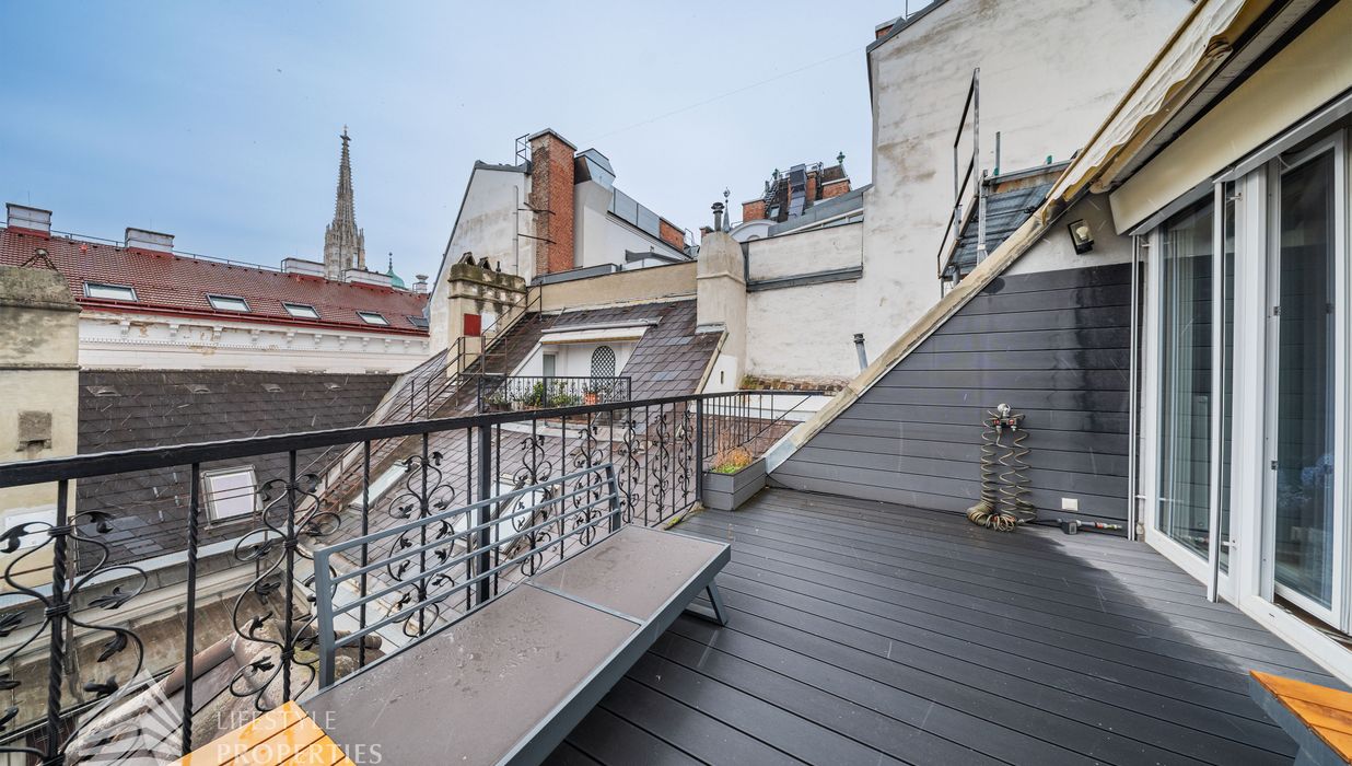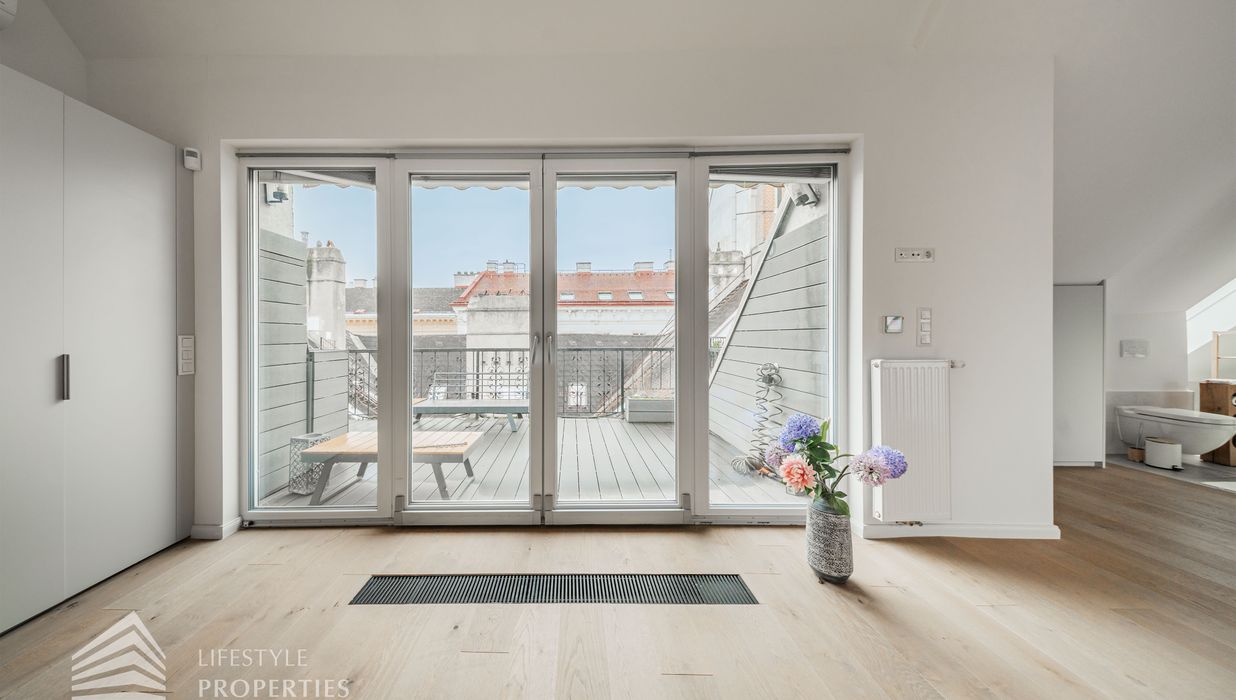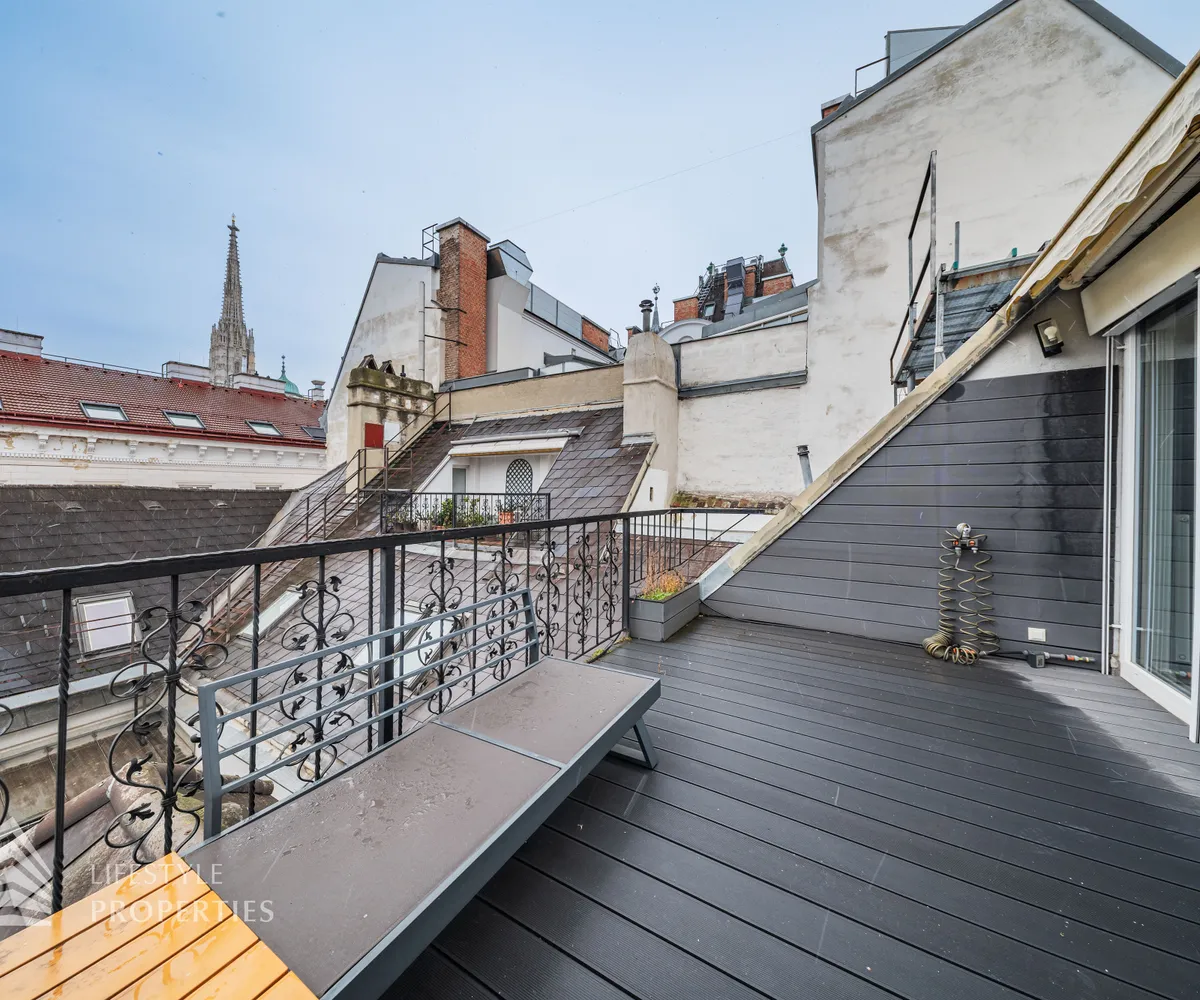 Bei Betreten der Wohnung gelangen Sie in den Vorraum, welcher sich direkt in die großzügige ca. 79 m² große Wohnküche öffnet. Diese verbindet alle Räume des Geschosses miteinander. Rechterhand erreichen Sie ein ca. 14 und ein ca. 15 m² großes Zimmer. Das mit einer Dusche, einem Waschtisch und einer Toilette ausgestattete Badezimmer befindet sich ebenfalls auf der rechten Seite. Rechts neben der Eingangstüre befindet sich ein Abstellraum sowie ein Gäste WC. Über die Wohnküche gelangen Sie auf den charmanten Balkon sowie über die Treppe ins obere Geschoss. Hier erwartet Sie das Master Bedroom mit einer Größe von ca. 36 m² und einem ca. 13 m² großen en suite Badezimmer, welches mit einer Badewanne, Dusche und einer Toilette ausgestattet ist. Über das Schlafzimmer gelangen Sie zum Highlight der Wohnung, der ca. 17 m² großen Terrasse. Eine einzigartige Rückzugsoase mitten in der Stadt mit Blick auf den Stephansdom.