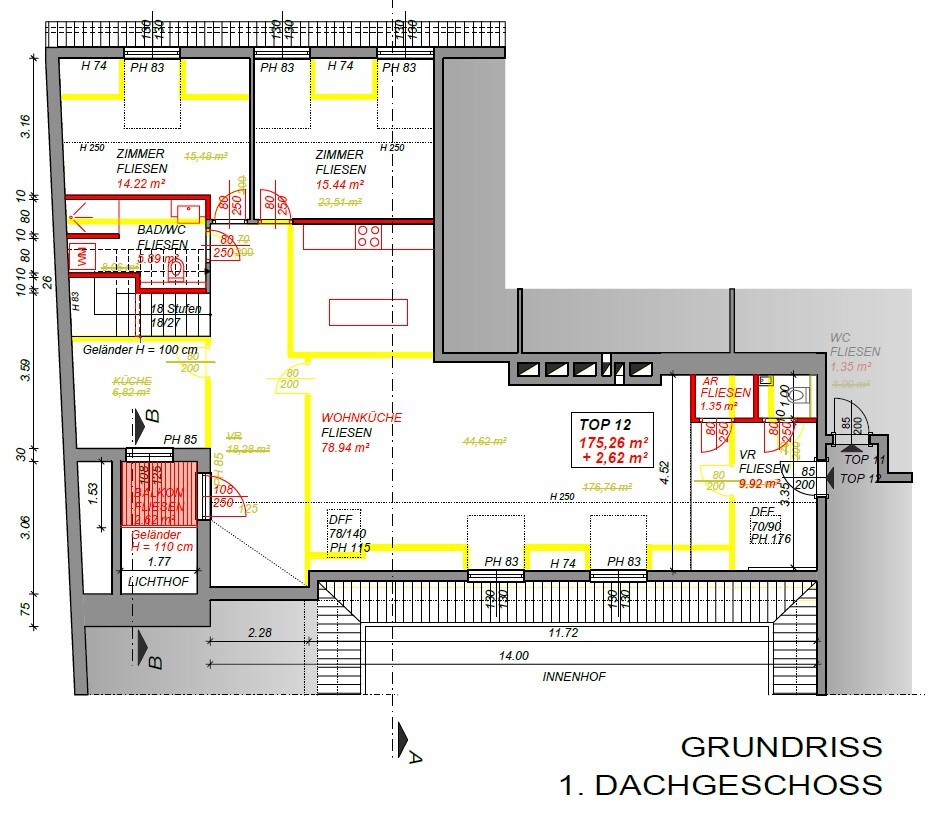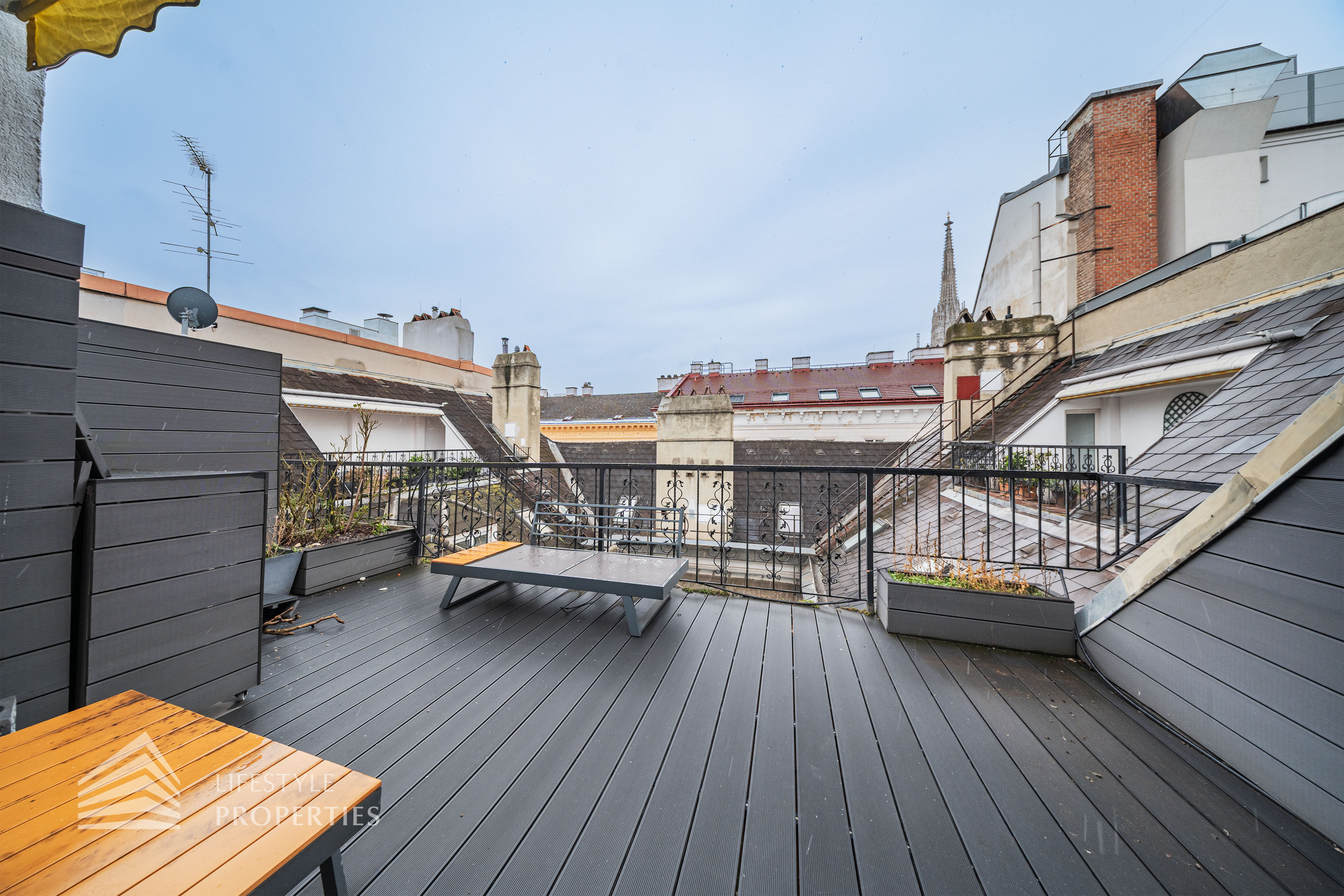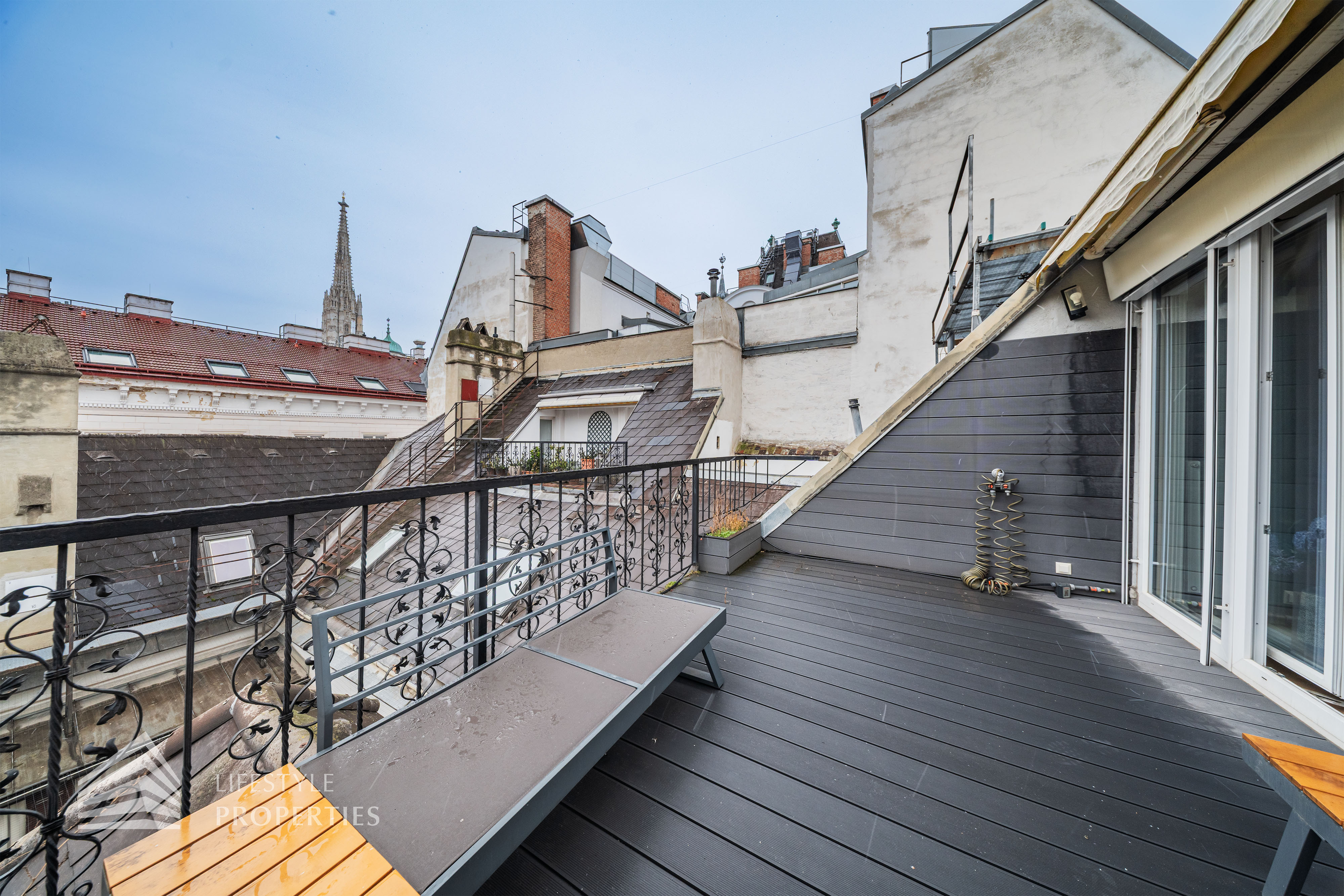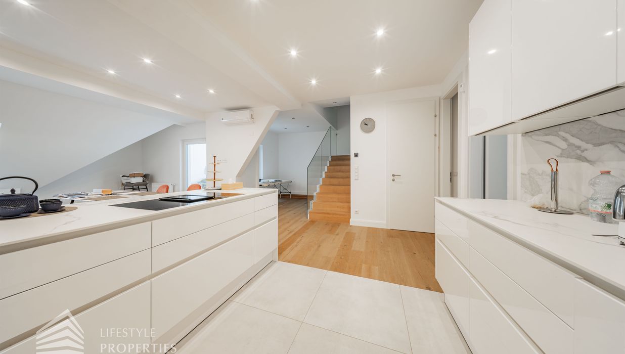 Bei Betreten der Wohnung gelangen Sie in den Vorraum, welcher sich direkt in die großzügige ca. 79 m² große Wohnküche öffnet. Diese verbindet alle Räume des Geschosses miteinander. Rechterhand erreichen Sie ein ca. 14 und ein ca. 15 m² großes Zimmer. Das mit einer Dusche, einem Waschtisch und einer Toilette ausgestattete Badezimmer befindet sich ebenfalls auf der rechten Seite. Rechts neben der Eingangstüre befindet sich ein Abstellraum sowie ein Gäste WC. Über die Wohnküche gelangen Sie auf den charmanten Balkon sowie über die Treppe ins obere Geschoss. Hier erwartet Sie das Master Bedroom mit einer Größe von ca. 36 m² und einem ca. 13 m² großen en suite Badezimmer, welches mit einer Badewanne, Dusche und einer Toilette ausgestattet ist. Über das Schlafzimmer gelangen Sie zum Highlight der Wohnung, der ca. 17 m² großen Terrasse. Eine einzigartige Rückzugsoase mitten in der Stadt mit Blick auf den Stephansdom.
