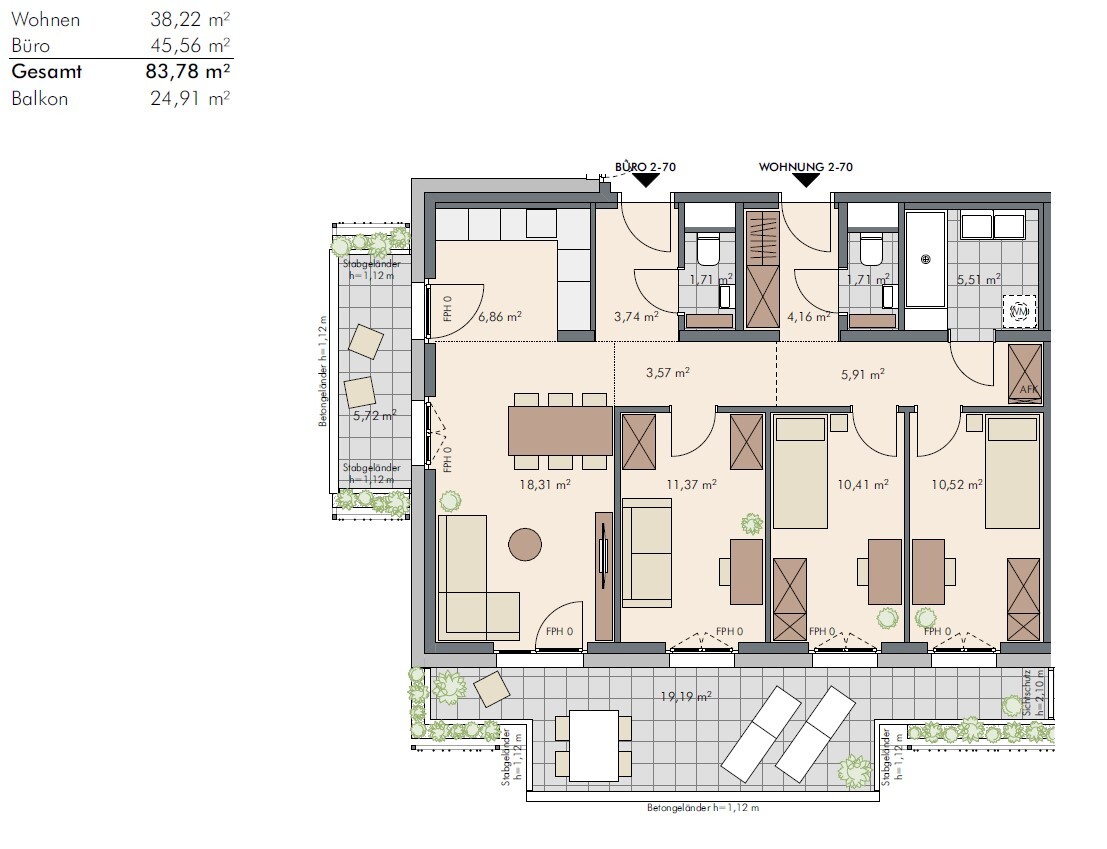 Das Projekt bietet durchdachte Grundrisse mit privaten Freiflächen wie Balkonen, Terrassen, Dachterrassen oder Eigengärten – je nach Wohnungstyp. Außerdem stehen 100 PKW-Stellplätze in einer hauseigenen Tiefgarage zur Verfügung. Ergänzend zur klassischen Wohnnutzung entstehen sogenannte WohnPlus-Apartments, die über einen eigenen Eingang verfügen und sich flexibel als Homeoffice, Gästebereich oder separater Arbeitsraum nutzen lassen.