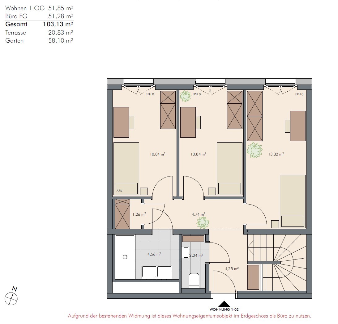 Beim Betreten der Wohnung gelangen Sie in den ca. 4,8 m² großen Vorraum. Links befindet sich das Badezimmer mit einer Fläche von 5,93 m². Auf der rechten Seite führt eine Treppe in das Obergeschoss. Gehen Sie vom Vorraum geradeaus weiter, öffnet sich der großzügige Wohn- und Küchenbereich, welcher direkten Zugang zu einer rund 20,83 m² großen Terrasse und dem daran anschließenden Garten mit etwa 58,10 m² bietet. Angrenzend an die Wohnküche befindet sich ein weiteres Zimmer, das sich besonders gut als Büro oder Gästezimmer eignet. Auch dieses Zimmer verfügt über einen direkten Ausgang in den Garten.