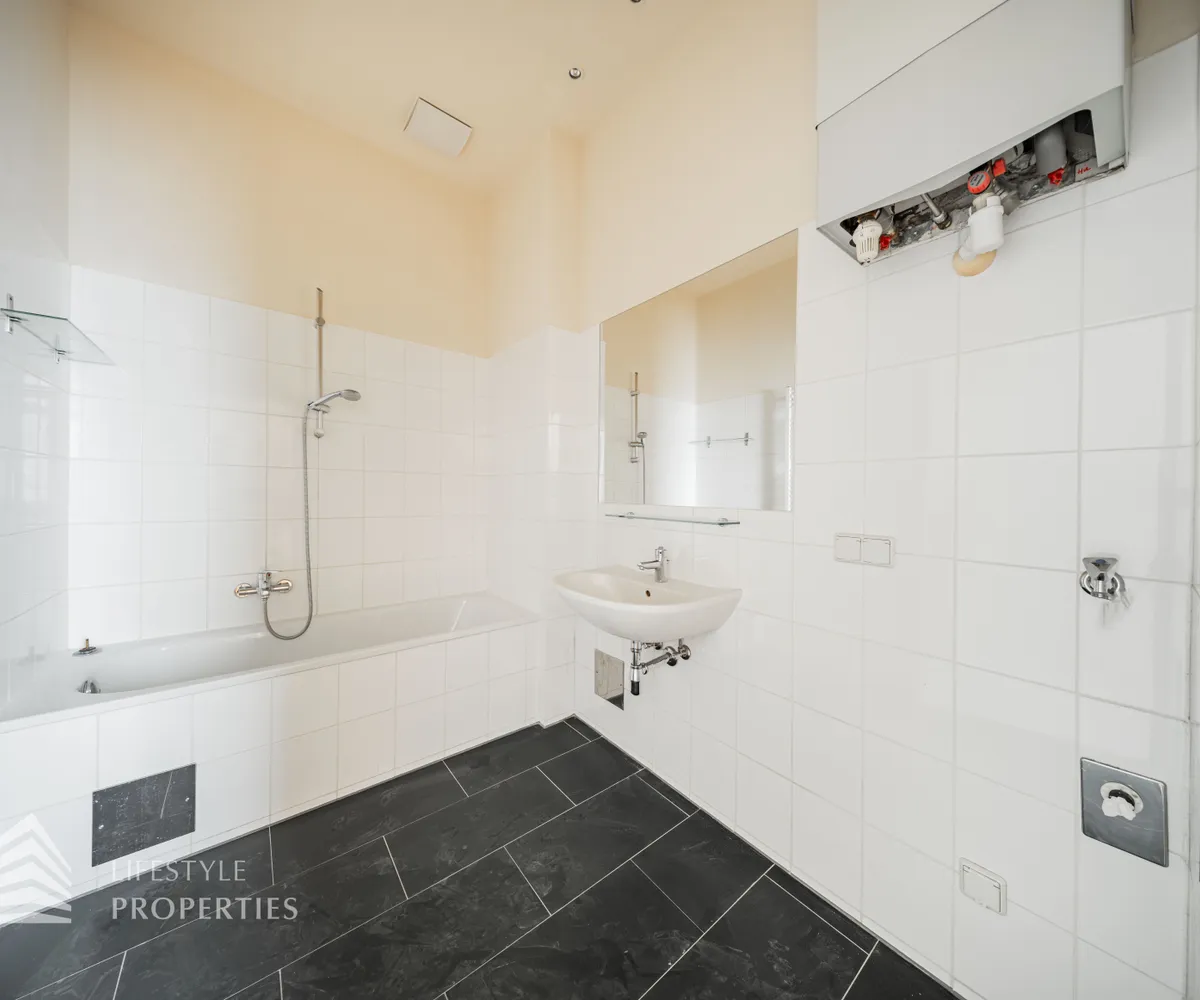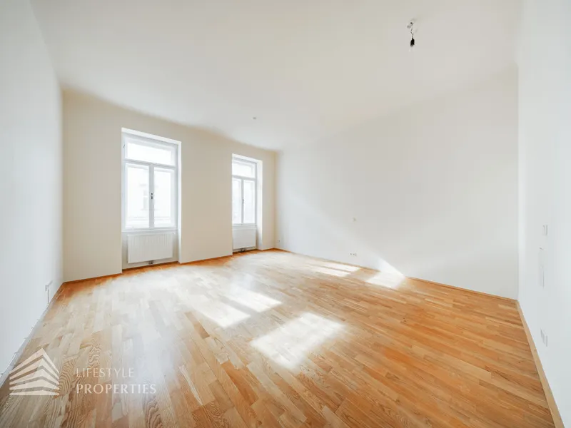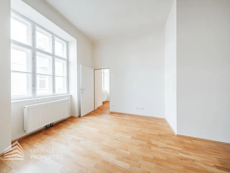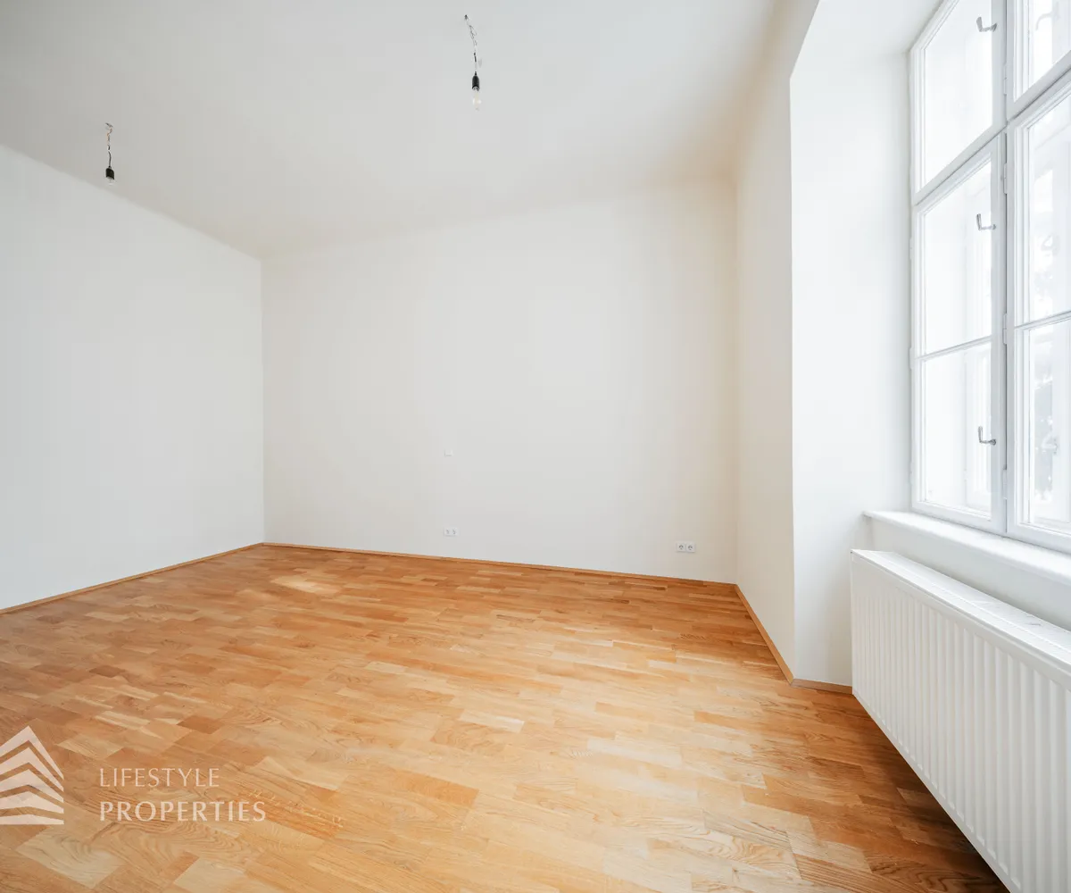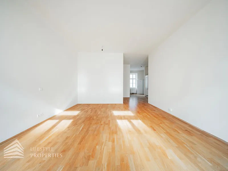 Beim Betreten der Wohnung gelangt man in den ca. 6 m² großen Vorraum, von dem aus das separate WC (ca. 2 m²) mit Fenster, das ca. 5 m² große Badezimmer mit Badewanne und Waschmaschinenanschluss sowie die großzügige Wohnküche direkt erreichbar sind. Die loftartige Wohnküche erstreckt sich über ca. 41 m² und ist sowohl hofseitig als auch straßenseitig in die verkehrsberuhigte, helle Hainburger Straße ausgerichtet. Dank der offenen Gestaltung wirkt der Raum besonders weitläufig und einladend. Die hochwertig ausgestattete Küchenzeile fügt sich harmonisch in den Wohnbereich ein und bietet viel Platz für geselliges Kochen und gemütliches Beisammensein. Das ca. 17 m² große Schlafzimmer, das über die Wohnküche zugänglich ist, bietet mit seiner ruhigen, nordöstlichen Ausrichtung in den Innenhof eine ideale Rückzugsmöglichkeit. Hier lassen sich mühelos ein komfortables Kingsize-Bett, ein großer Einbauschrank oder sogar eine Home-Office-Ecke unterbringen.