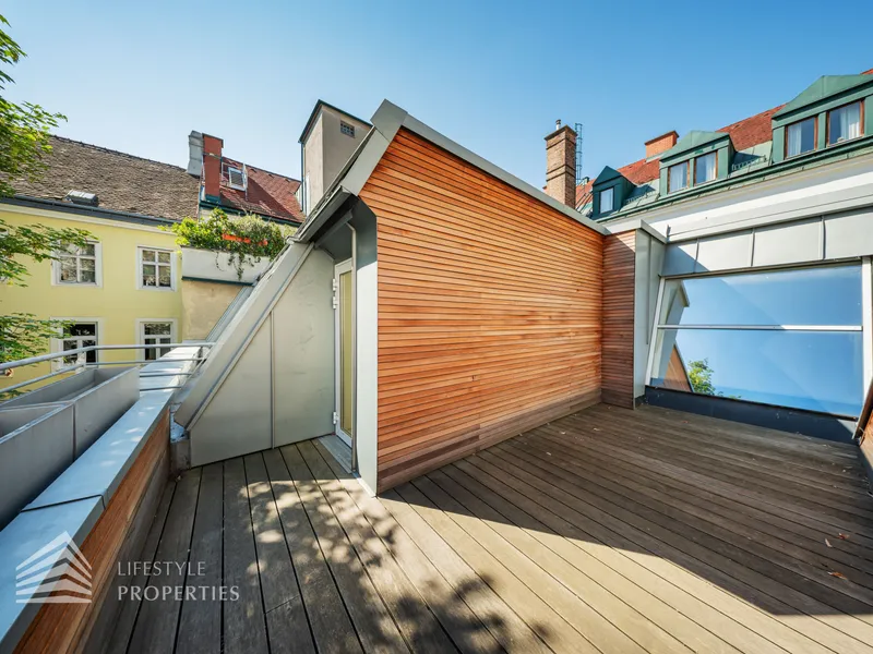 Geradeaus von der Treppe betritt man die ca. 18 m² große Terrasse, diese an lauen Abenden zum Verweilen oder zum Sonnentanken einlädt. Die Terrasse ist mit edlen Holzdielen ausgelegt sowie verkleidet und verfügt über einen Wasseranschluss.