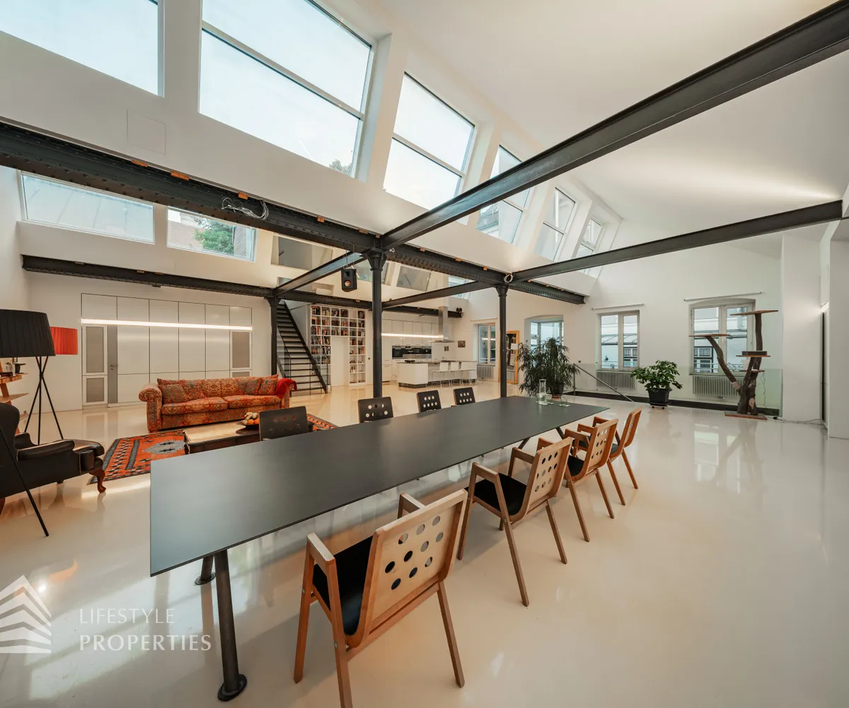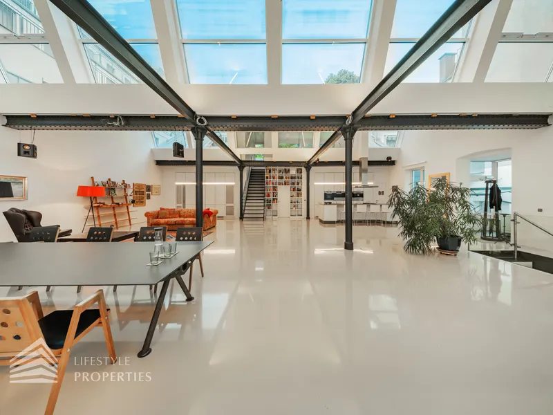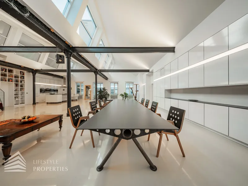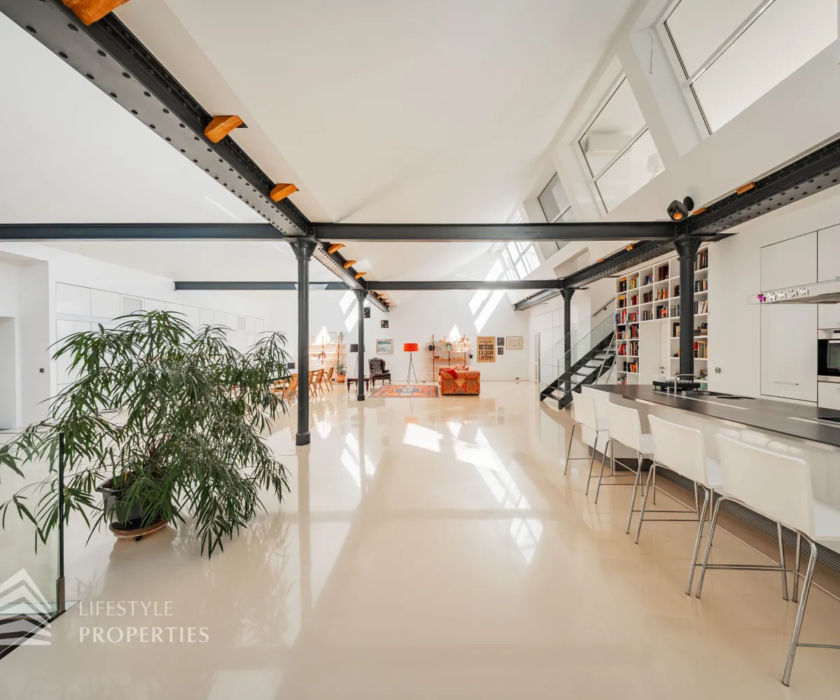 Zum Verkauf gelangt eine einzigartige 5-Zimmer Loftwohnung mit Terrasse und Werkstatt. Link vom