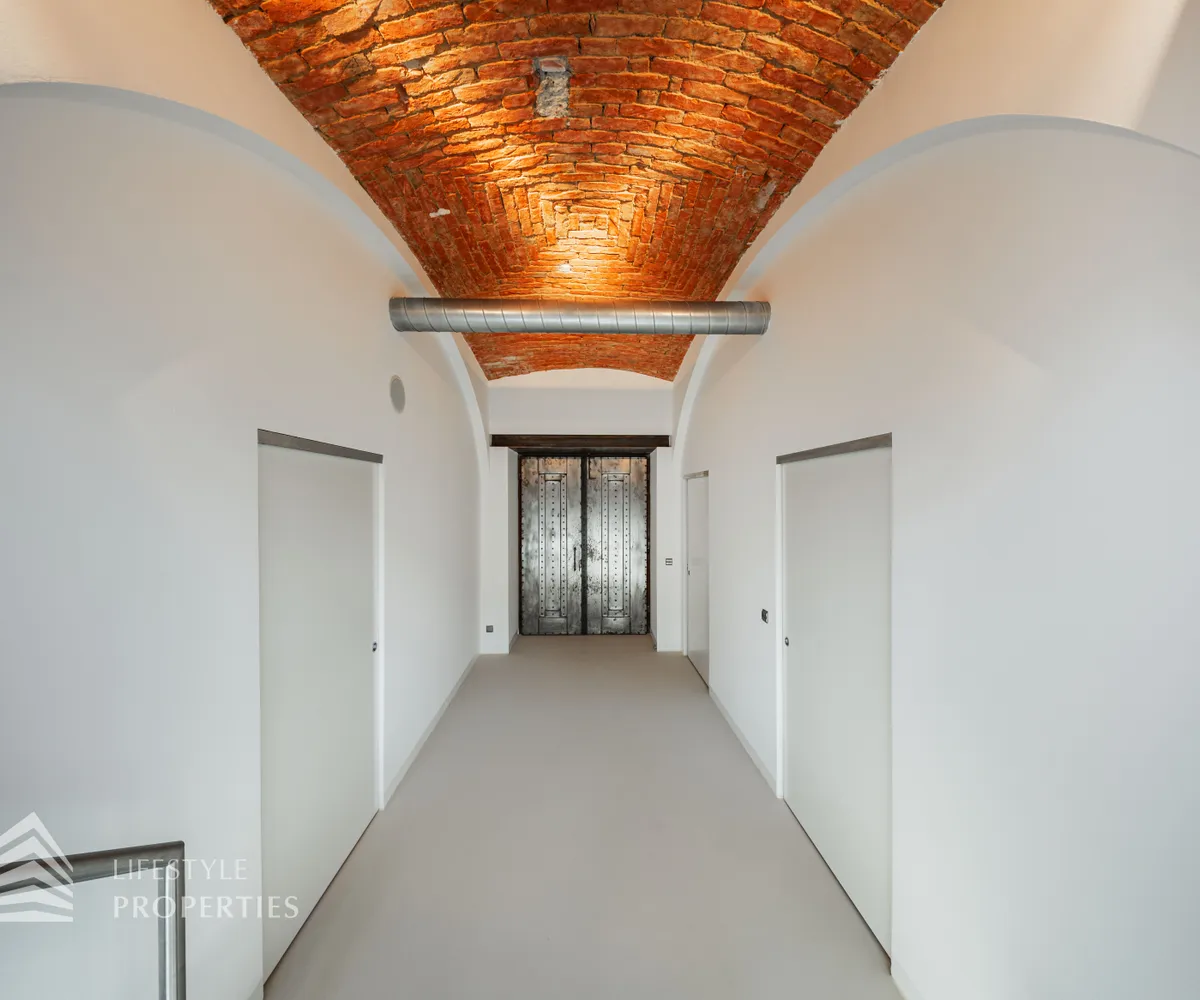Am Ende des Ganges gelangt man durch eine beeindruckende Doppelflügeltüre aus Eisen in die ca. 56 m² große Werkstatt, diese sich auch als Galerie eignet und zusätzlich über ein elektrisches Rolltor verfügt.