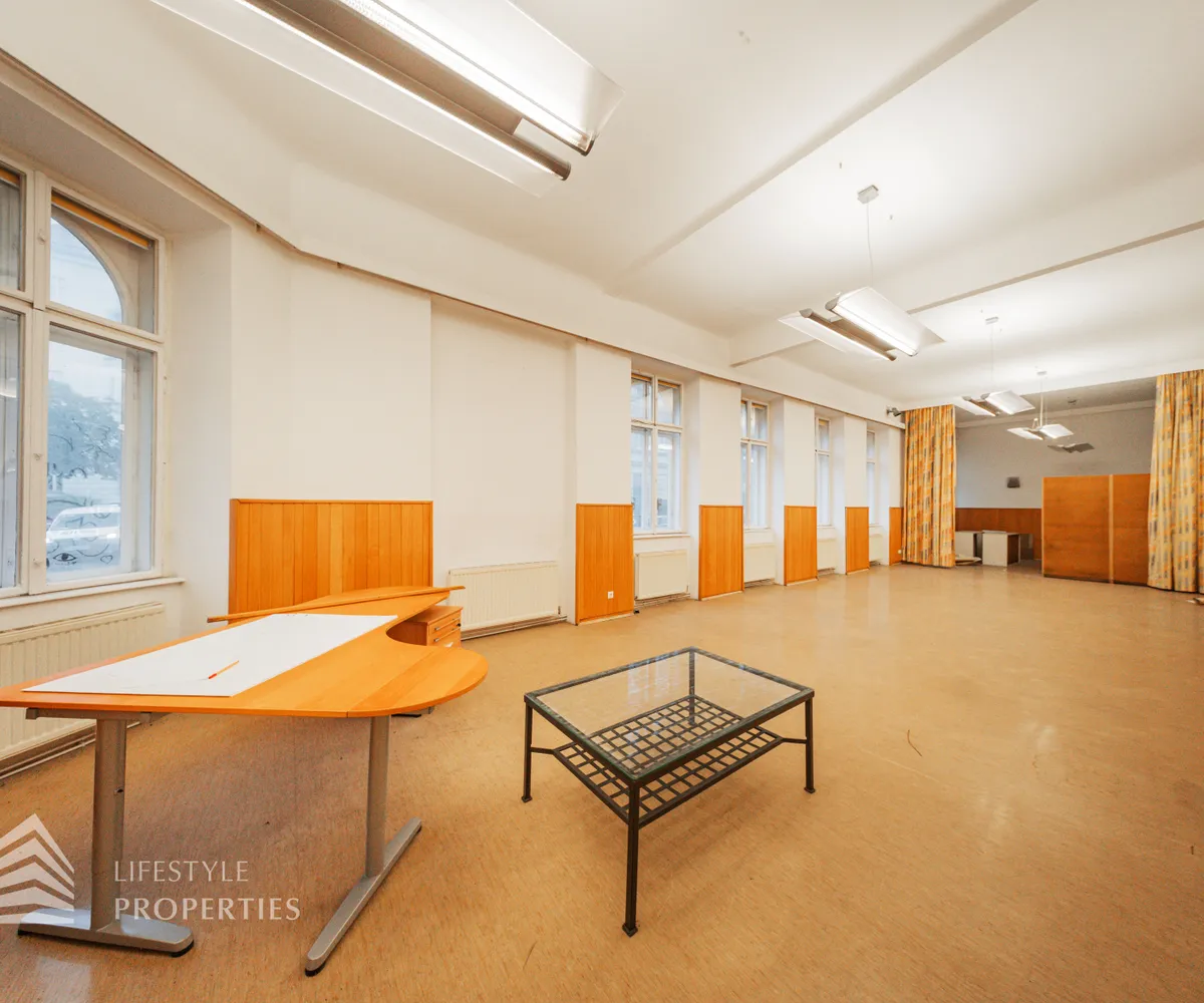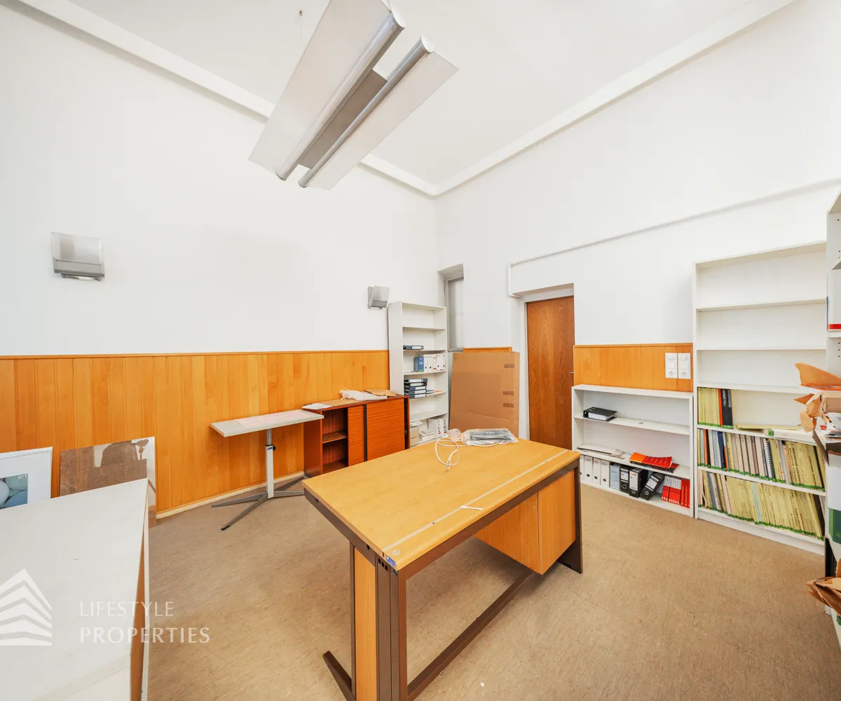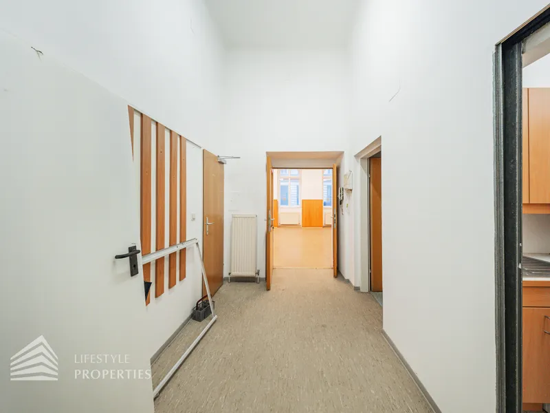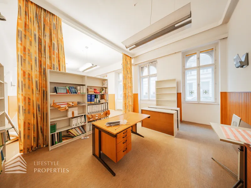 Hierbei handelt es sich um eine ca. 56 m² große unrenovierte Altbaufläche, welche in eine Wohnung umgebaut werden kann. Hierzu gibt es bereits eine Entwurfsplanung (siehe Anhang) und die ursprüngliche Bürofläche wurde zwischenzeitlich bereits zu Wohnzwecken umgewidmet. Die leicht über dem Erdgeschoß gelegen Fläche verfügt über hohe Räume sowie große Fensterflächen und garantieren eine gute Belichtung. Der Eigentümer würde die Abtrennung übernehmen. Es wäre auch möglich, die Wohnung durch den Eigentümer nach eigenen Wünschen gestalten zu lassen, der Preis würde sich dann je nach Abmachung verändern.