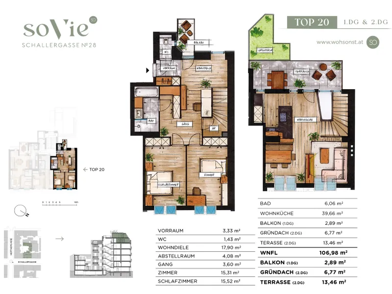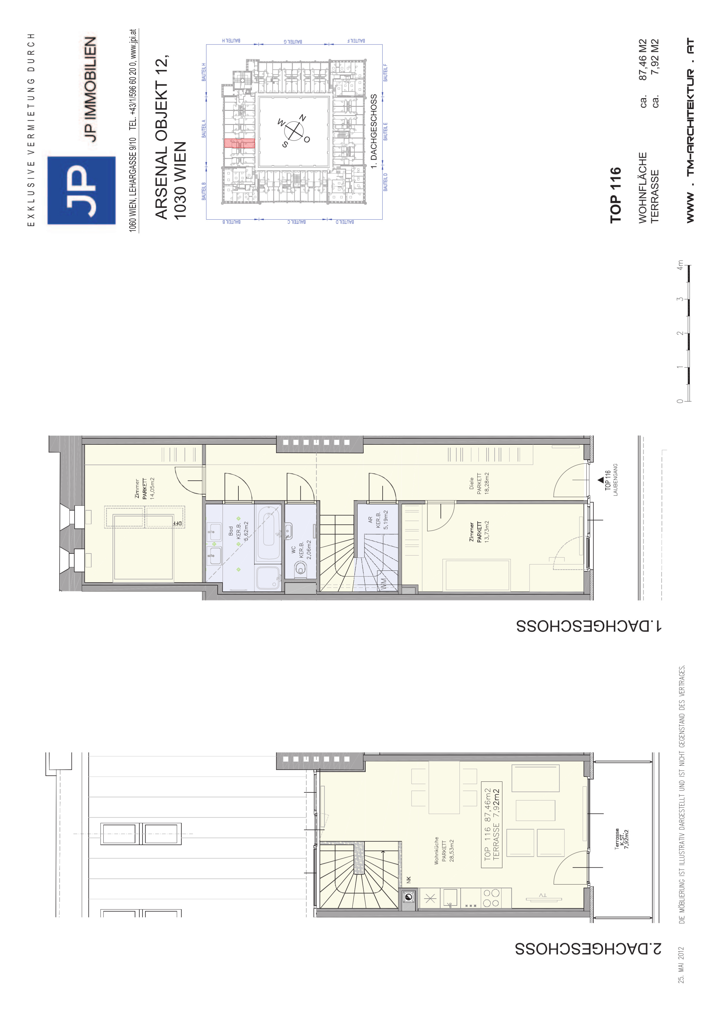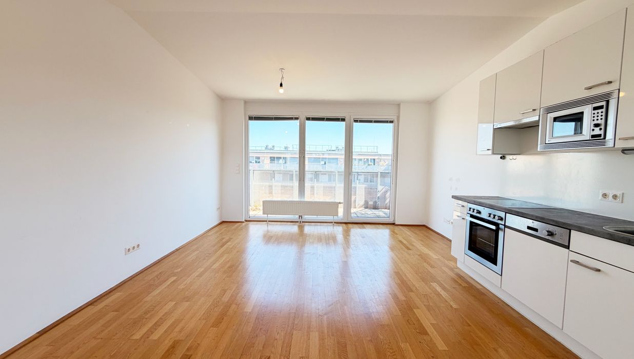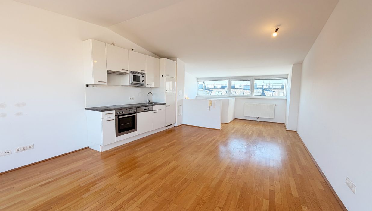 Die Wohnung befindet sich im 1. Dachgeschoss und verfügt über eine großzügige Wohnküche mit direktem Zugang auf die Terrasse, zwei getrennt begehbare Schlafzimmer, ein Badezimmer mit Badewanne, Dusch und Doppelwaschbecken, ein separates WC, einen Abstellraum mit Waschmaschineanschluss, sowie einen großzügigen Vorraum.