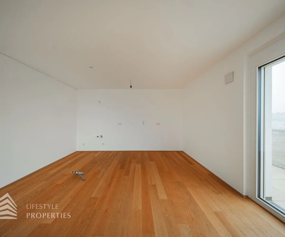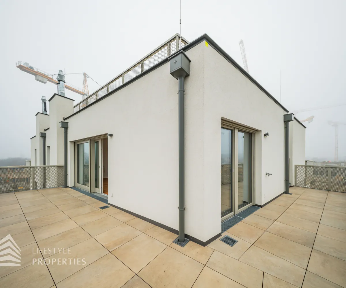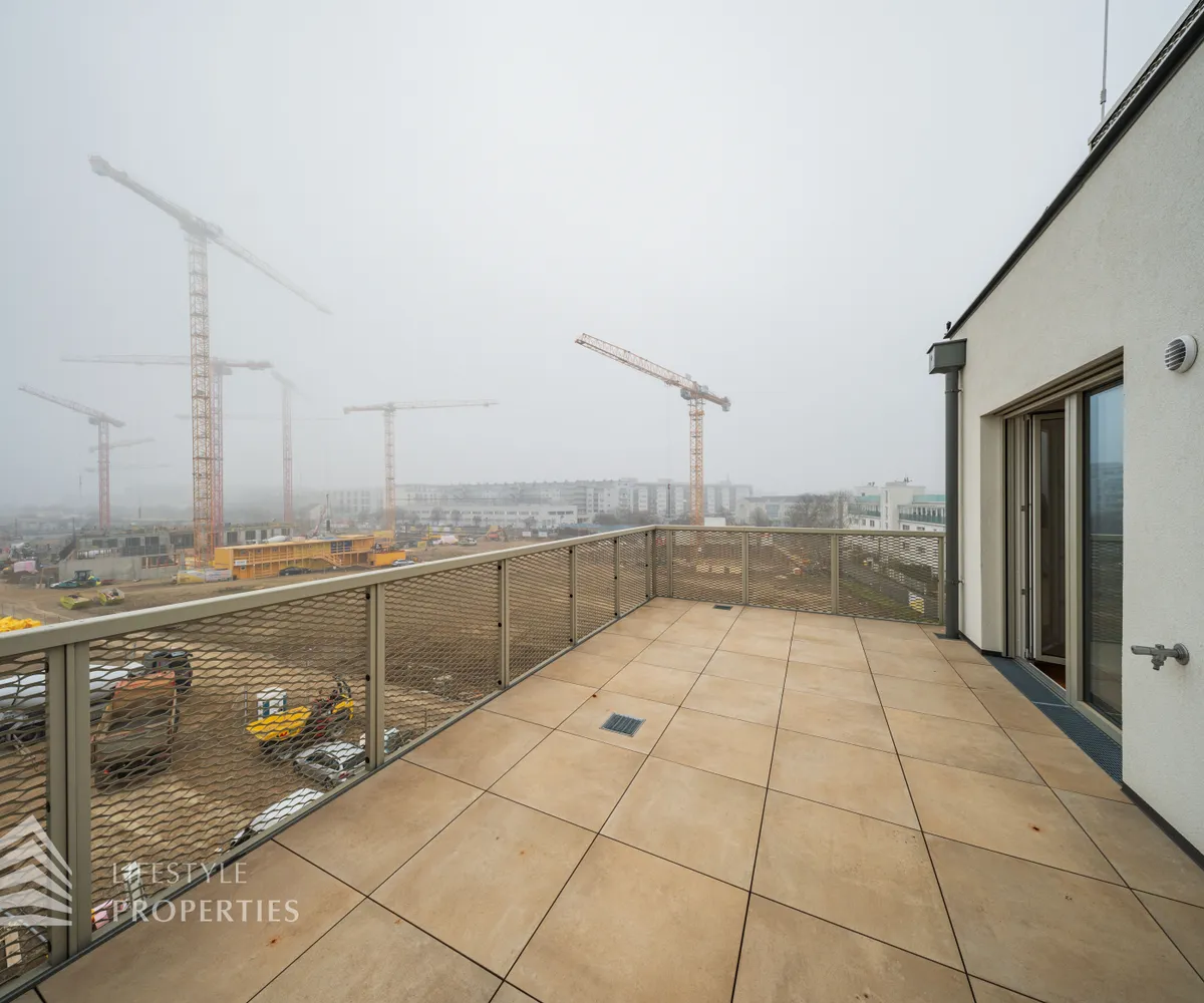 Die Wohnung ist ein Erstbezug, befindet sich im 4. Liftstock und hat eine Größe von ca. 90,54 m² und gliedert sich in eine Wohnküche mit einer schönen, voll ausgestatteten Küche, ein Schlafzimmer, einen Vorraum, ein Bad mit Dusche und Wanne, Waschbecken und ein separates WC. Von der Wohnküche können Sie auf die schöne Terrasse mit dem großen Dachgarten gehen.