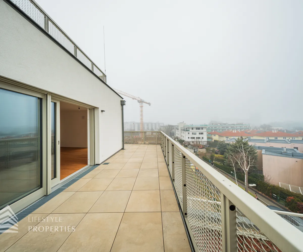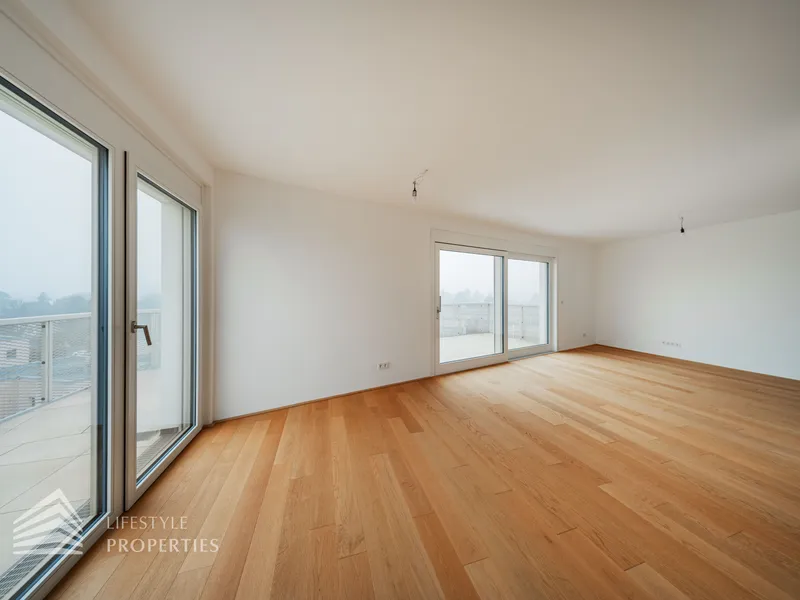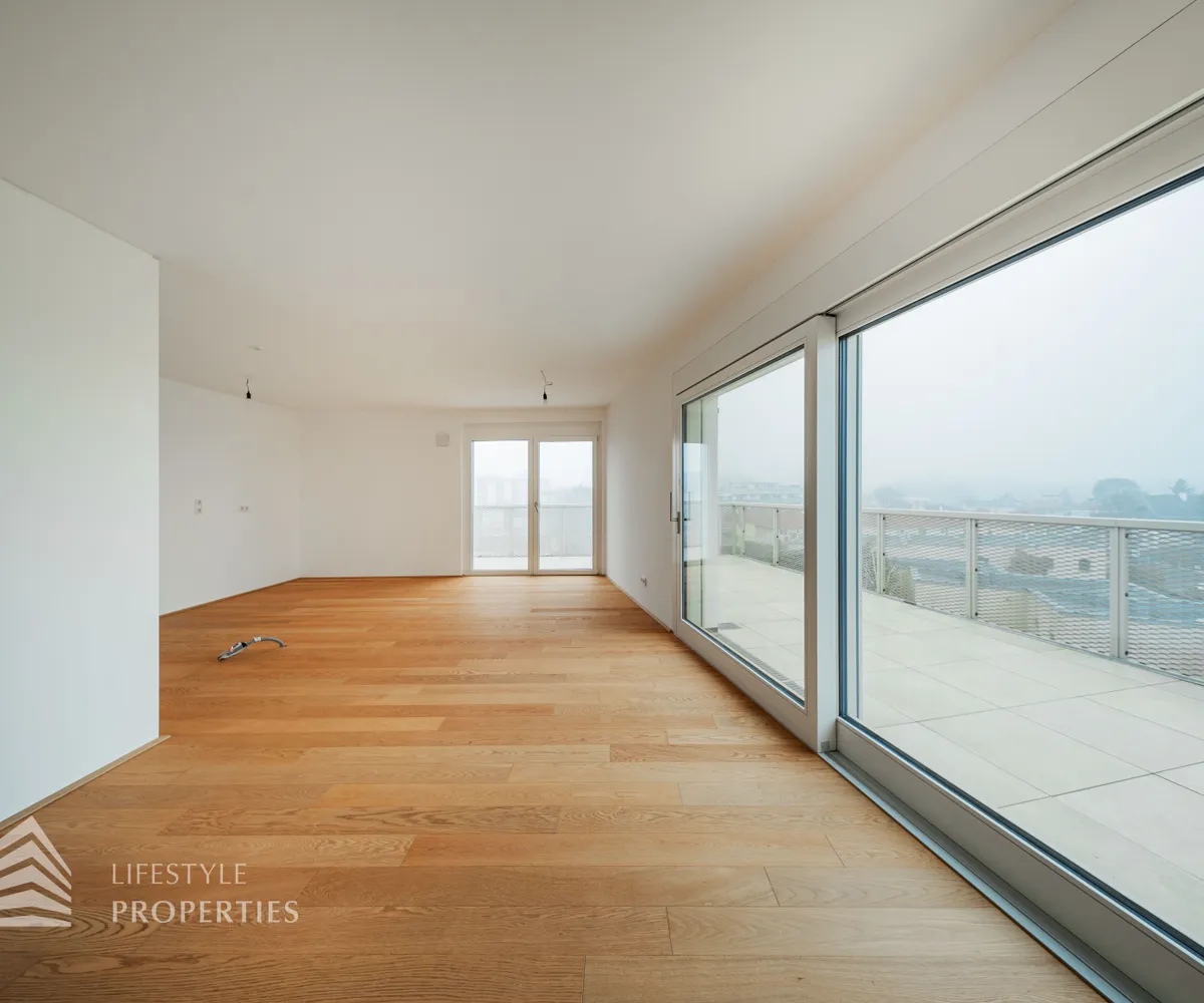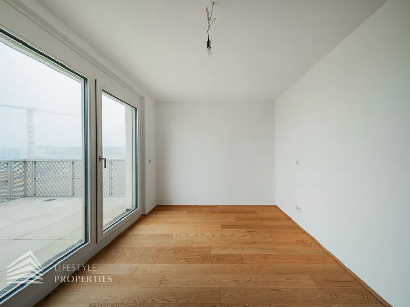Die Wohnung ist ein Erstbezug, befindet sich im 4. Liftstock und hat eine Größe von ca. 90,54 m² und gliedert sich in eine Wohnküche mit einer schönen, voll ausgestatteten Küche, ein Schlafzimmer, einen Vorraum, ein Bad mit Dusche und Wanne, Waschbecken und ein separates WC. Von der Wohnküche können Sie auf die schöne Terrasse mit dem großen Dachgarten gehen.