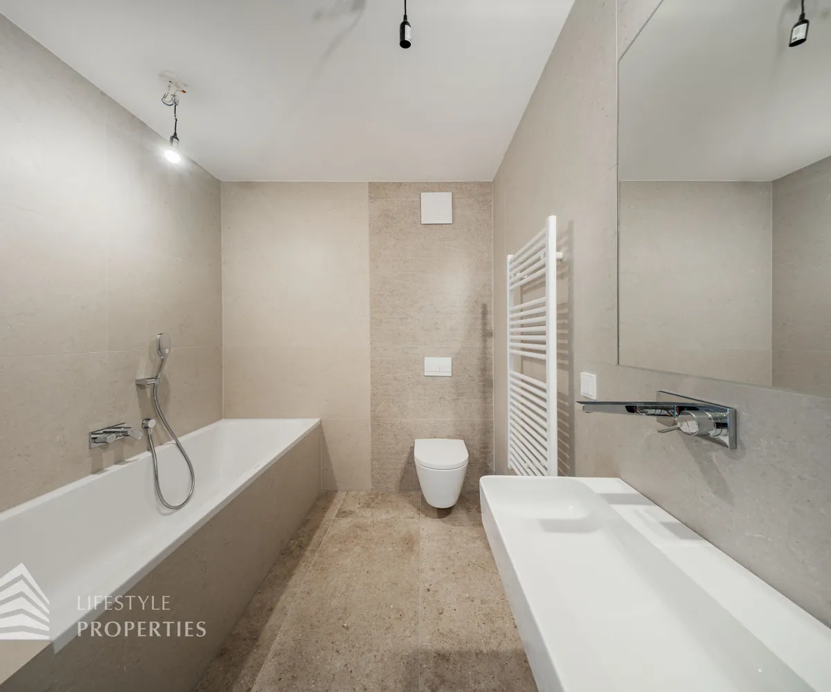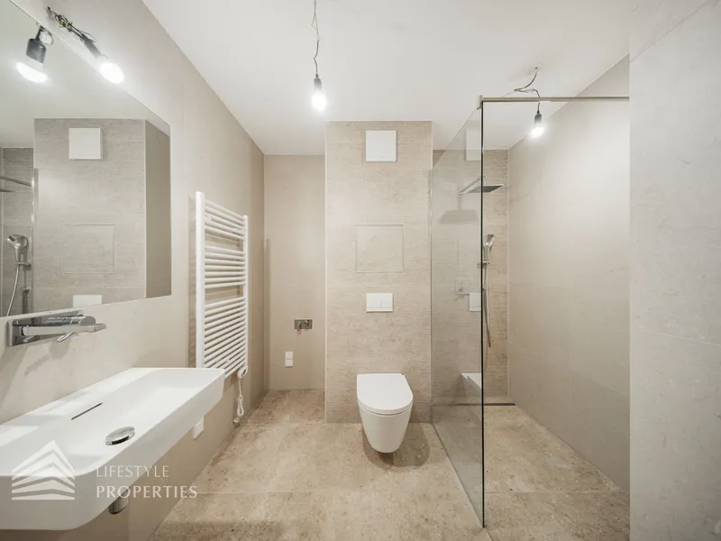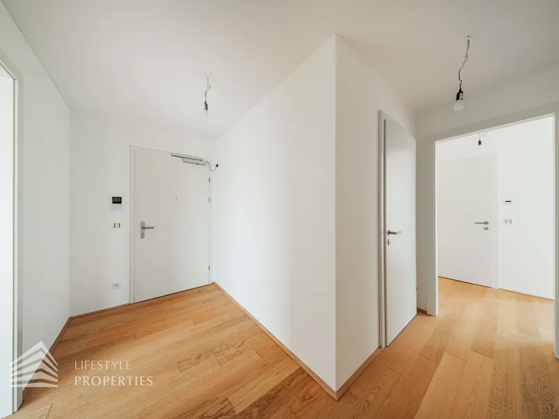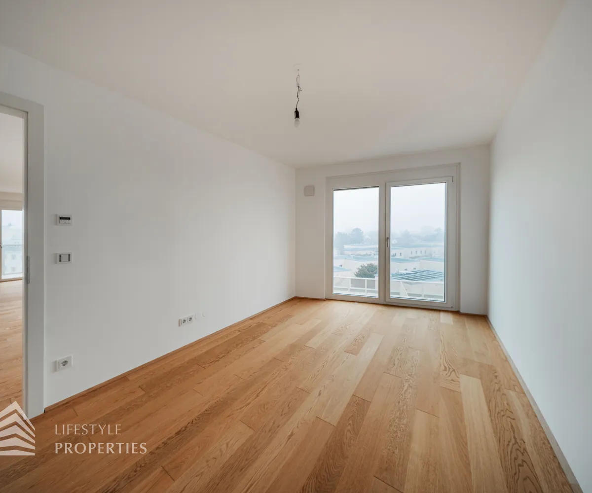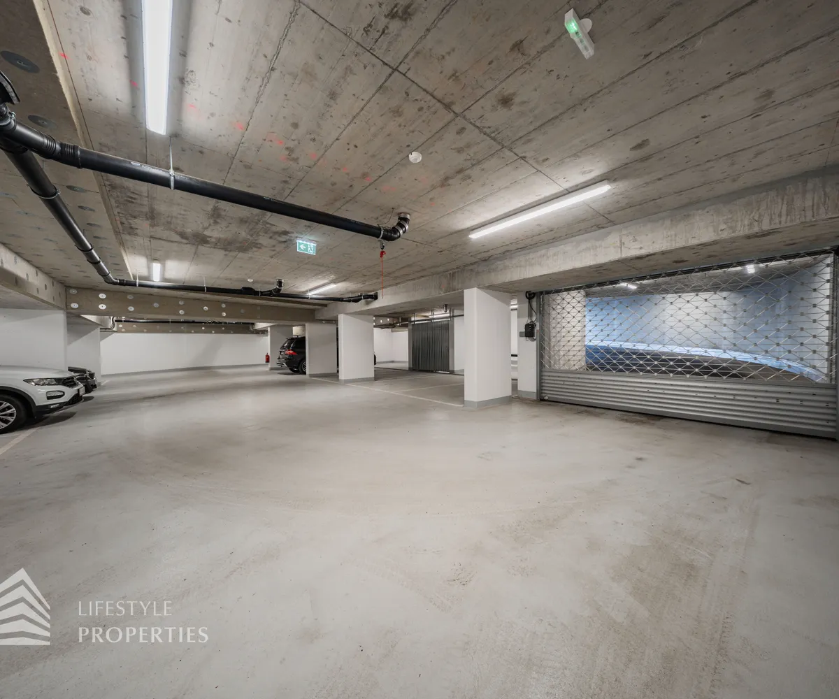 Die Wohnungen werden mittels Fußbodenheizung über eine Luft-Wärmepumpe geheizt, eine Deckenkühlung sorgt in den warmen Monaten für angenehme Temperaturen und Vorrichtungen zum Einbau einer Klimaanlage sind auch vorhanden. Weiters sind elektrisch betriebene Außenjalousien / Raffstores vorhanden. Ein Platz in der hauseigenen Tiefgarage kann zusätzlich erworben werden.