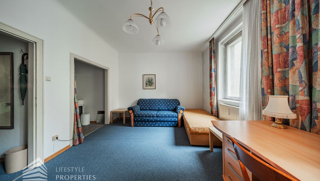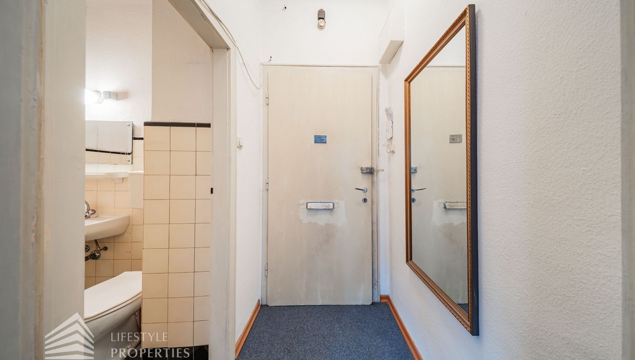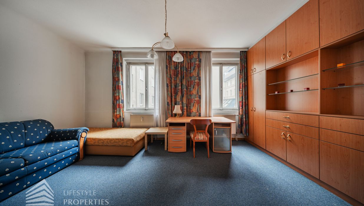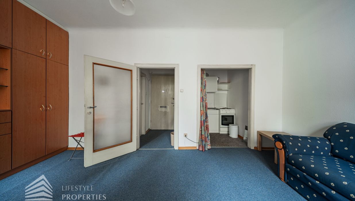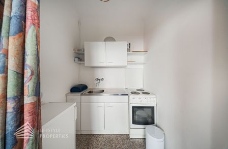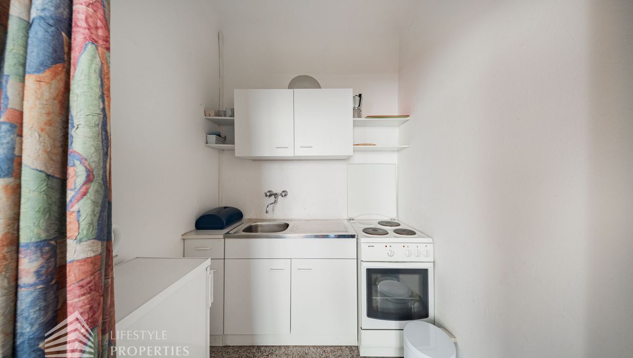 Bei Betreten der Wohnung gelangen Sie in den Vorraum, von welchem Sie rechterhand das Badezimmer betreten können. Dieses ist mit einer Badewanne, einer Toilette, einem Waschbecken und einer Waschmaschine ausgestattet. Gerade durch den Vorraum hindurch erwartet Sie das gemütliche Wohn-/Schlafzimmer. Dieses dient sowohl als gemütlicher Rückzugsort als auch als einladender Wohnbereich. Die separate, voll ausgestattete Küche befindet sich in einer praktischen Nische des Wohnraumes und kann bei Bedarf abgetrennt werden. Ein besonderes Highlight: Die Wohnung ist in den ruhigen Innenhof ausgerichtet, wodurch eine angenehme Ruhe mitten in der Stadt garantiert ist.