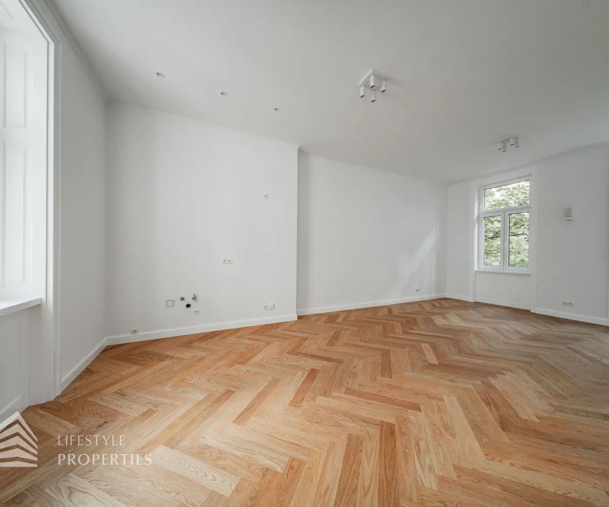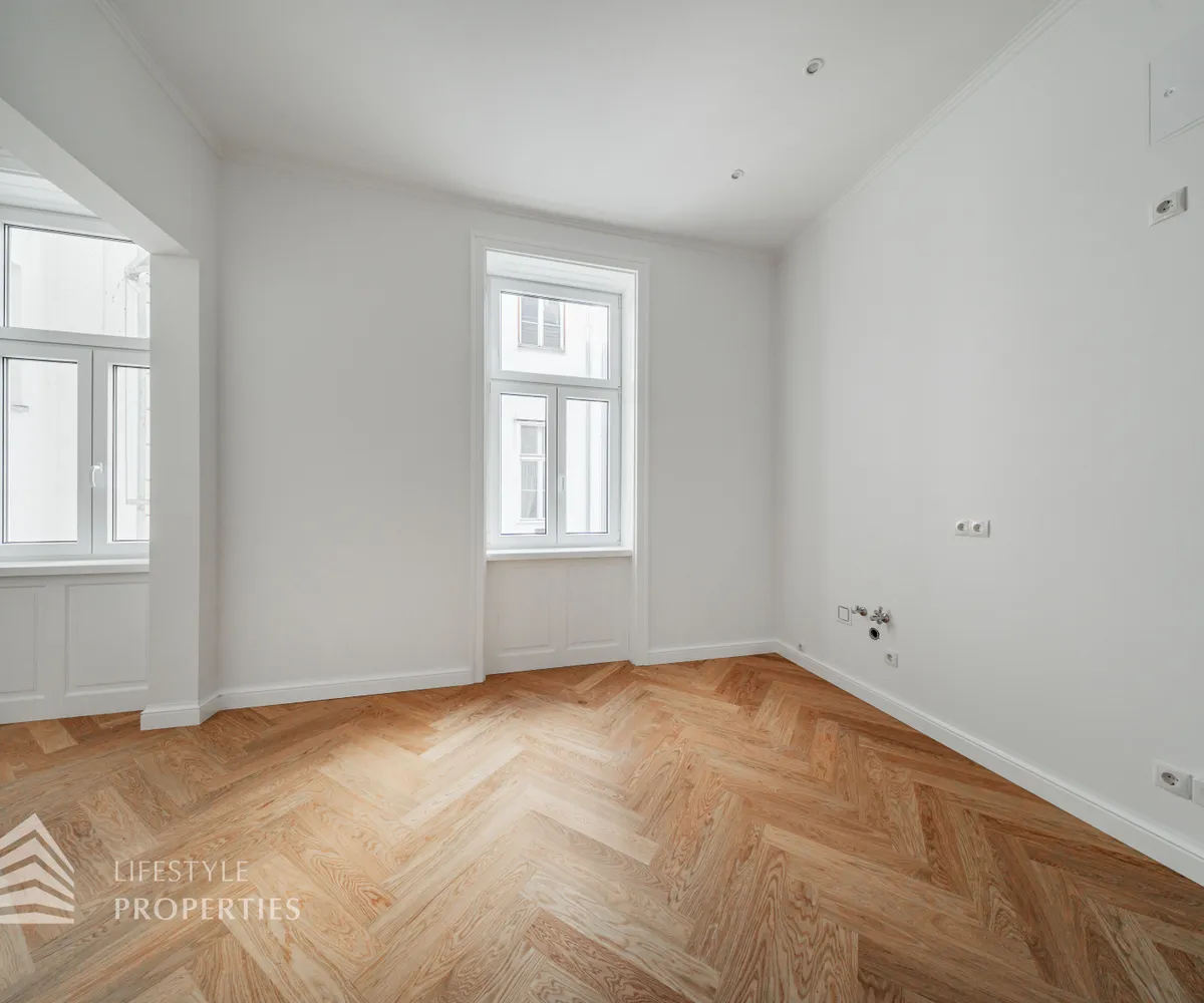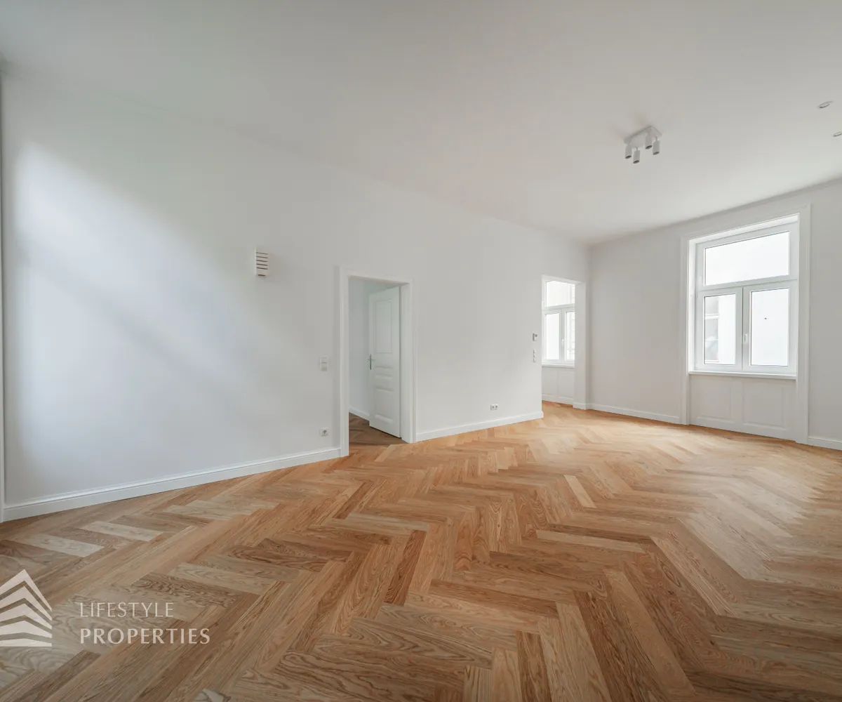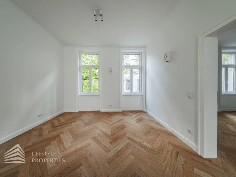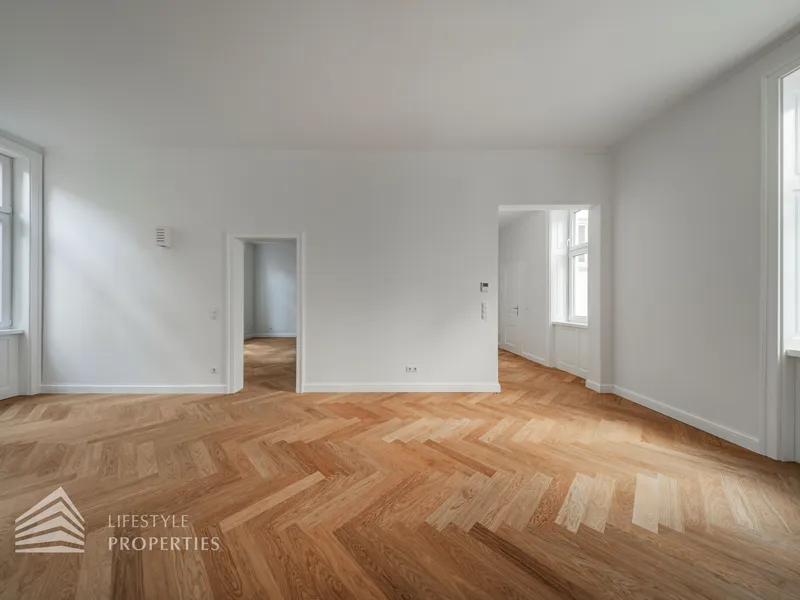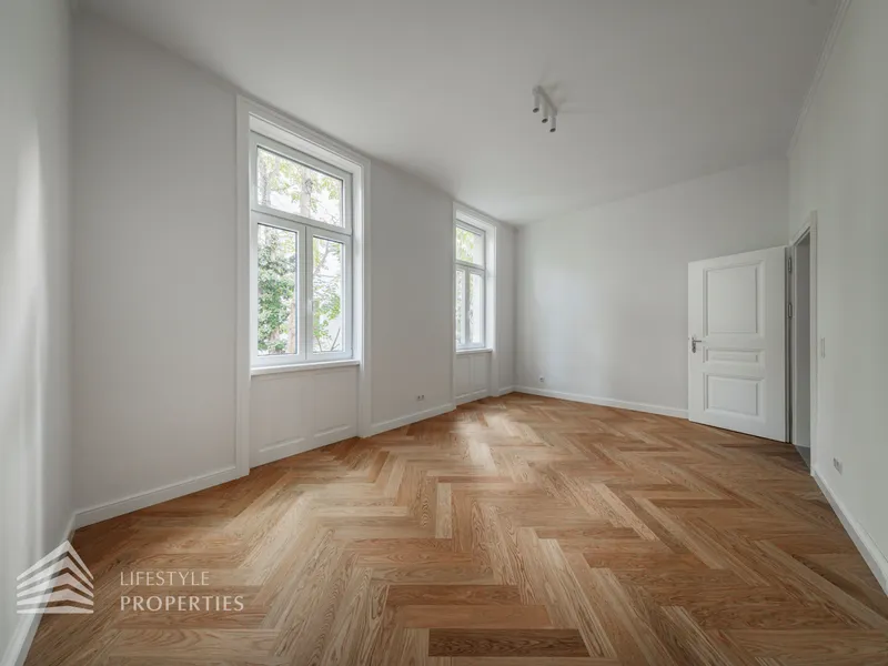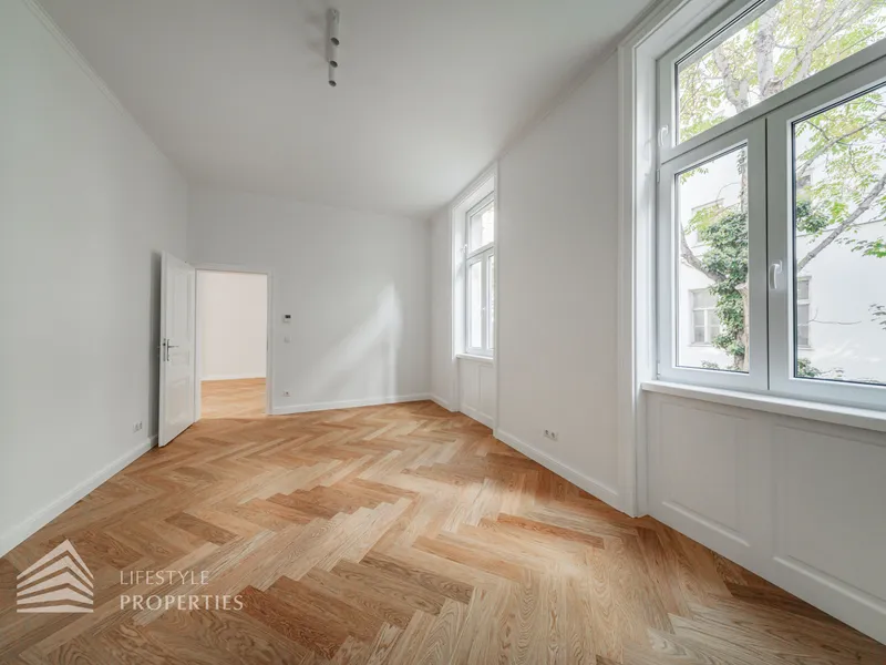 Die Wohnung wird mit aufwendig verlegtem Fischgrät-Eichenparkett und mit stilvollen Kassettentüren ausgestattet. Eleganter Deckenstuck und feine Vertäfelungen unterstreichen den einzigartigen Alt-Wien-Charakter. Traditionelle Holzkastenfenster, die durch moderne Isolierverglasung aufgewertet wurden zieren straßenseitig die Fassade. Die Wärmeversorgung und Warmwasserbereitung erfolgt über Gasetagenheizung. Die Wärmeverteilung in der Wohnung erfolgt mittels Fußbodenheizung.