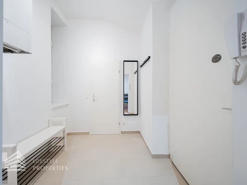 Beim Betreten der Wohnung befinden Sie sich zunächst in dem einladenden Vorraum, von dem aus Sie rechts Zugang zum Badezimmer haben. Auf der linken Seite gelangen Sie in die großzügige Küche, die ausreichend Platz für einen Essbereich bietet. Weiter durch die Küche führt der Weg in den offenen Wohn- und Schlafraum.
