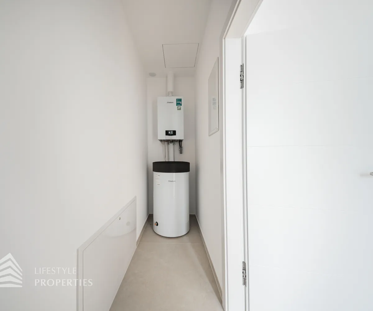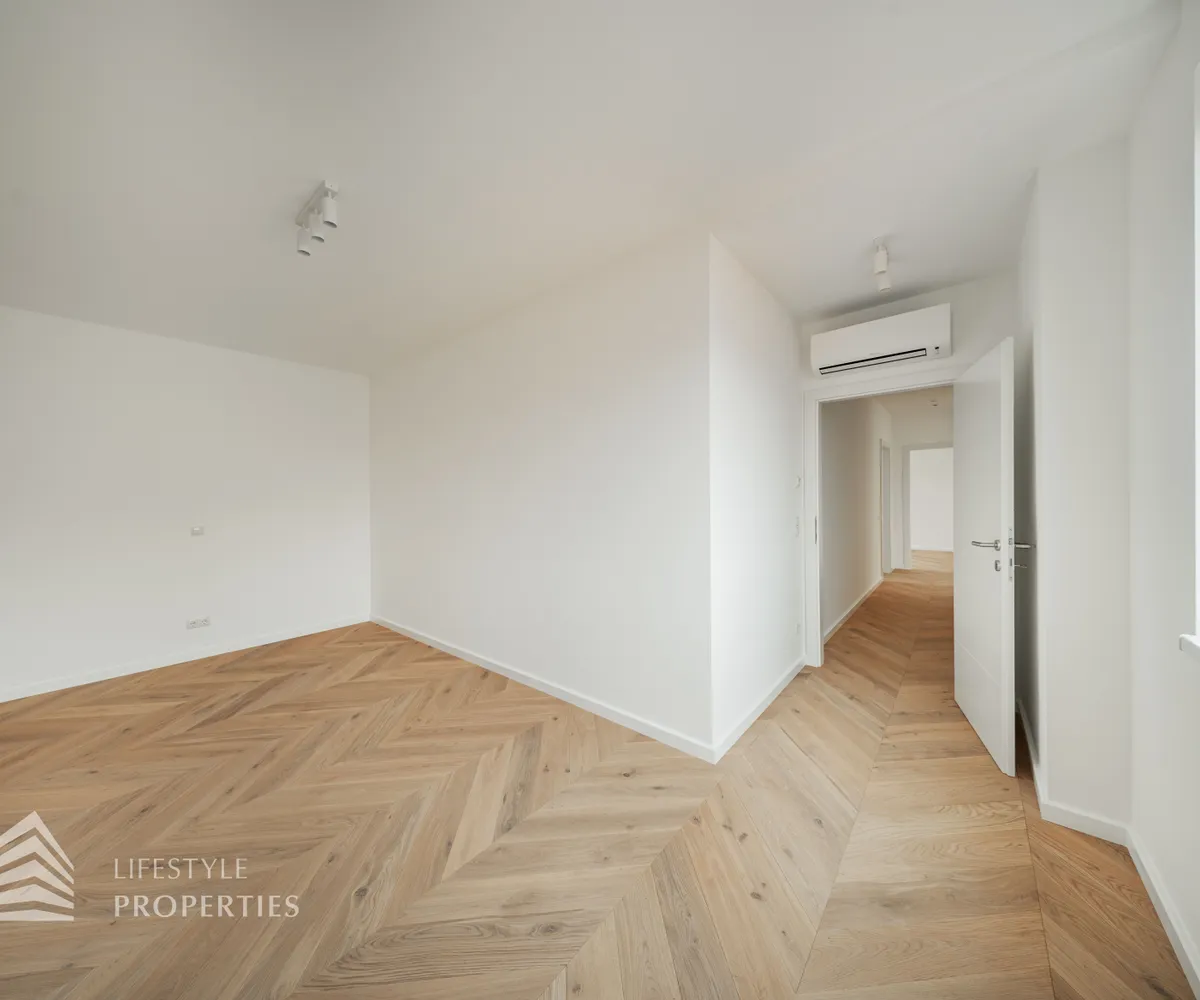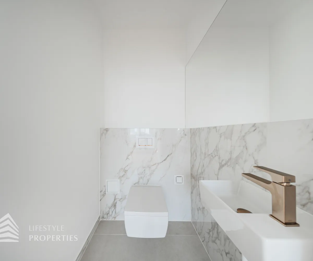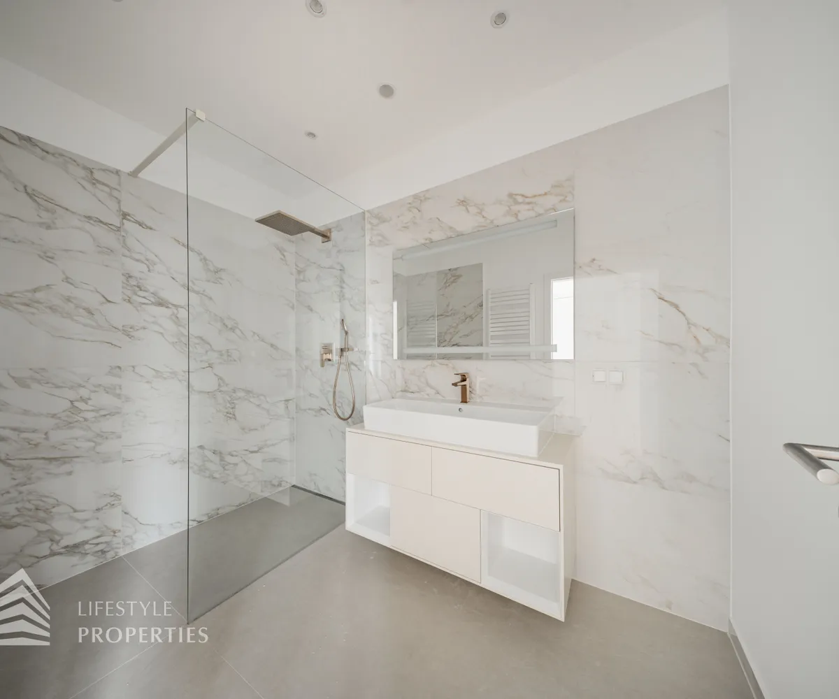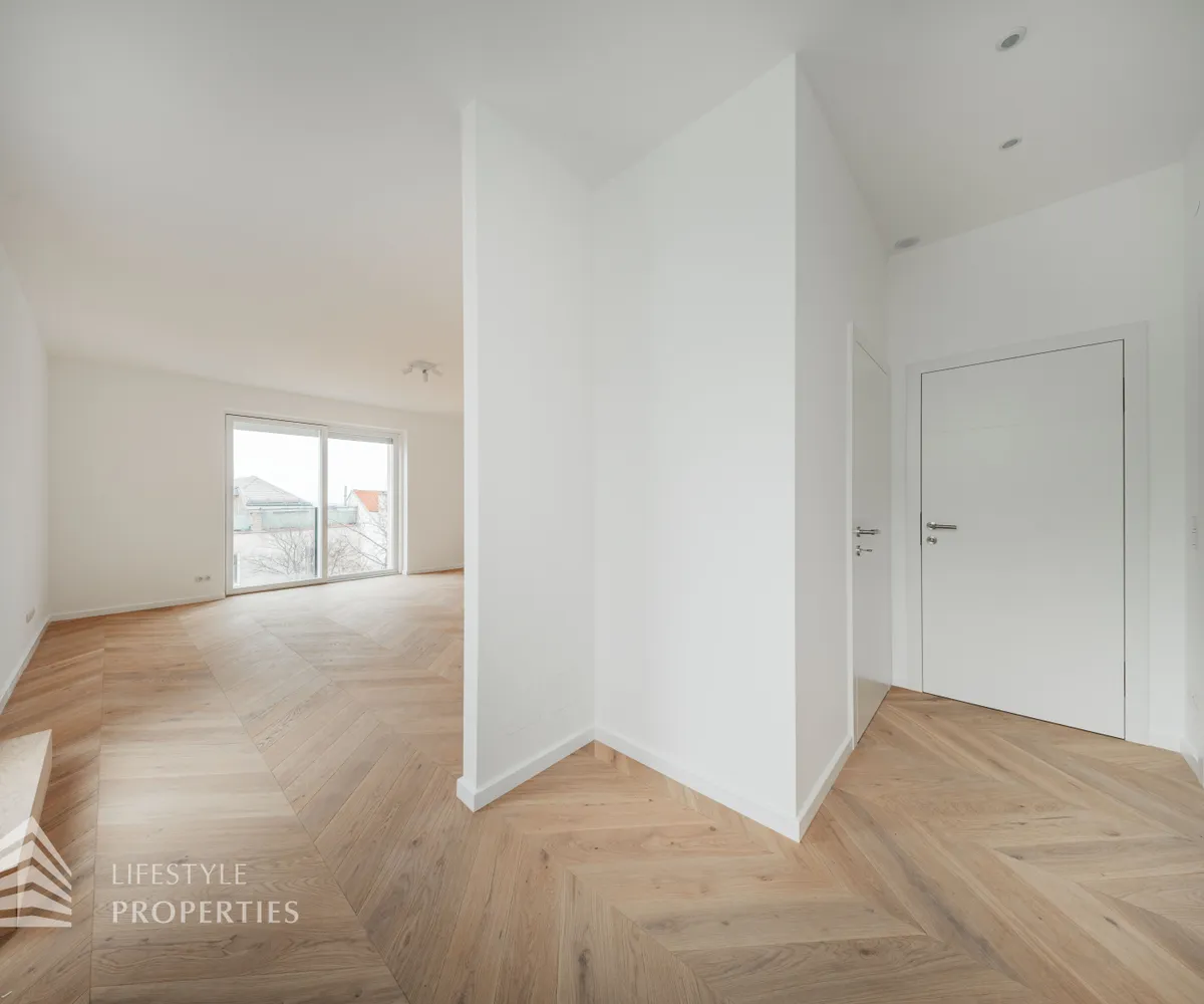 Bei Betreten der Wohnung gelangen Sie in den großen Vorraum, welcher Ihnen genügend Platz für eine Garderobe bietet. Gerade durch gelangen Sie in die große Wohnküche mit Zugang auf die schöne Terrasse. Hier haben Sie ausreichend Platz für’s Familienleben und einen traumhaften Blick. Von der Wohnküche gelangt man in einen Gang, der Zugang zu den drei Zimmern bietet. Eines der Zimmer ist mit einem en-suite Bad mit Dusche und Waschbecken ausgestattet. Die beiden anderen sind getrennt von einander begehbar, des Weiteren gibt es hier einen Abstellraum. Ein zusätzliches Bad mit Wanne und Doppelwaschbecken, sowie das separate WC sind vom Entrée zu begehen. Die beiden Bäder setzen elegante Statements: Design-Armaturen, Regenduschen und ein in die Decke integriertes Musiksystem machen sie zur luxuriös ausgestatteten Wellnessoase. In den einzelnen Räumen gibt es eine Klimaanlage.