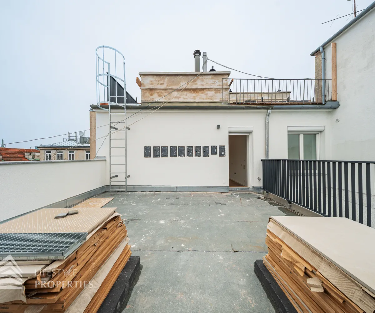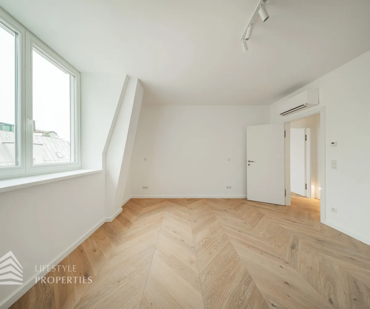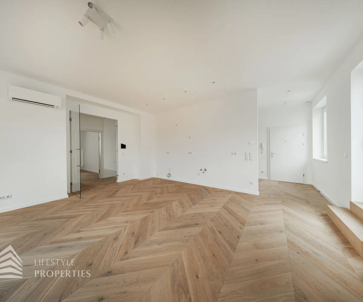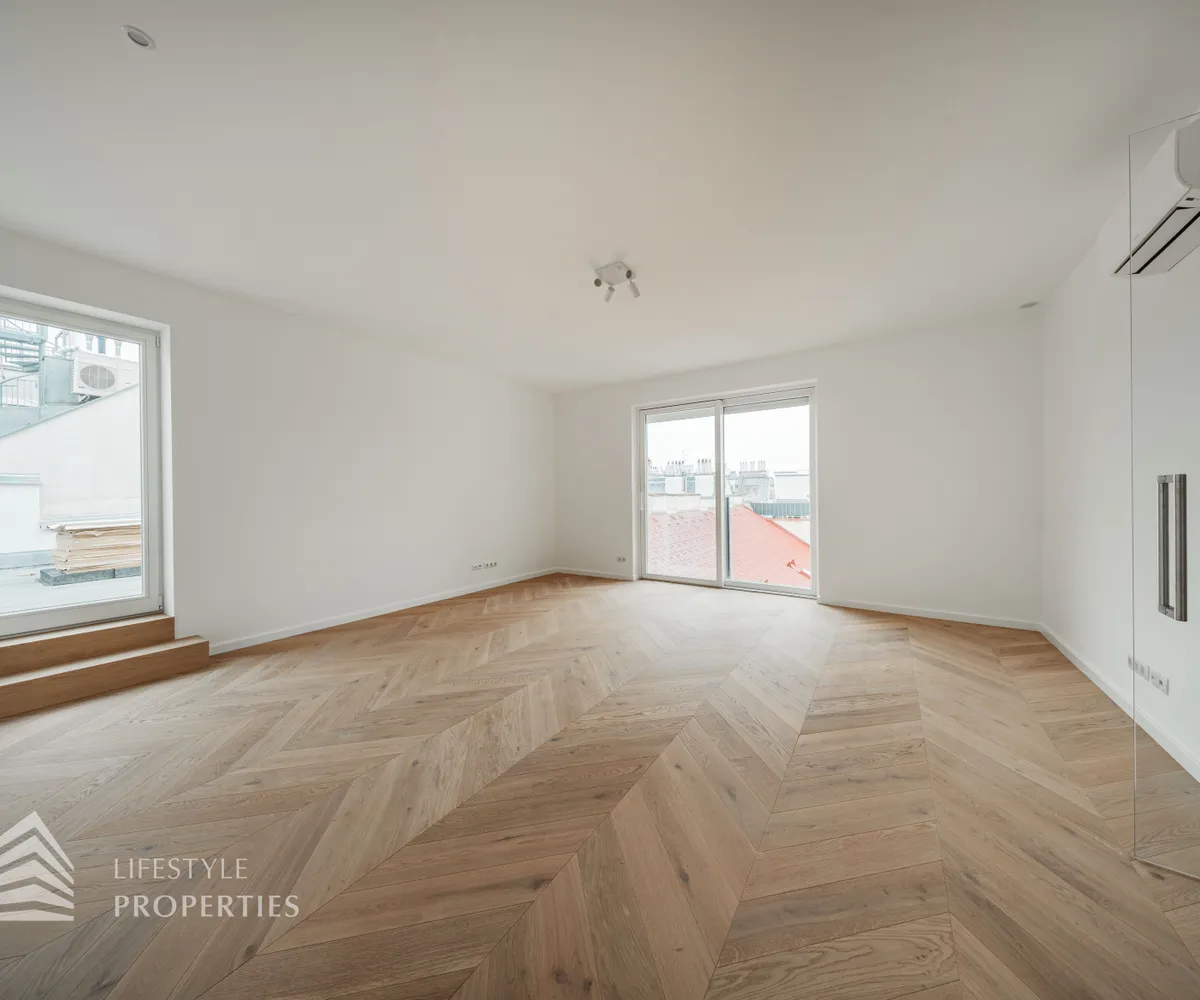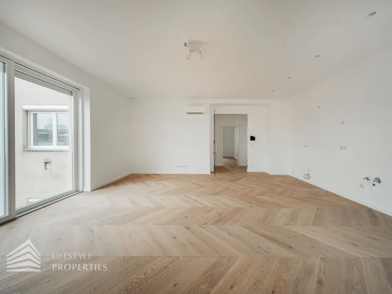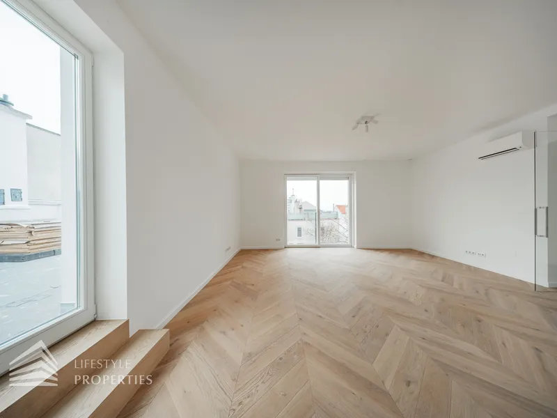Die Wohnung befindet sich im Dachgeschoss eines wunderschönen Altbaus, ist bequem über einen Personenaufzug erreichbar und ist ein Erstbezug. Die Wohnfläche von ca. 124 m² teilt sich in eine große Wohnküche, drei Schlafzimmer, zwei Bäder, einen Abstellraum und ein separates WC auf. Zudem verfügt die Wohnung über eine Terrasse mit insgesamt ca. 26,50 m². Die Wohnung ist mit hochwertigem, französischen Fischgrät-Parkett ausgekleidet, in den Nassräumen sind mit luxuriösen Fliesen verlegt.
