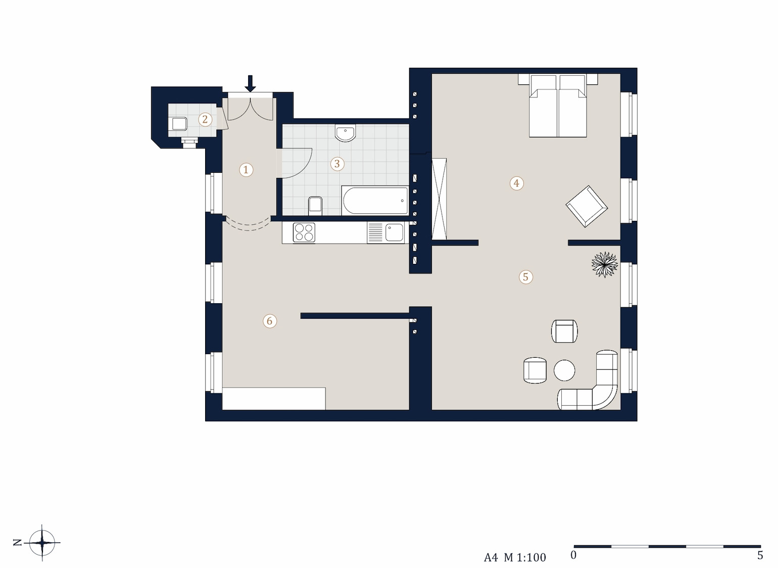Sie betreten die Wohnung und gelangen in einen Vorraum, von hier gelangen Sie links in das Badezimmer welches mit einer Badewanne, Dusche und Waschmaschinenanschluss ausgestattet ist. Durch den Voraum gelangen Sie in die Küche mit Küchenzeile und einem anschließenden Wohn- / Essbereich . Von hier haben Sie Zugang zum Wohnzimmer und zum Schlafzimmer von dem man auch in das Badezimmer gehen kann. Das separate WC finden Sie beim Eingang der Wohnung.