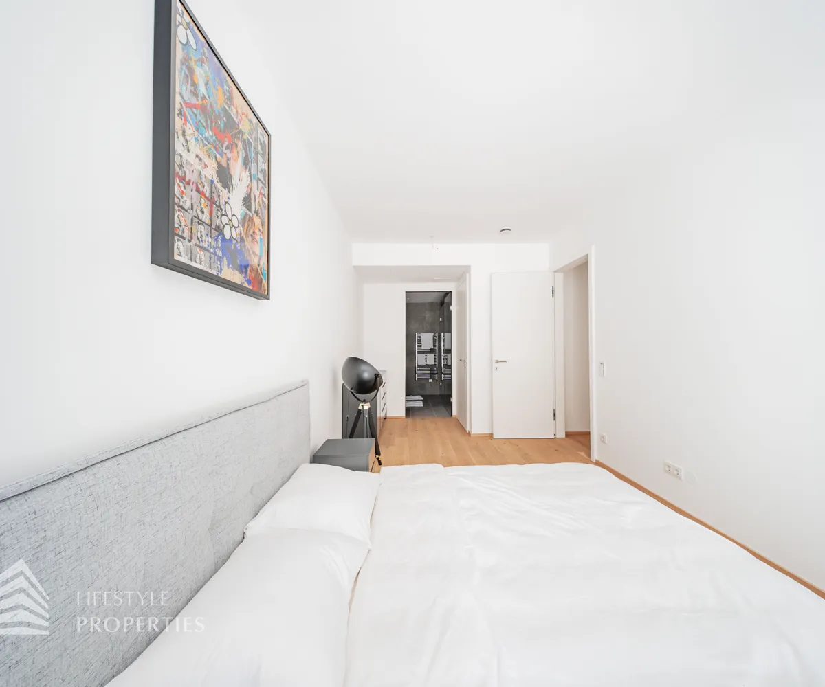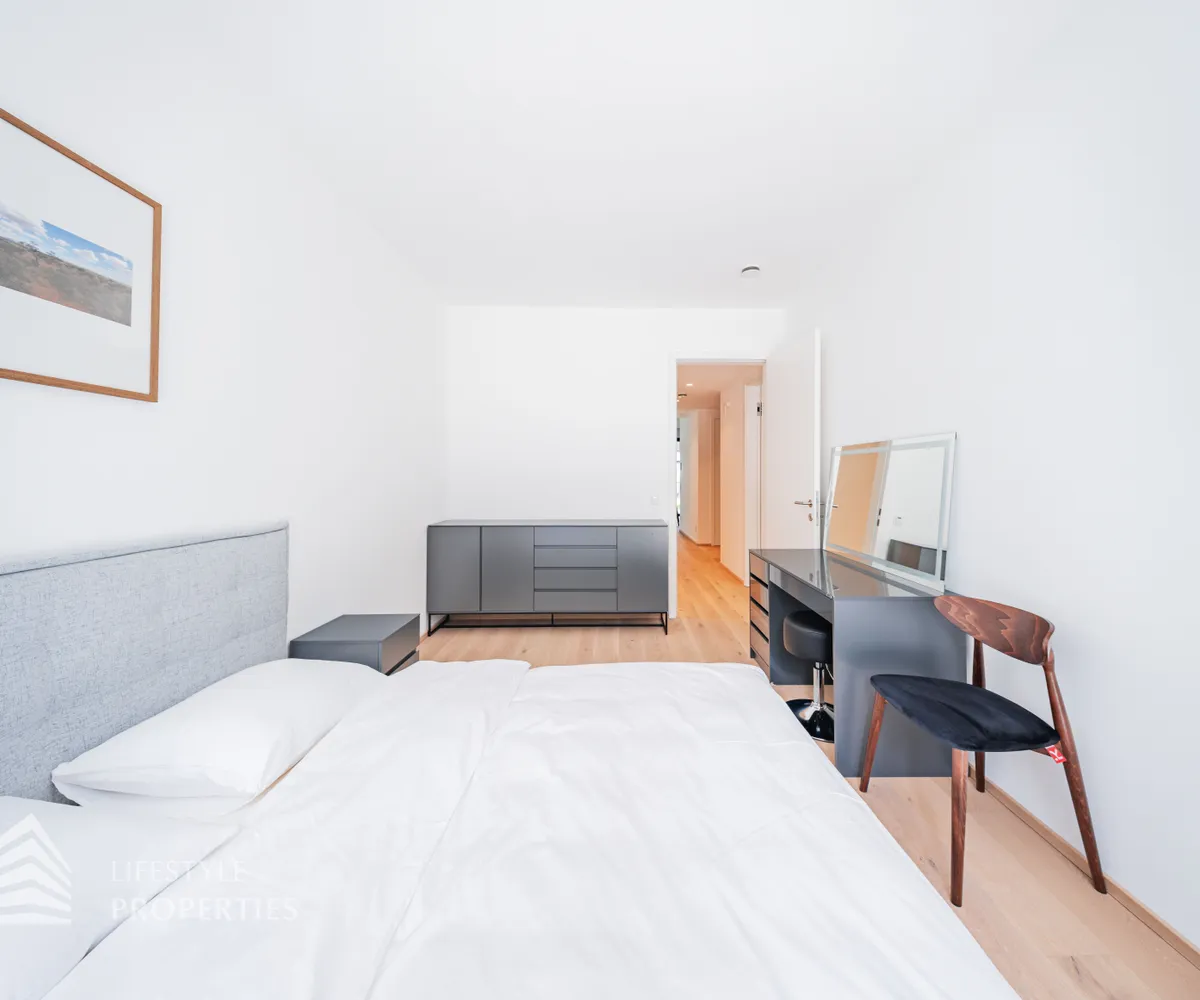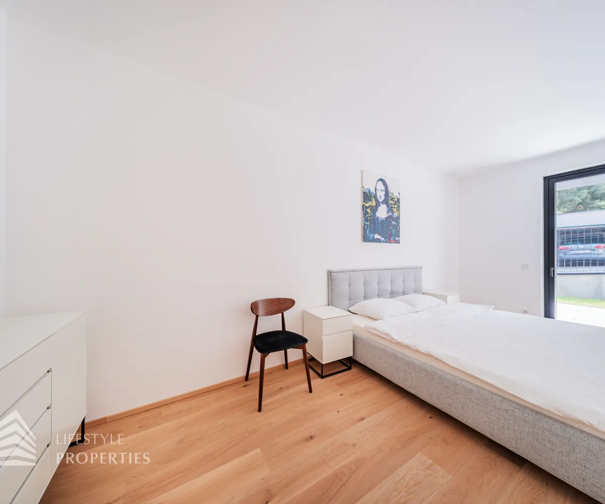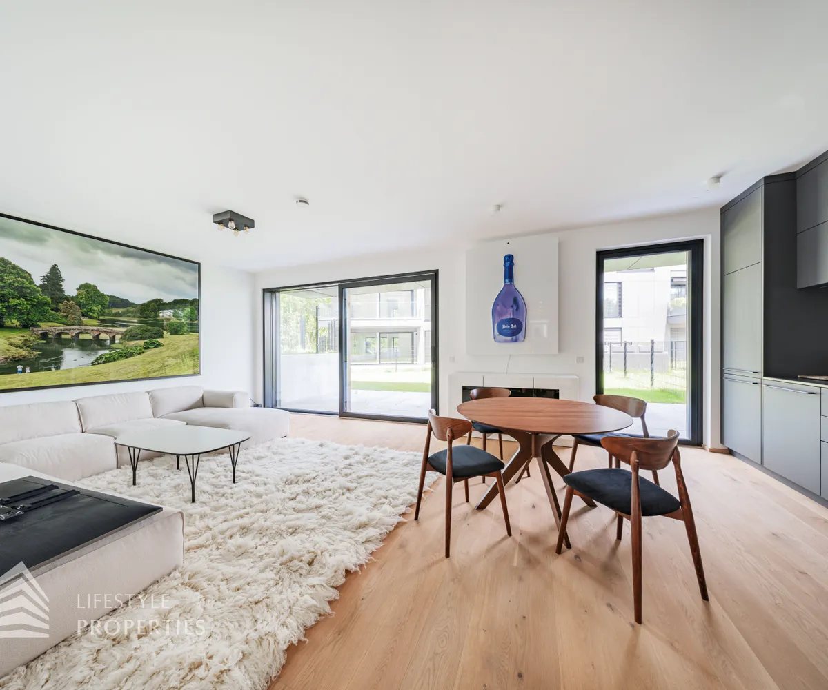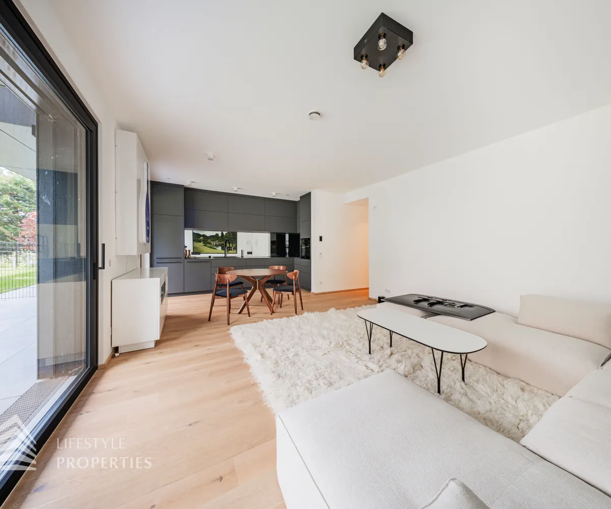 Die Immobilie liegt im Erdgeschoss eines neu erbauten Wohnhauses und erstreckt sich über eine Wohnfläche von ca. 107 m 2 . Sie teilt sich auf in einen offenen Wohnbereich, drei Zimmer, ein Bad mit Dusche, ein Bad mit Wanne, zwei separate WCs und einen Abstellraum. Außerdem sind zwei große Terrassen mit traumhaftem Blick und ein knapp 204 m 2 großer Garten Teil des Eigentums. Die Haupträume der Wohnung sind mit hochwertigem Eichenparkett ausgestattet und die Nassräume mit Grantitoker-Fliesen ausgekleidet. Die Immobilie verfügt über eine Fußbodenheizung, sowie 3-fach verglaste Holz-Alu-Fenster und -Türen, mit außenliegendem Sonnenschutz. Die Eingangstüren und die Terrassentüren sind einbruchsgesichert. Ebenso besteht die Option einer Alarmanlage. Die Wohnung wird teilmöbliert übergeben.