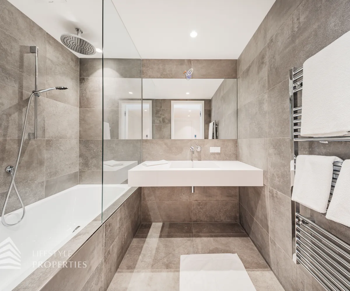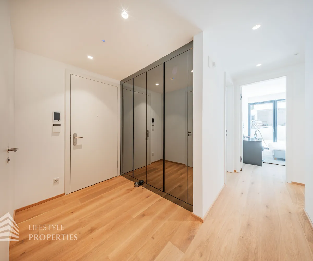 Sie betreten die Wohnung und gelangen in einen einladenden Eingangsbereich. Dieser bietet dank einer praktischen Nische genügend Platz für eine Garderobe. Rechterhand gelangen Sie in den offenen Wohn- und Essbereich, welcher Dank der großen Fenster und Terrassentüren hell und einladend ist. Von hier aus betreten Sie in den knapp 160 m