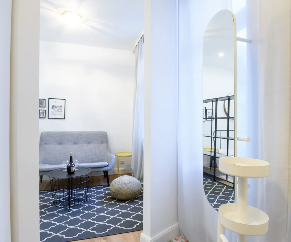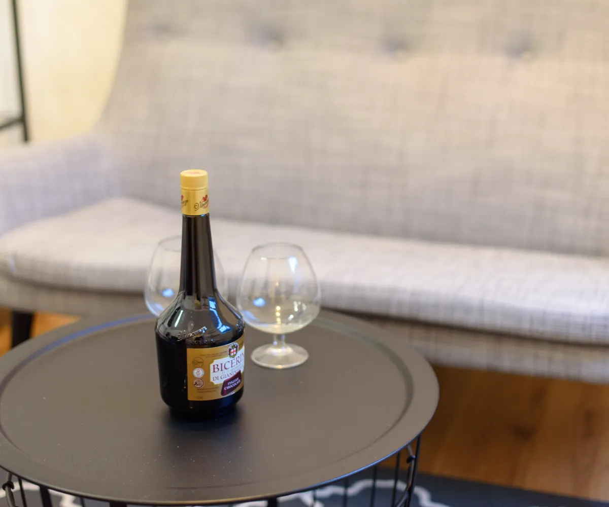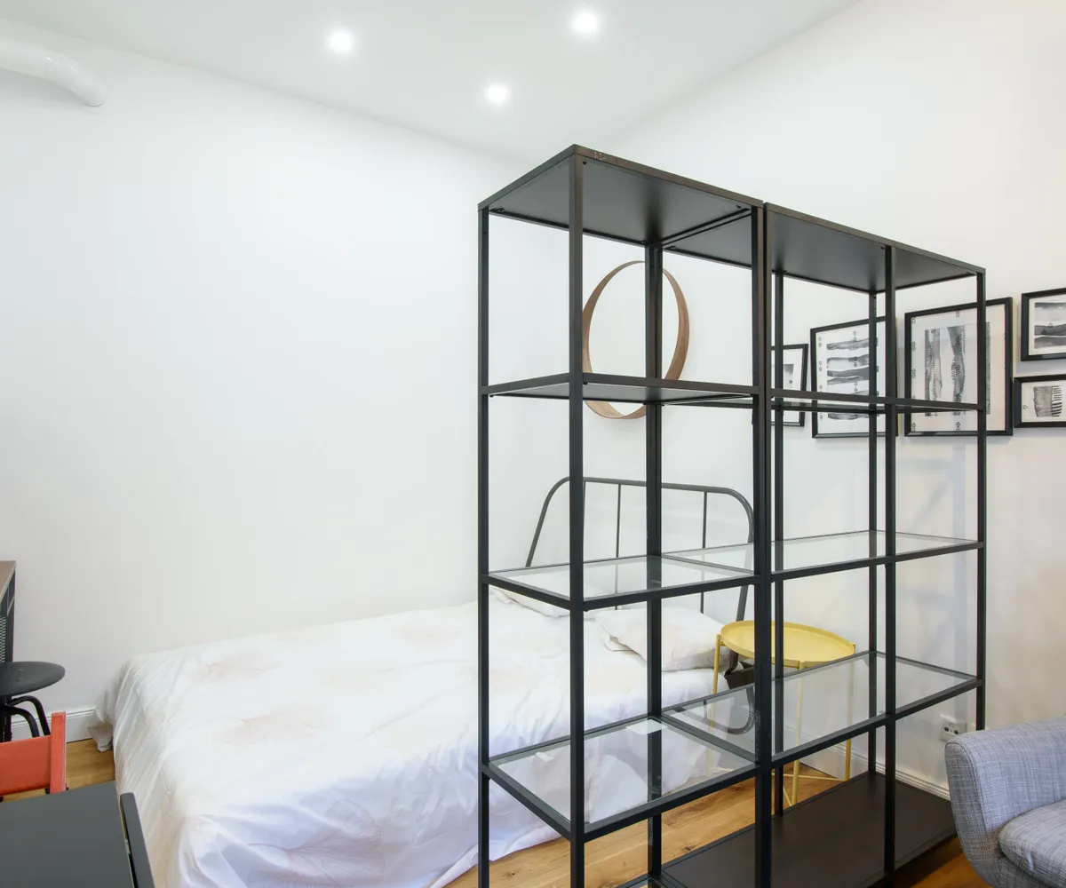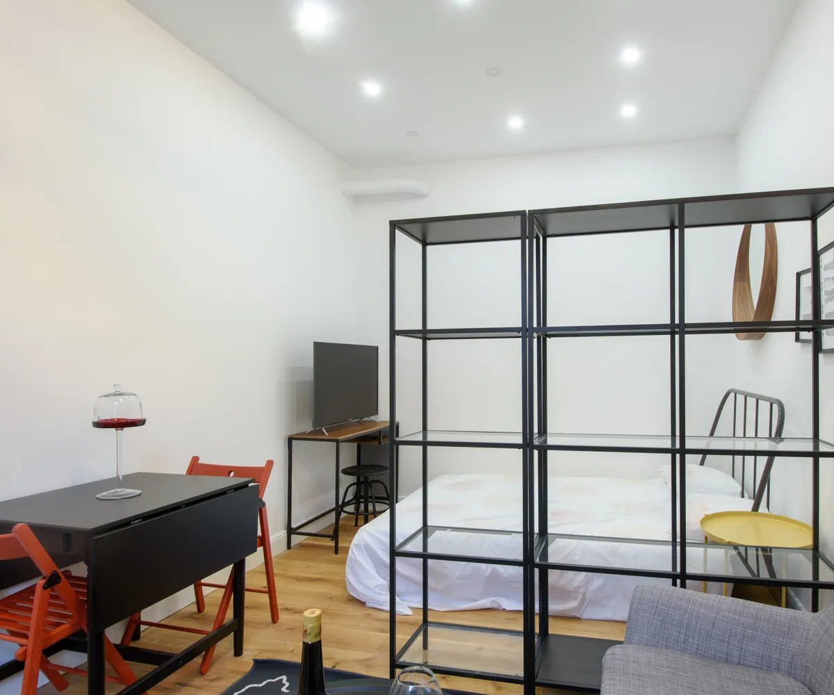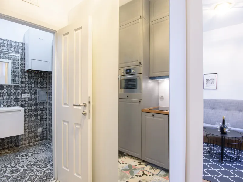 Sie betreten die Wohnung und gelangen in den hellen Vorraum. Linkerhand befindet sich die moderne Einbauküche. Hohe Schränke bieten ausreichend Stauraum. Gegenüber der Eingangstüre befindet sich das Badezimmer, welches über eine schöne Glasdusche, eine Toilette und ein Waschbecken verfügt. Rechts der Eingangstüre gelangen Sie in den lichtdurchfluteten Wohn-/Schlafbereich. Hier haben Sie Platz für ein Bett, ein gemütliches Sofa und einen charmanten Essbereich.