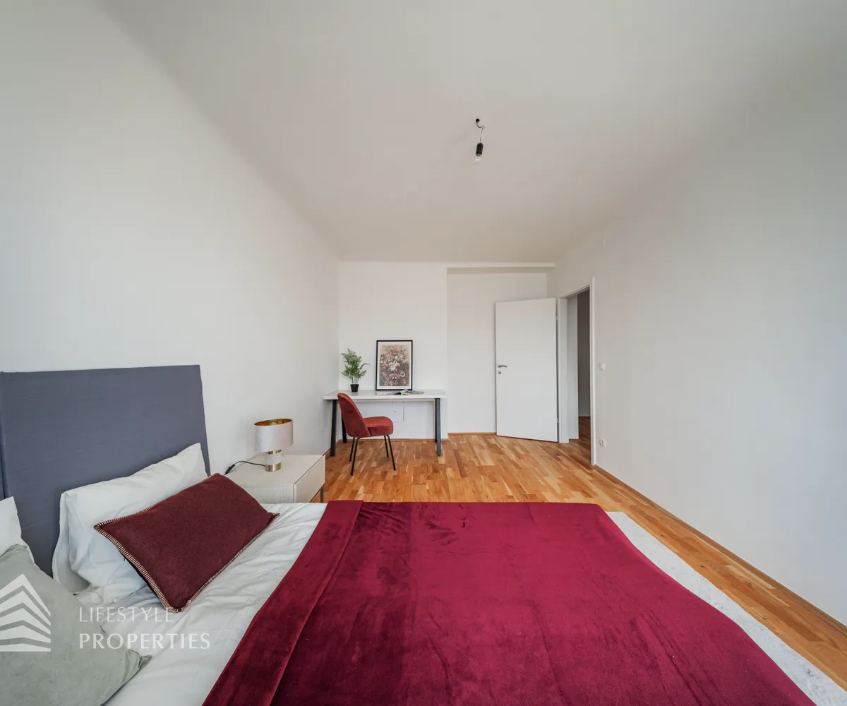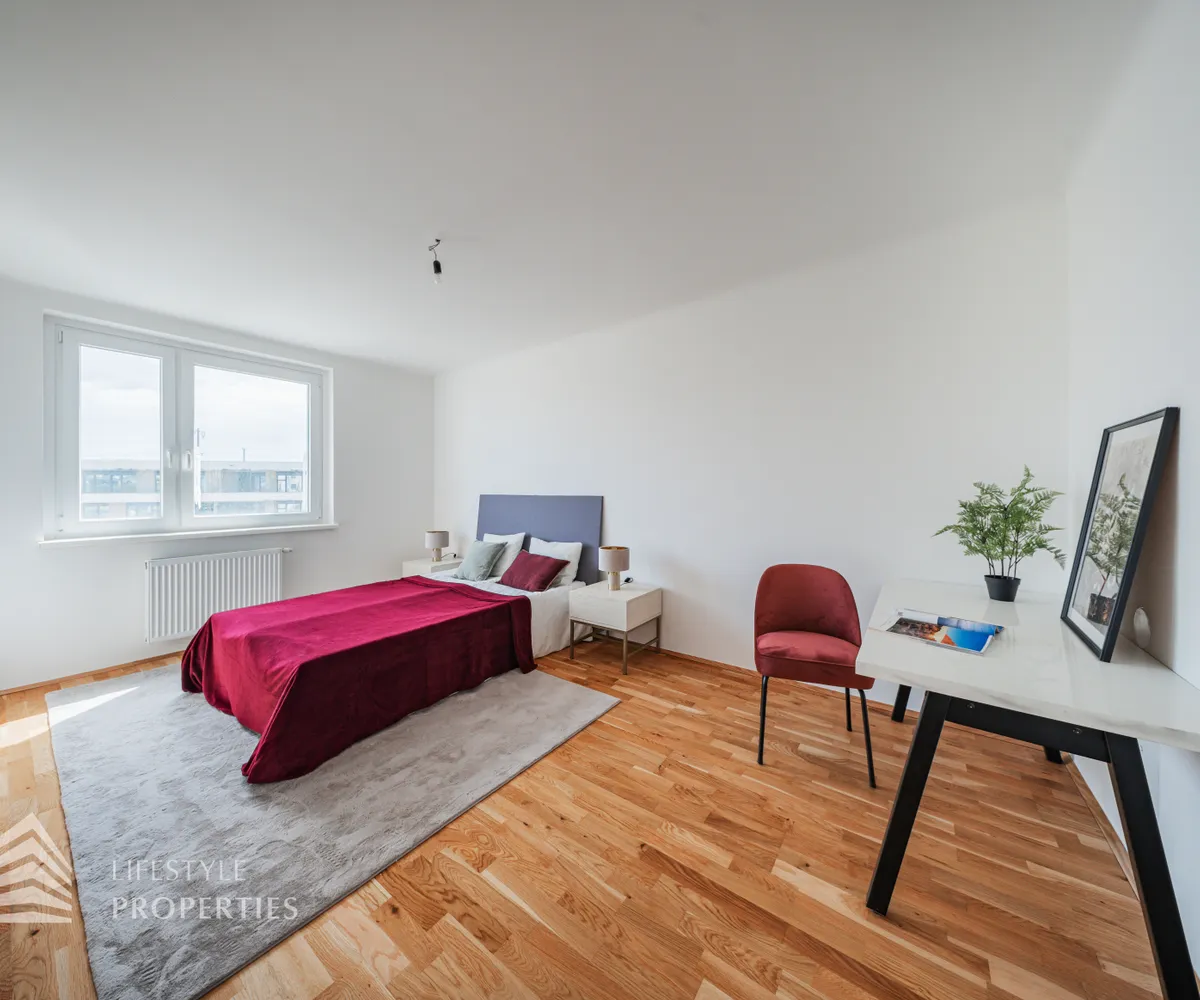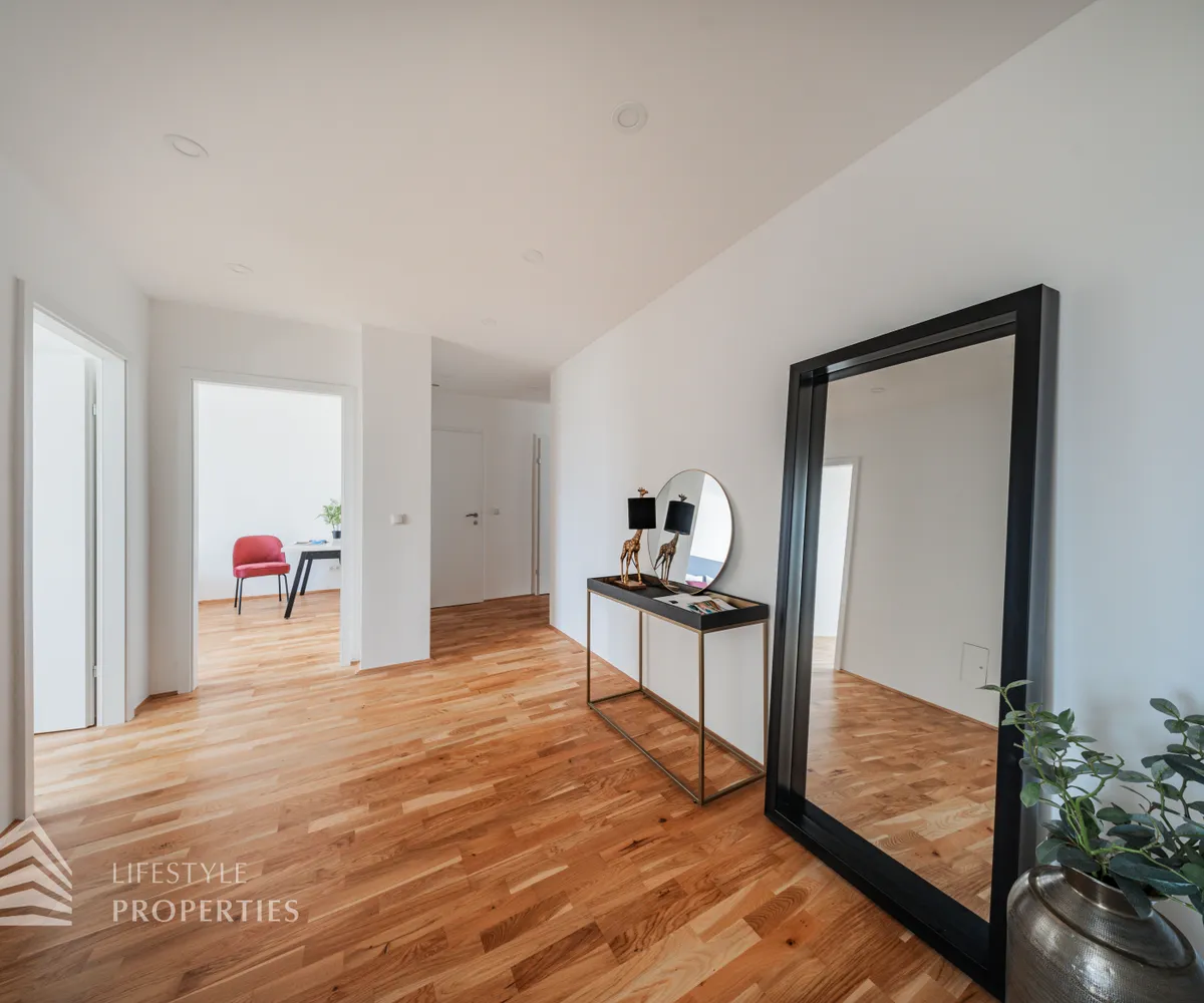 Beim Betreten der Wohnung gelangen Sie in das geräumige Vorzimmer. Auf der linken Seite befindet sich das erste Kinderzimmer, und durch eine Wand separiert, das zweite Kinderzimmer mit. Der Vorraum leitet Sie weiter zum Schlafzimmer, welches dank großer Fenster mit natürlichem Licht durchflutet wird. Die Zimmer wurden entlang des Korridors angeordnet, was eine gute Trennung von Wohn- und Schlafbereichen gewährleistet. Die beiden Bäder befinden sich gegenüber voneinander und liegen zentral zwischen dem Wohnbereich und den Schlafzimmern, wodurch sie von allen Räumen gut erreichbar sind. Das eine Bad verfügt eine Dusche und das gegenüberliegende wurde mit einer Badewanne ausgestattet. Eine Toilette befindet sich im Badezimmer, und das Gäste-WC ist separat. Der großzügige Wohn- und Essbereich ist das Highlight dieser modernen Wohnung und lädt zum Entspannen und Verweilen ein. Die Terrasse befindet sich auf der linken Seite der Wohnung und ist vom Wohnzimmer aus zugänglich. Sie bietet eine schöne Erweiterung des Wohnraums ins Freie.