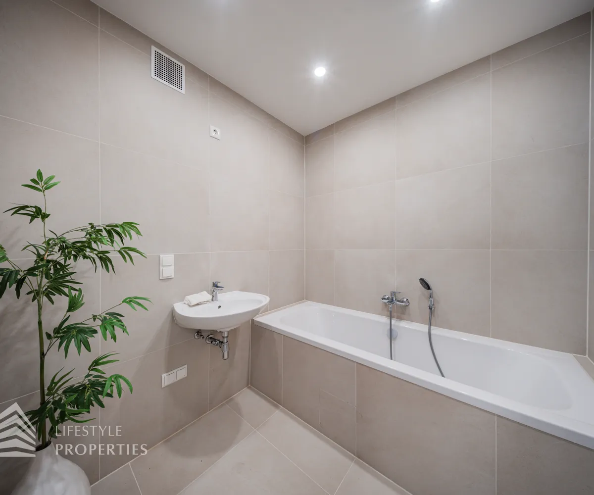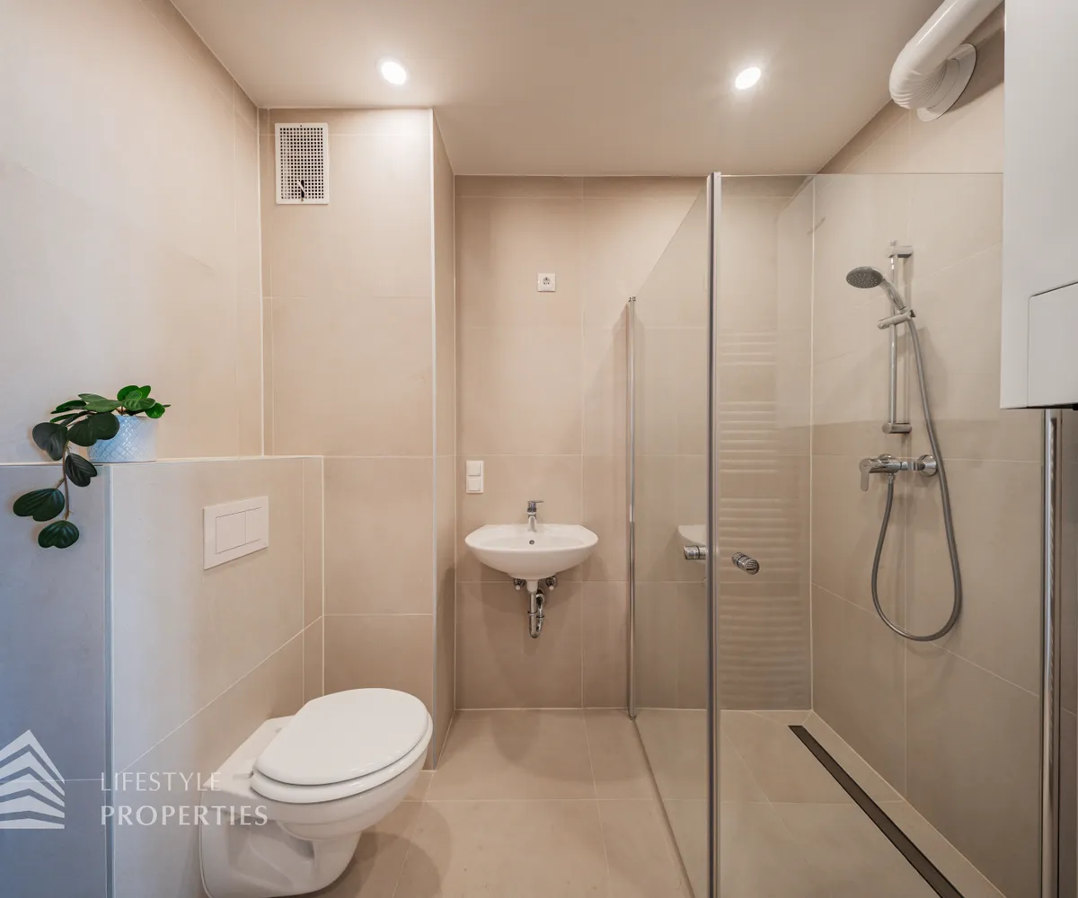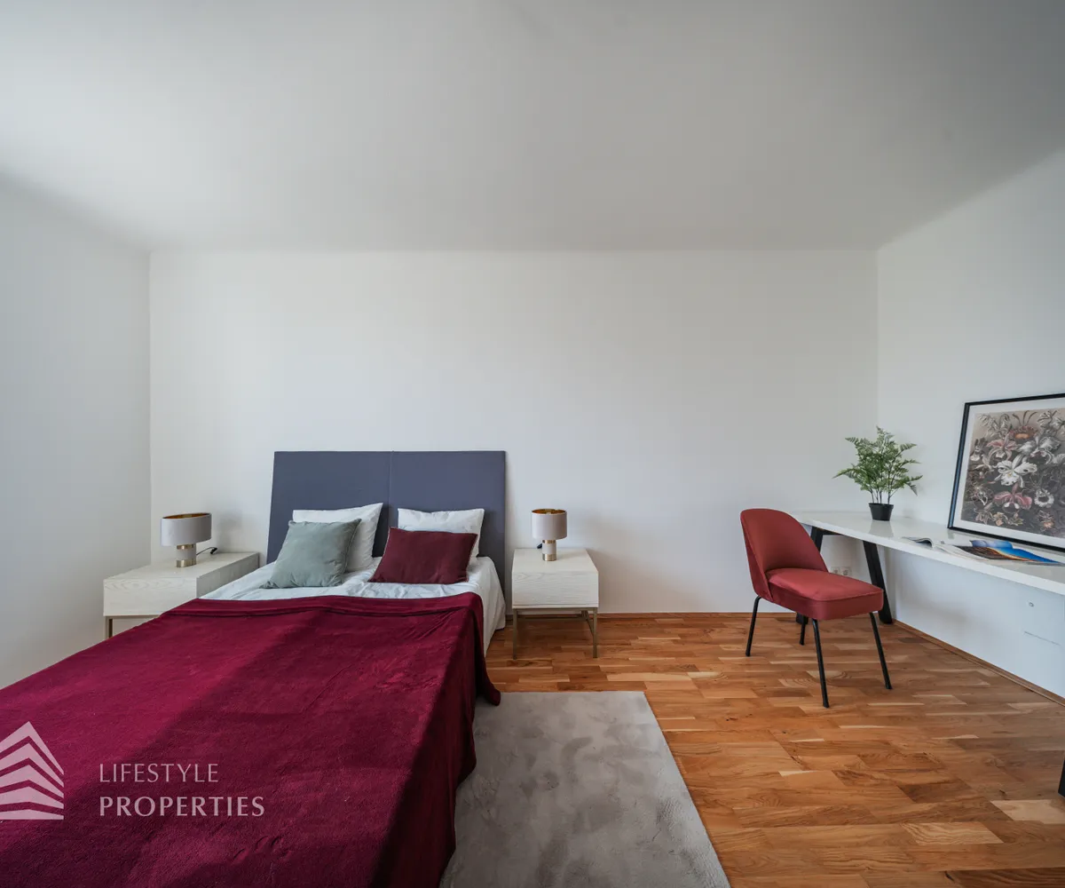 Beim Betreten der Wohnung gelangen Sie in das geräumige Vorzimmer. Auf der linken Seite befindet sich das erste Kinderzimmer, und durch eine Wand separiert, das zweite Kinderzimmer mit. Der Vorraum leitet Sie weiter zum Schlafzimmer, welches dank großer Fenster mit natürlichem Licht durchflutet wird. Die Zimmer wurden entlang des Korridors angeordnet, was eine gute Trennung von Wohn- und Schlafbereichen gewährleistet. Die beiden Bäder befinden sich gegenüber voneinander und liegen zentral zwischen dem Wohnbereich und den Schlafzimmern, wodurch sie von allen Räumen gut erreichbar sind. Das eine Bad verfügt eine Dusche und das gegenüberliegende wurde mit einer Badewanne ausgestattet. Eine Toilette befindet sich im Badezimmer, und das Gäste-WC ist separat. Der großzügige Wohn- und Essbereich ist das Highlight dieser modernen Wohnung und lädt zum Entspannen und Verweilen ein. Die Terrasse befindet sich auf der linken Seite der Wohnung und ist vom Wohnzimmer aus zugänglich. Sie bietet eine schöne Erweiterung des Wohnraums ins Freie.