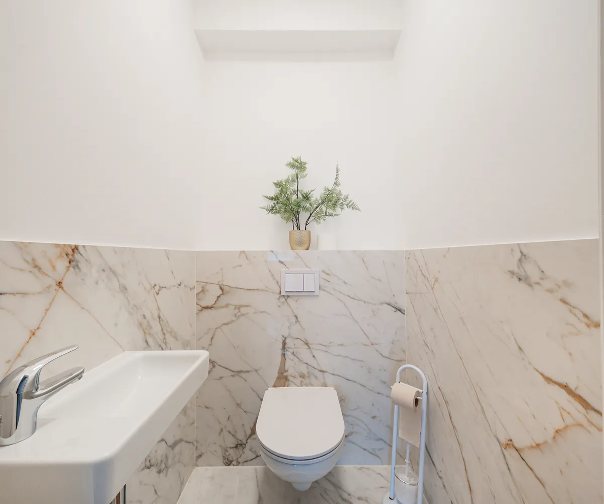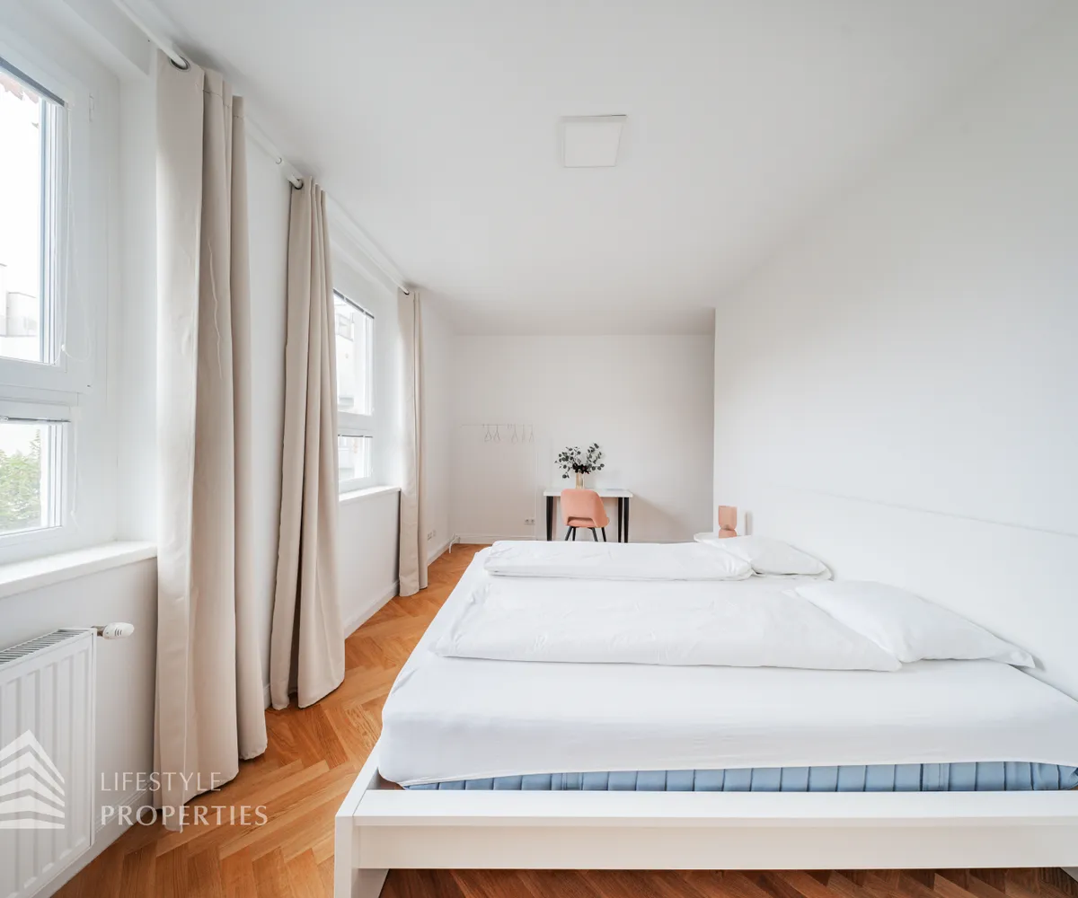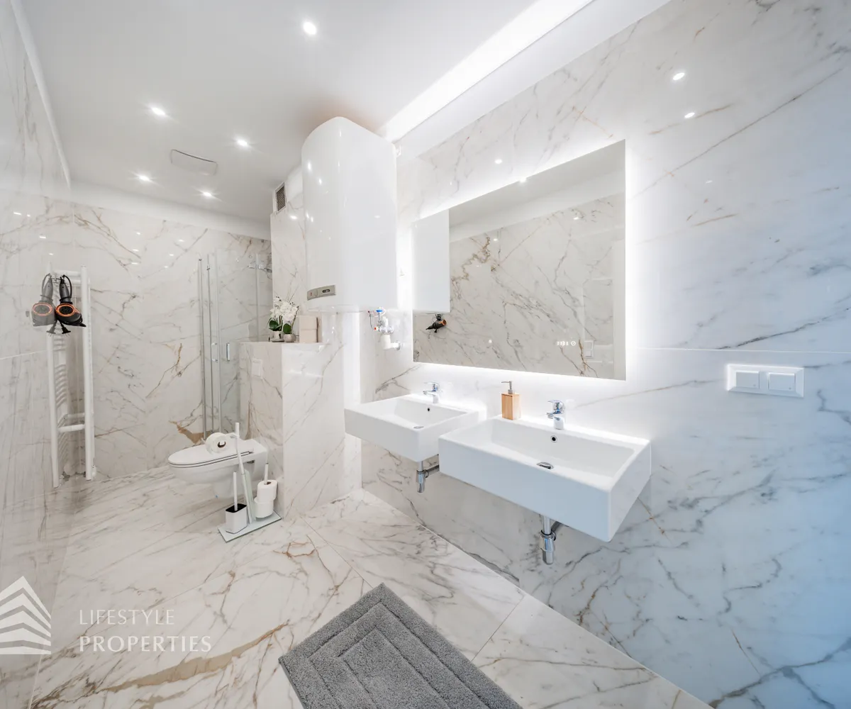 Sie betreten die Immobilie und befinden sich im Vorraum, von welchem aus Sie das großzügige Wohnzimmer, drei Zimmer, ein Badezimmer sowie das Gäste-WC erreichen. Rechterhand gelangen Sie in das Wohnzimmer, welches durch zwei große Fenster äußerst hell und einladend erscheint. Die Fläche bietet ausreichend Platz für eine offene Küche, eine gemütliche Couchlandschaft sowie einen großen Esstisch. Vom Wohnzimmer aus gelangen Sie in das große Hauptschlafzimmer. Dieser Raum bietet Zugang zu einem modernen Badezimmer, welches über eine Dusche, ein WC sowie zwei Waschbecken verfügt. Zurück im Vorraum gelangen Sie linkerhand in das erste der drei weiteren Zimmer. Dieser Raum könnte beispielsweise als Kinderzimmer dienen und bietet genügend Platz für ein Doppelbett, einen großen Kleiderschrank sowie einen Schreibtisch. Ebenfalls über den Vorraum erreichen Sie die restlichen zwei Zimmer. Nebenan befindet sich das kleinste der fünf Zimmer, welches sich somit hervorragend als Büro oder Gästezimmer eignet. Das zweite Badezimmer ist mit einer Dusche, einer Badewanne, einem Waschbecken sowie einem WC ausgestattet. Nebenan befindet sich das Gäste-WC. Beheizt wird die Immobilie mittels Gasetagenheizung.