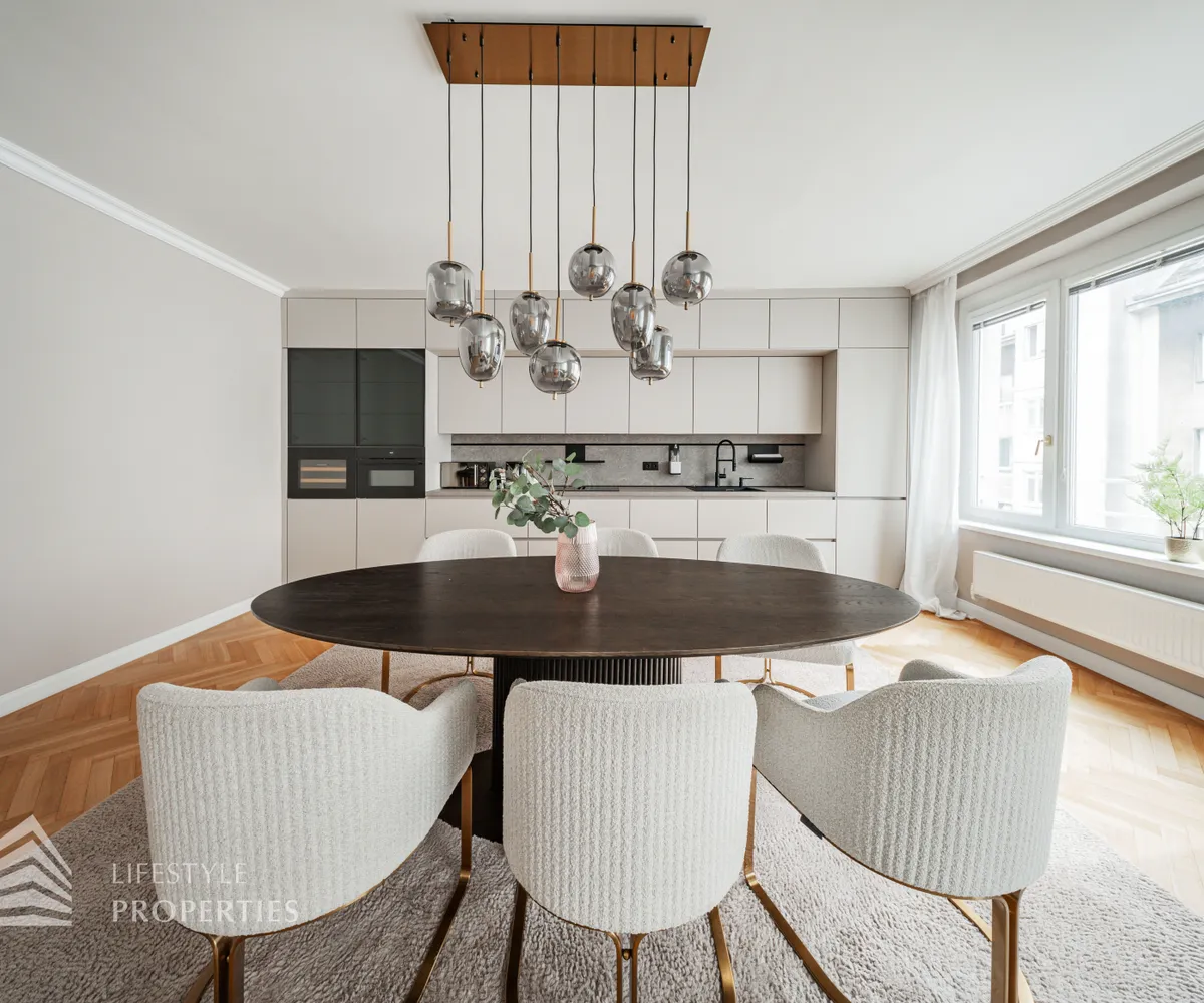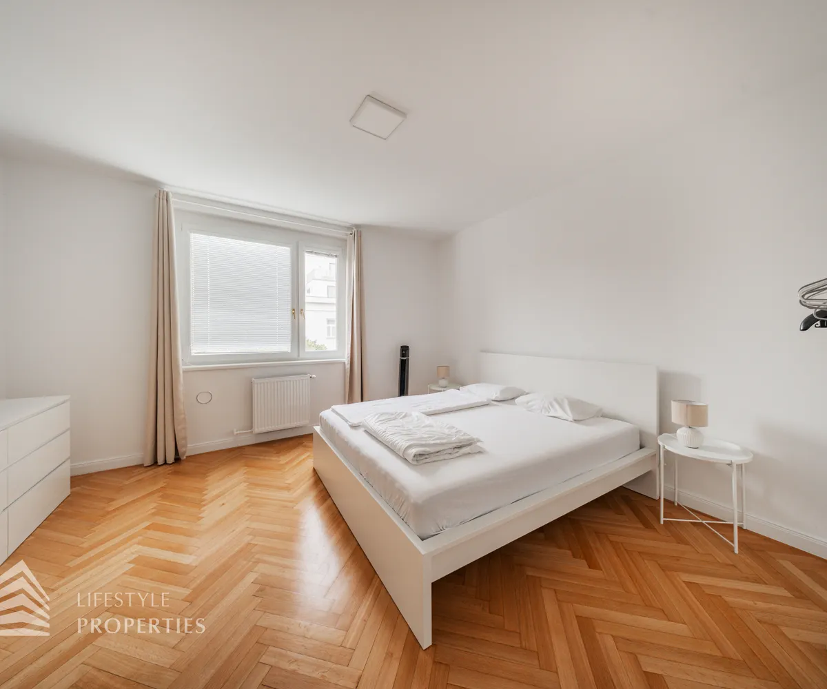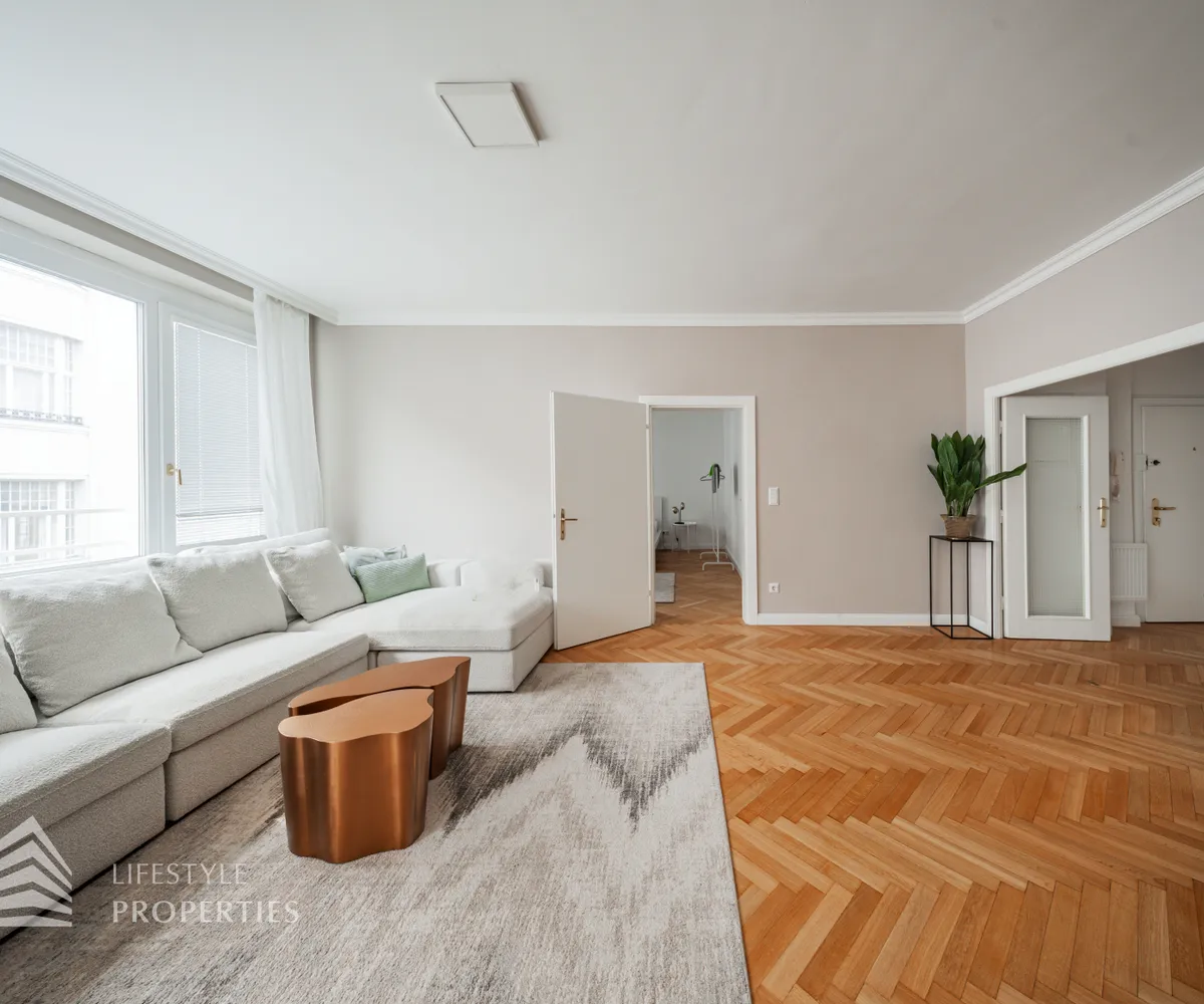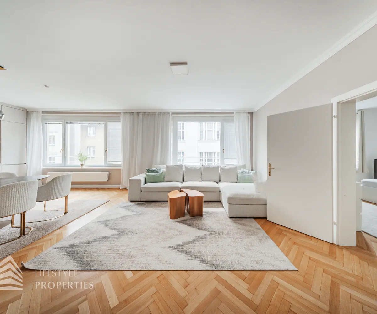 Die Wohnung befindet sich im 4. Liftstock eines im Jahr 1962 erbauten Wohnhauses und verfügt über eine Wohnfläche von ca. 142 m². Die großzügige Raumaufteilung sieht wie folgt aus: ein Vorzimmer, eine Wohnküche, vier weitere Zimmer, zwei Bäder sowie eine Gästetoilette. Die Haupträume sind mit hochwertigem Parkett ausgekleidet, die Nassräume sind gefliest. Ein Parkplatz ist im Kaufpreis enthalten.