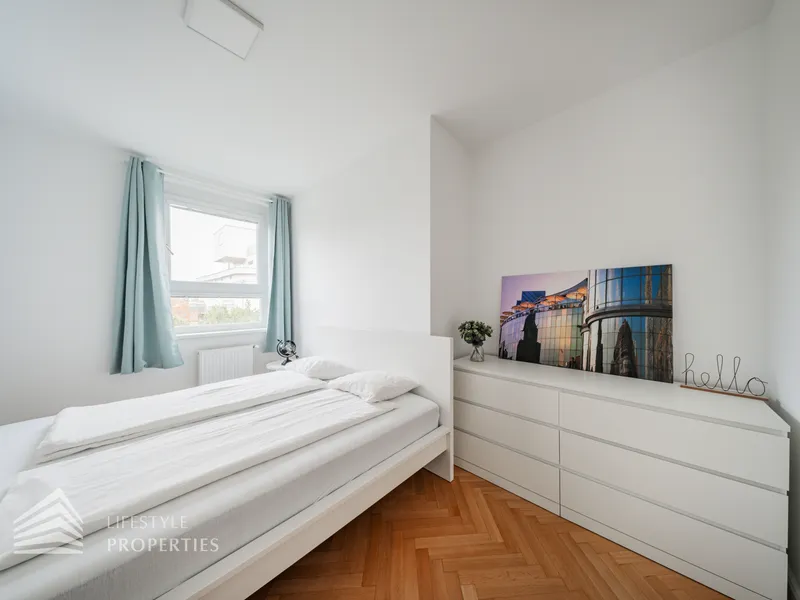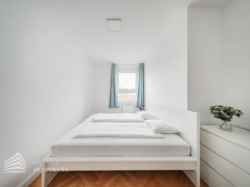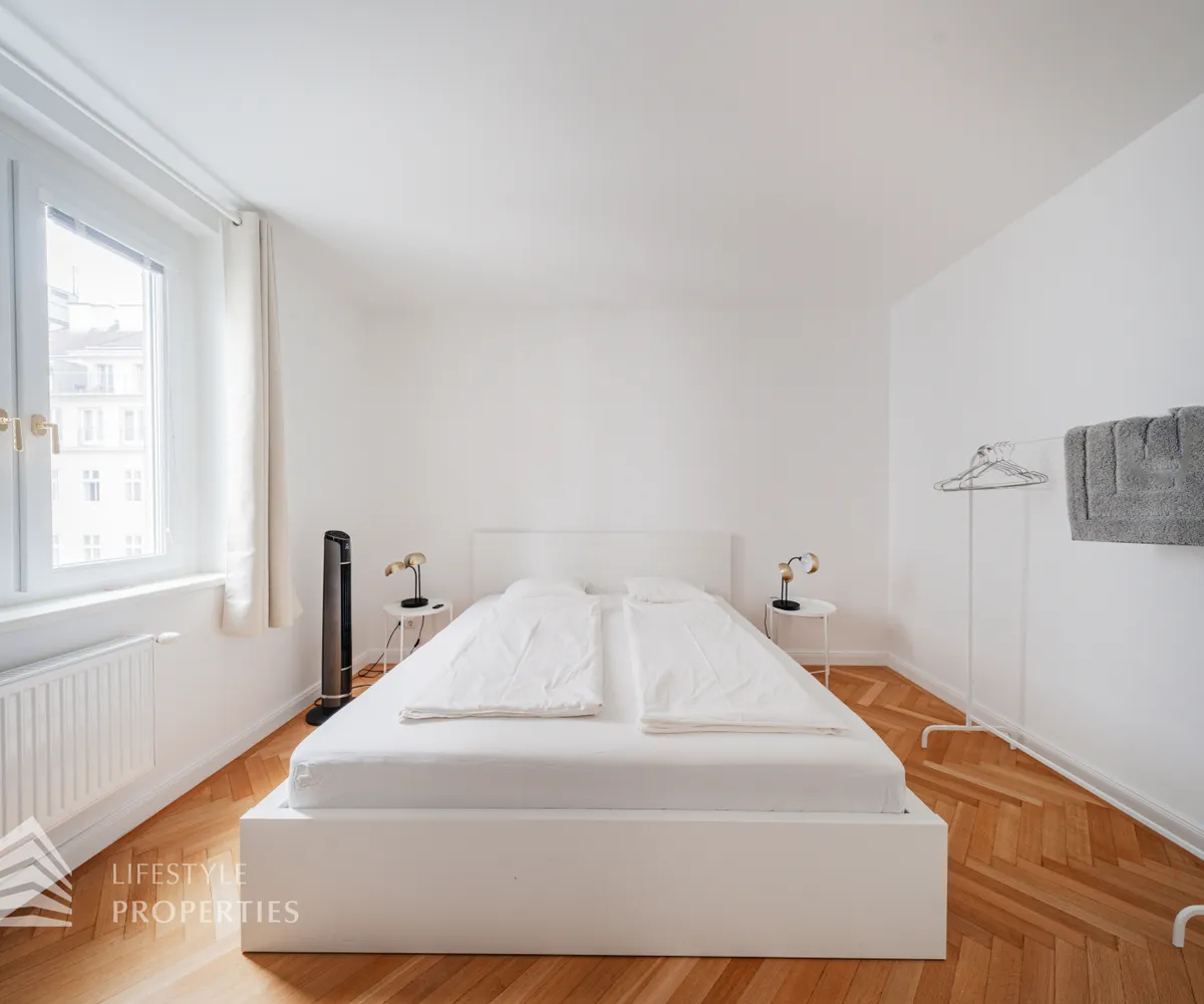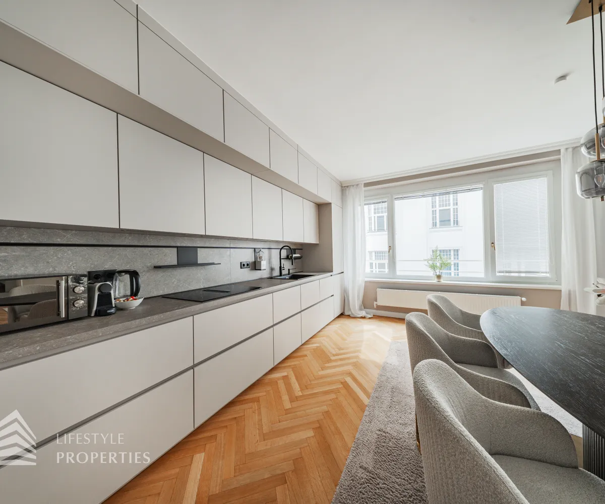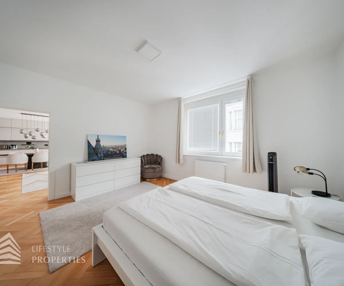 Die Wohnung befindet sich im 4. Liftstock eines im Jahr 1962 erbauten Wohnhauses und verfügt über eine Wohnfläche von ca. 142 m². Die großzügige Raumaufteilung sieht wie folgt aus: ein Vorzimmer, eine Wohnküche, vier weitere Zimmer, zwei Bäder sowie eine Gästetoilette. Die Haupträume sind mit hochwertigem Parkett ausgekleidet, die Nassräume sind gefliest. Ein Parkplatz ist im Kaufpreis enthalten.