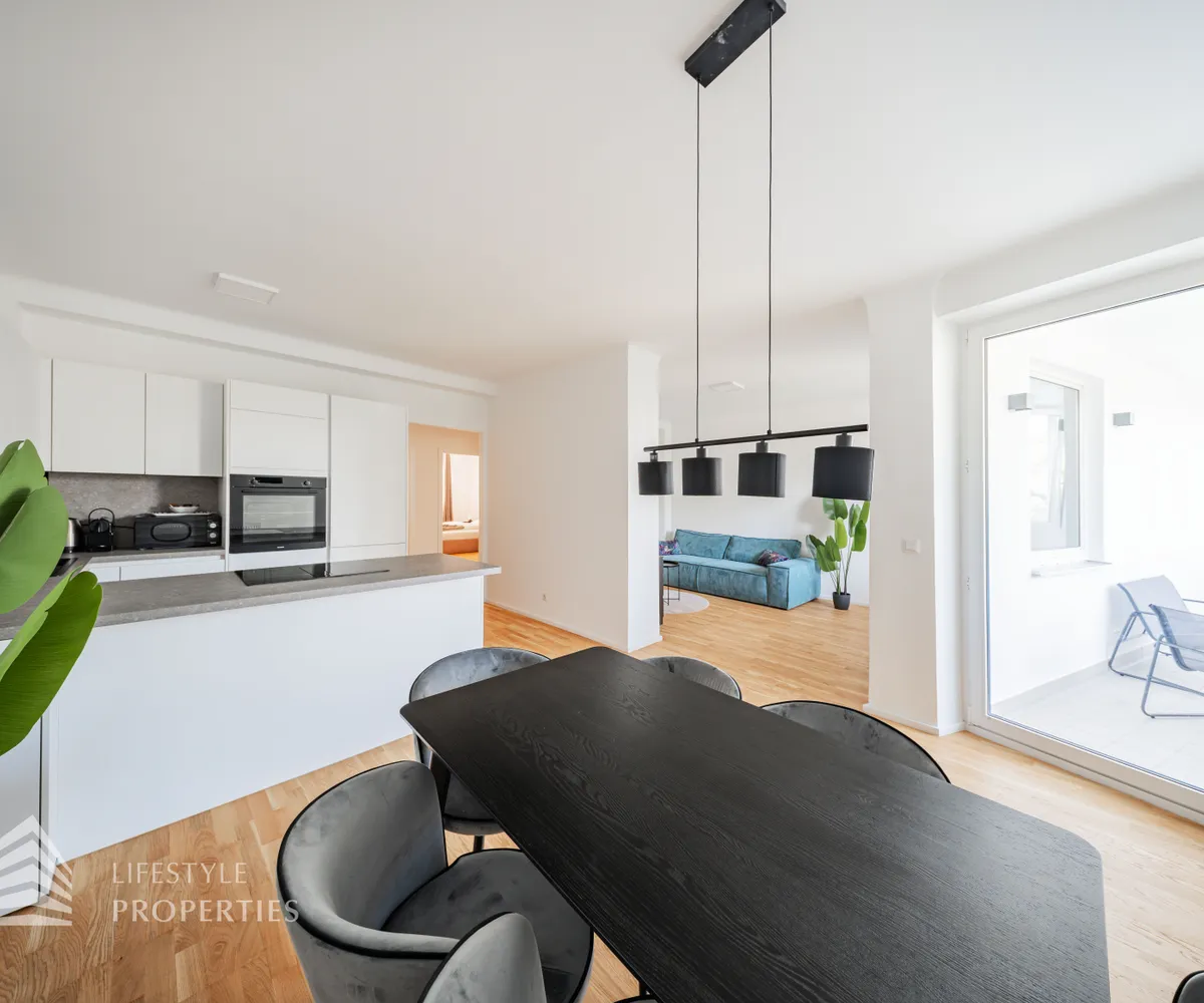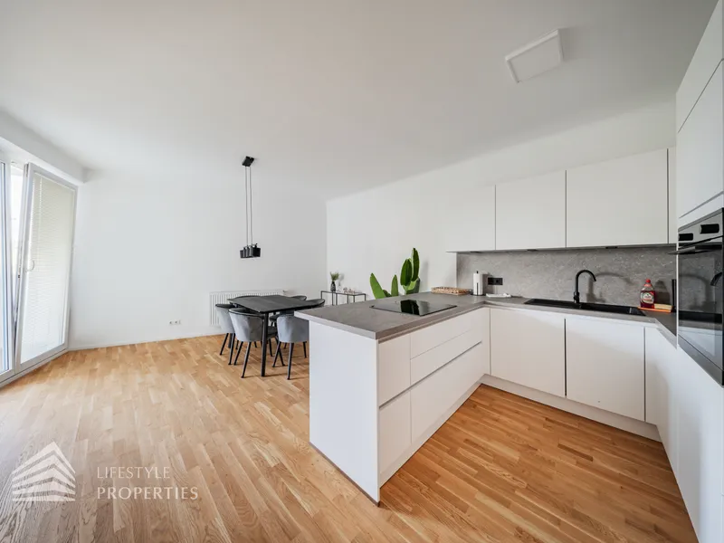 Bei Betreten der Wohnung gelangen Sie in den zentral gelegenen Eingangsbereich, welcher alle Räumlichkeiten miteinander verbindet. Das Herzstück der Wohnung bildet die offene Wohnküche mit ca. 39 m², die nicht nur viel Platz bietet, sondern auch komplett ausgestattet ist und somit direkt genutzt werden kann. Über die Wohnküche gelangen Sie zum Highlight der Wohnung. Zur geräumigen Loggia mit ca. 12 m², die zum Entspannen und Verweilen einlädt. Gegenüber der Wohnküche gelangen Sie in die zwei weiteren Zimmer, welche sich mit ca. 8 m² und ca. 13 m² optimal als Schlaf- oder Arbeitszimmer anbieten. Über den Vorraum erreichen Sie die restlichen Räumlichkeiten. Das moderne Badezimmer ist mit einer Badewanne ausgestattet, und das separate WC bietet zusätzlichen Komfort. Ein praktischer Abstellraum sorgt zudem für ausreichend Stauraum.