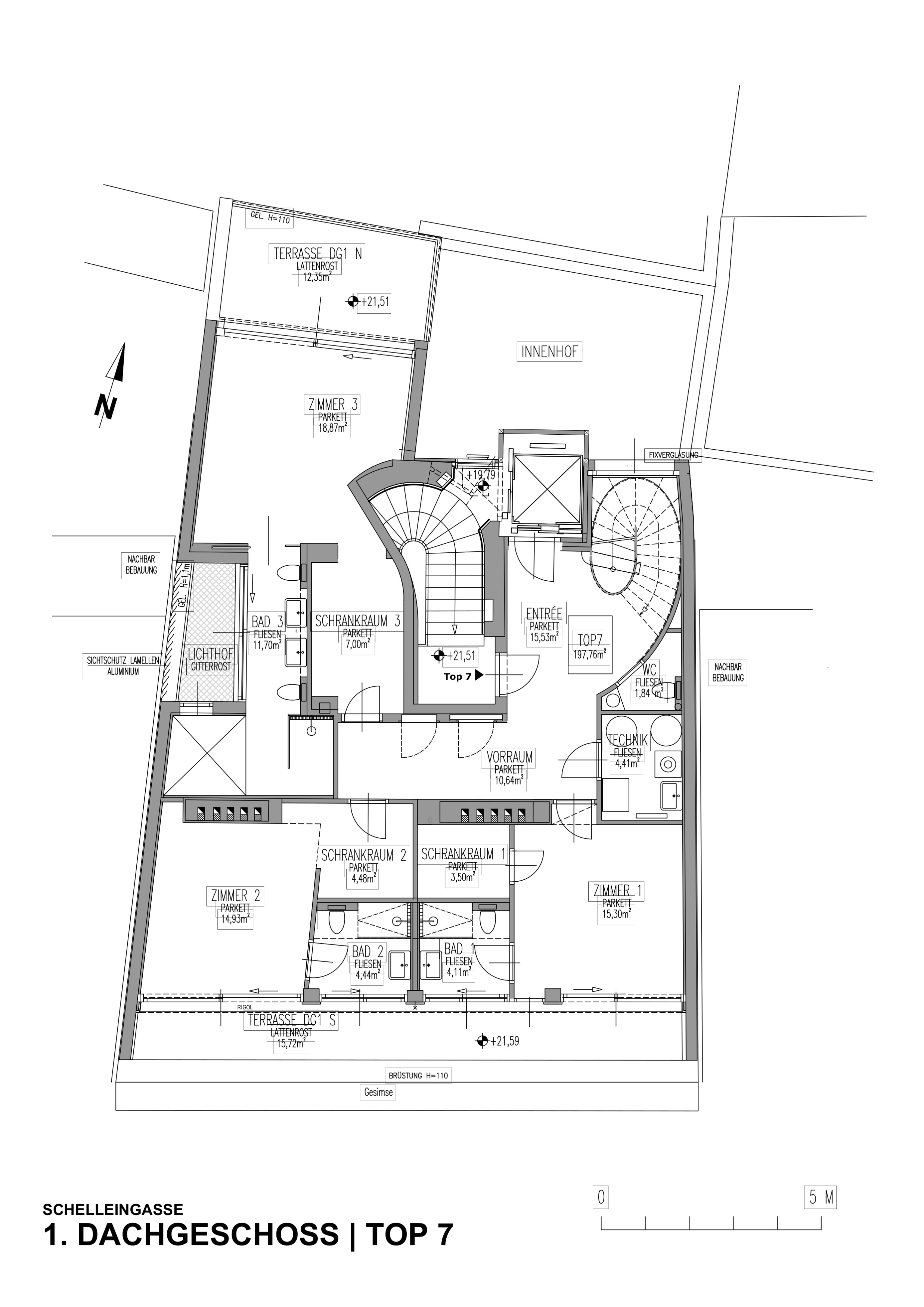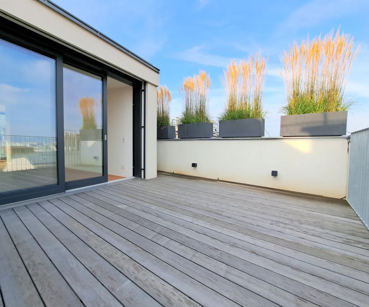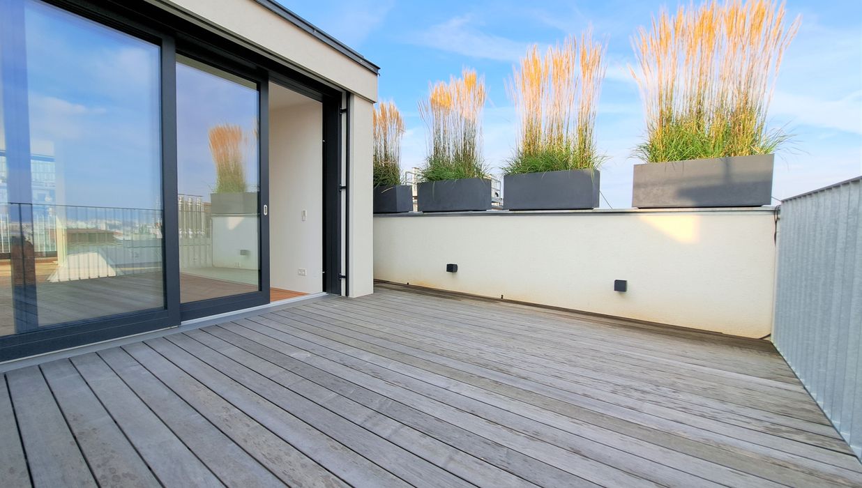 Die Wohnküche bietet direkten Zugang zu einer Ihrer, in den Innenhof ausgerichteten, Dachterrassen. Hier können Sie die warmen Sonnenstrahlen genießen, entspannen oder gesellige Abende mit Freunden und Familie verbringen.