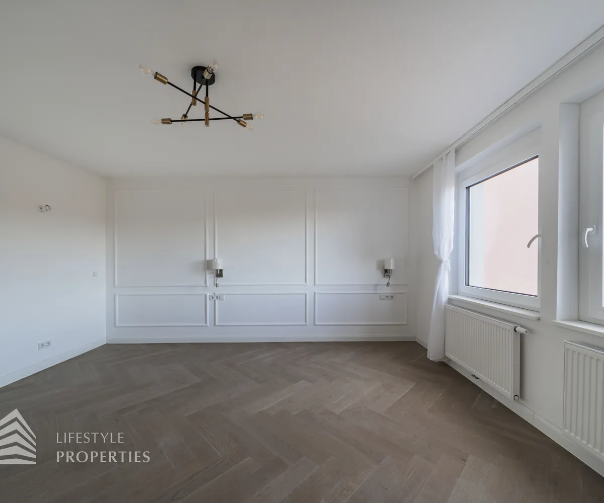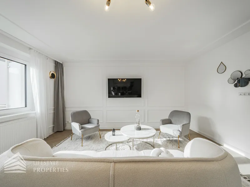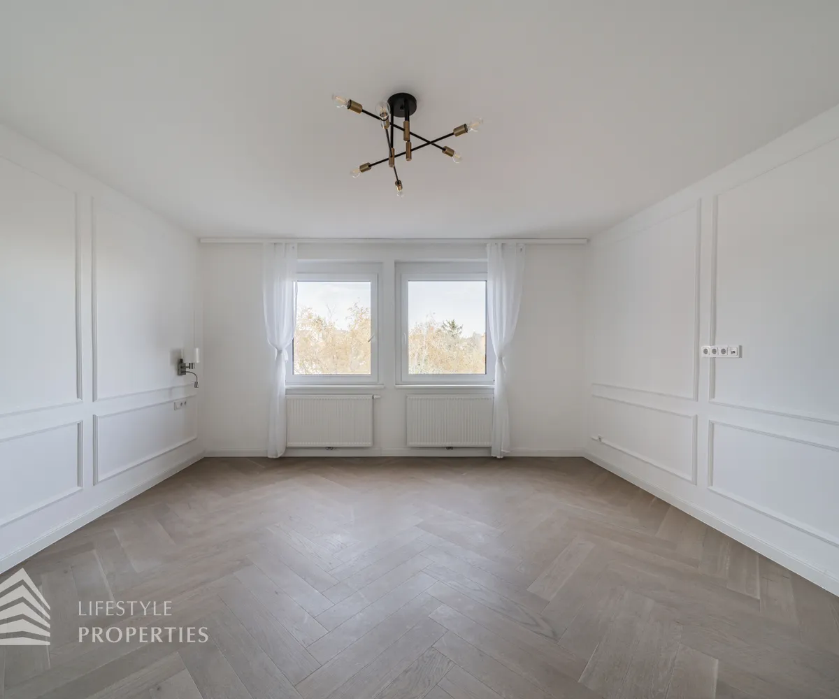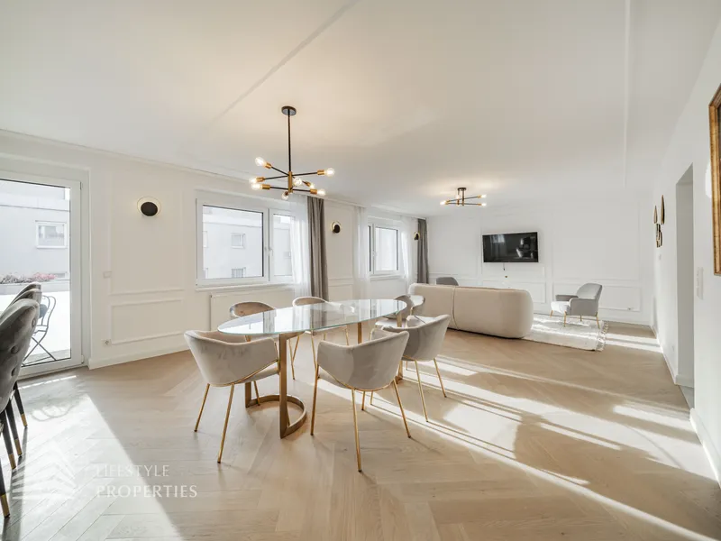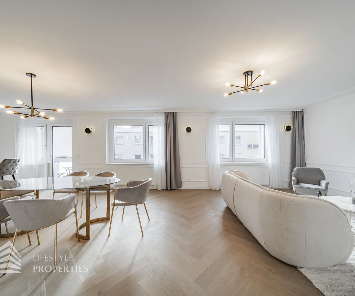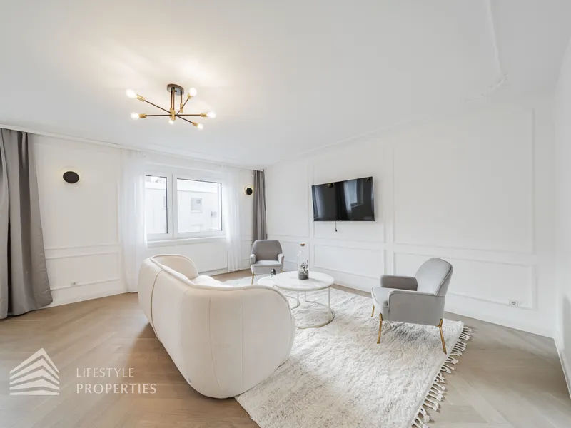 Die Immobilie befindet sich im vierten Liftstock eines im Jahr 1970 erbauten Hauses und weist eine Wohnfläche von ca. 123 m² auf. Die Wohnung teilt sich in einen Vorraum, eine Wohnküche, drei weitere Zimmer, zwei Bäder, ein Gäste-WC, einen Abtstellraum und einen Balkon auf. Die Haupträume sind mit wunderschönem Fischgrätparkett ausgelegt, der Vorraum, der Küchenbereich und die Nassräume sind mit hochwertigen Fliesen ausgekleidet. Die Wohnung verfügt über ein modernes Smart Home System. Es handelt sich um einen Erstbezug. Eine Waschküche im Keller und ein trockenes Kellerabteil sind ebenfalls vorhanden.