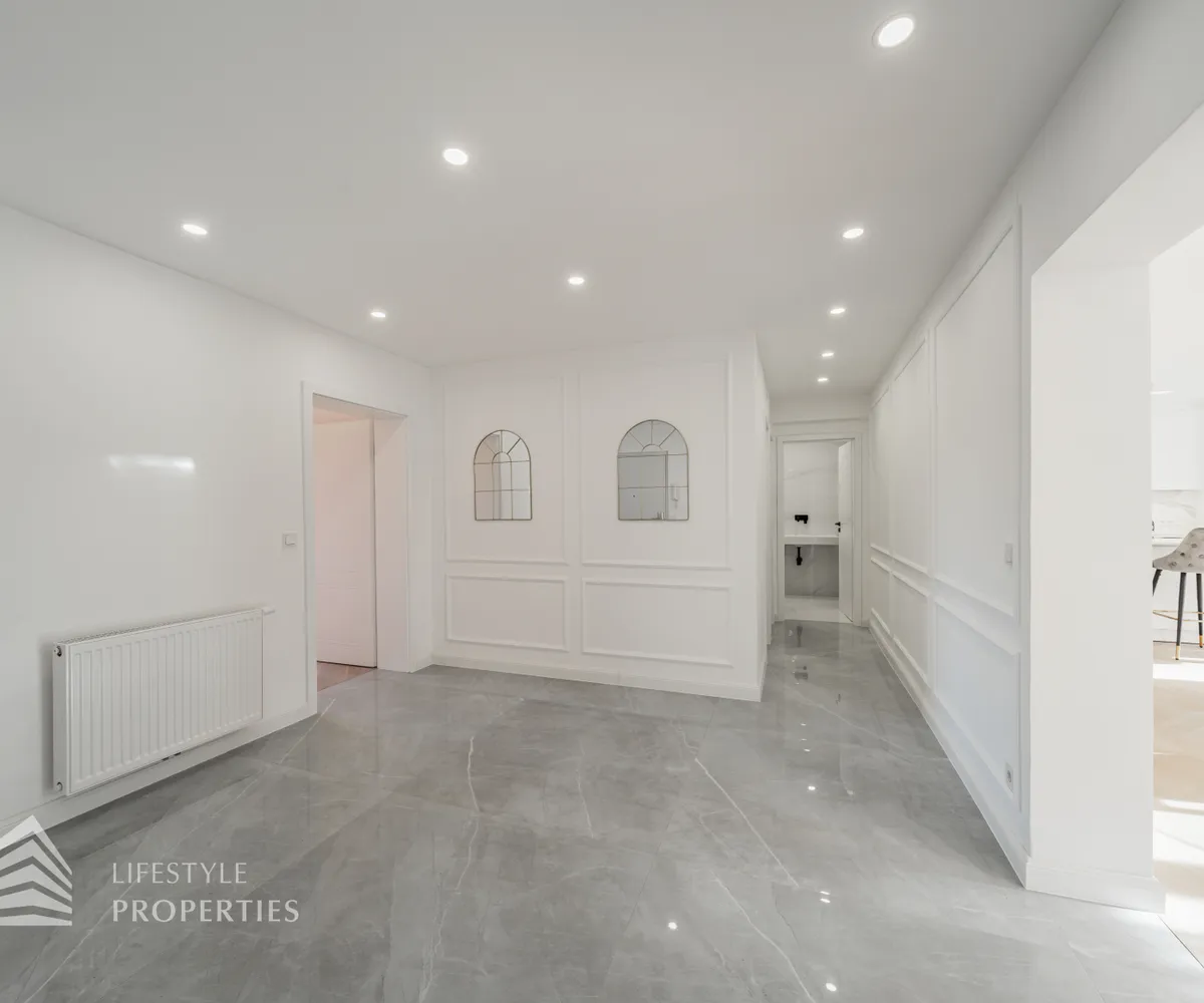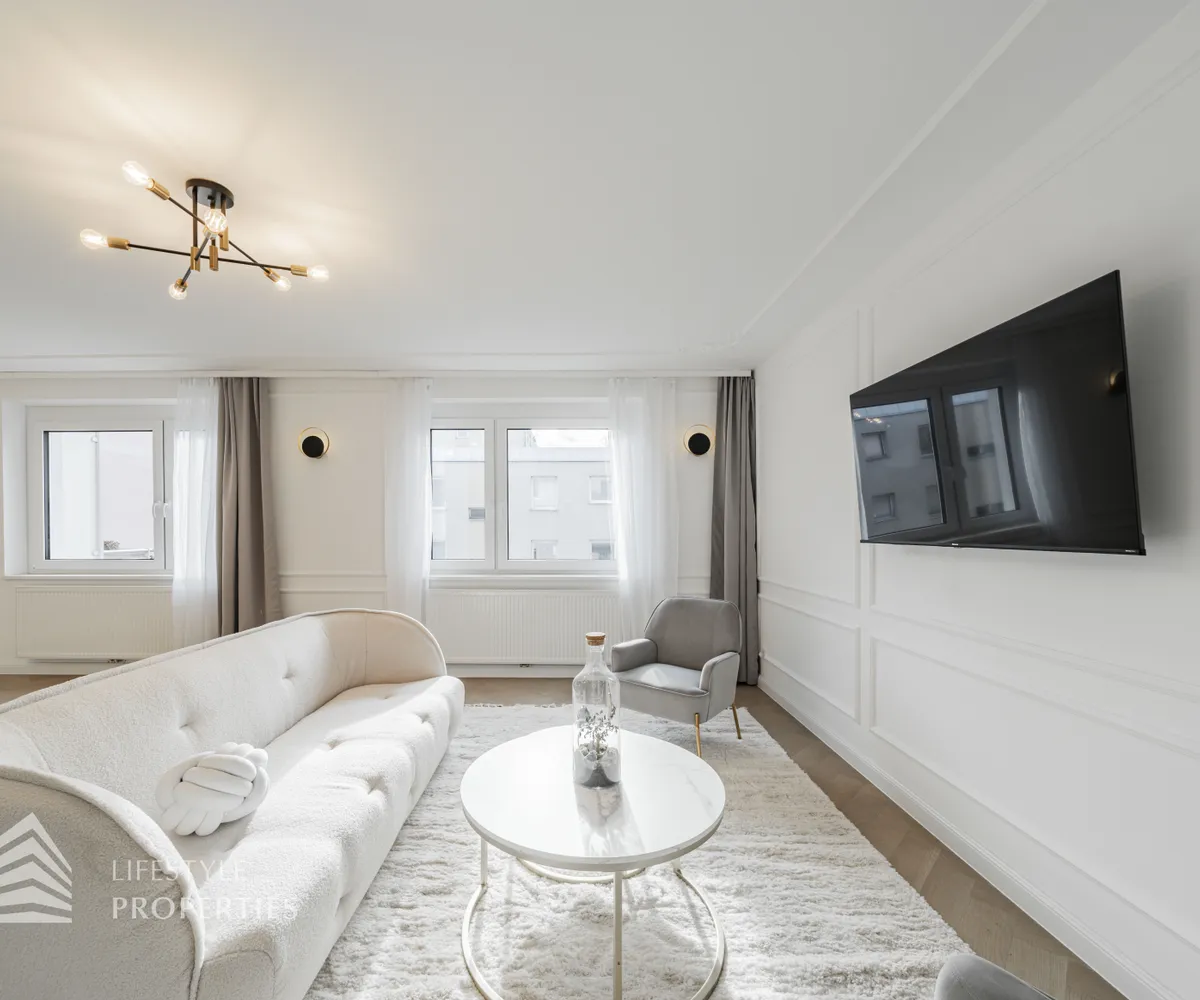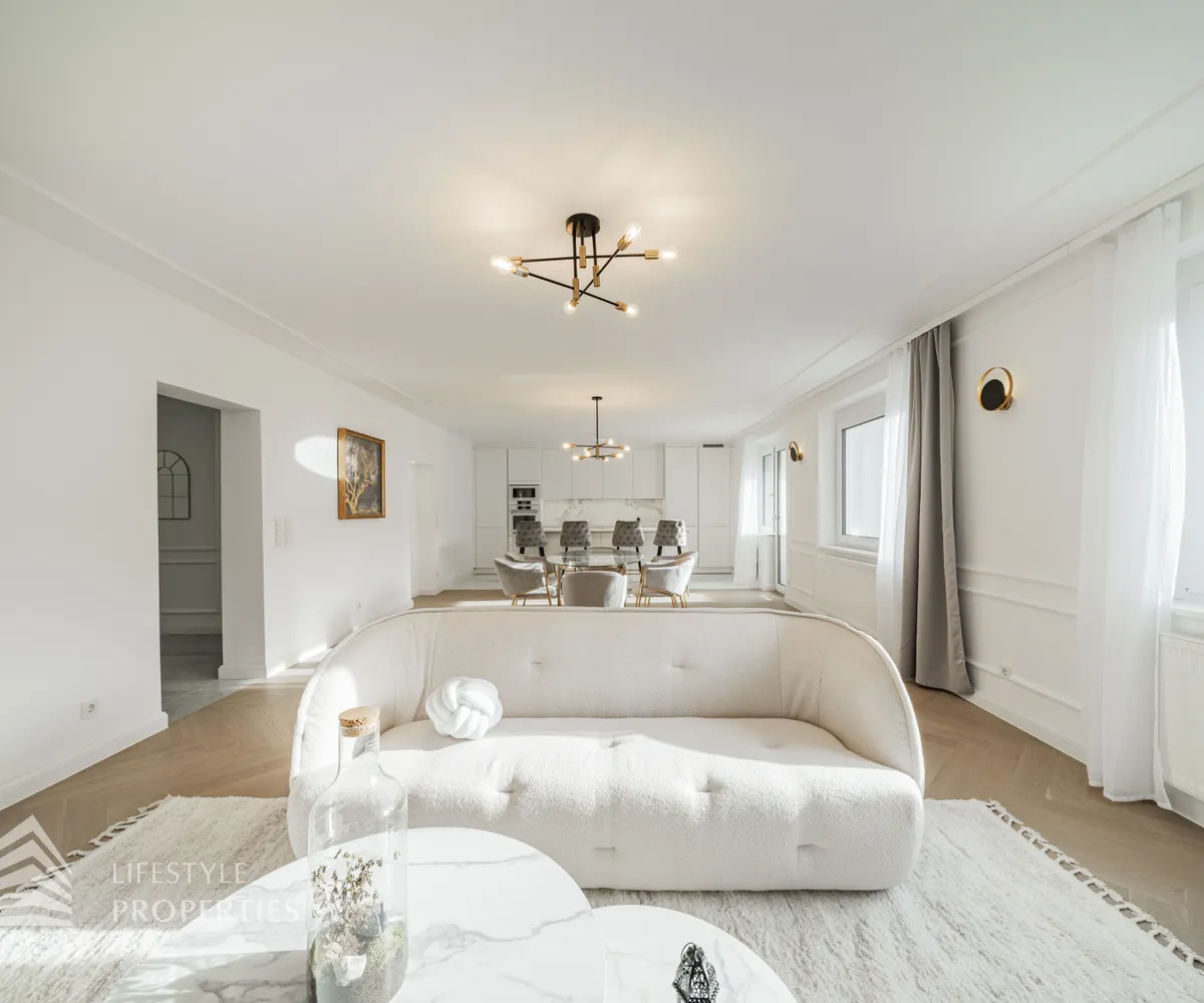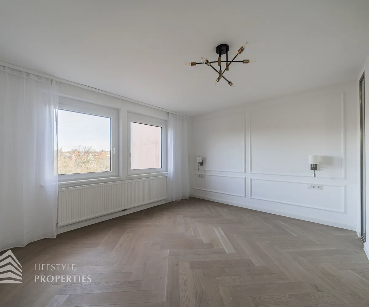 Die Immobilie befindet sich im vierten Liftstock eines im Jahr 1970 erbauten Hauses und weist eine Wohnfläche von ca. 123 m² auf. Die Wohnung teilt sich in einen Vorraum, eine Wohnküche, drei weitere Zimmer, zwei Bäder, ein Gäste-WC, einen Abtstellraum und einen Balkon auf. Die Haupträume sind mit wunderschönem Fischgrätparkett ausgelegt, der Vorraum, der Küchenbereich und die Nassräume sind mit hochwertigen Fliesen ausgekleidet. Die Wohnung verfügt über ein modernes Smart Home System. Es handelt sich um einen Erstbezug. Eine Waschküche im Keller und ein trockenes Kellerabteil sind ebenfalls vorhanden.