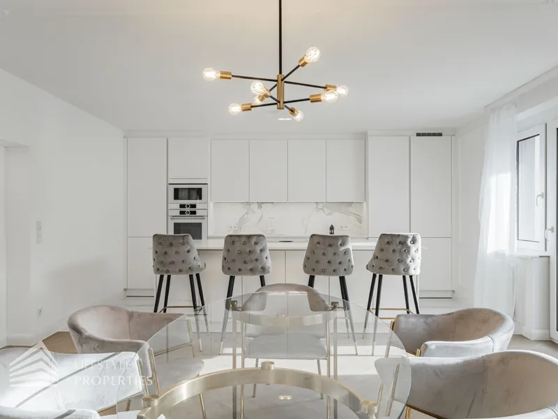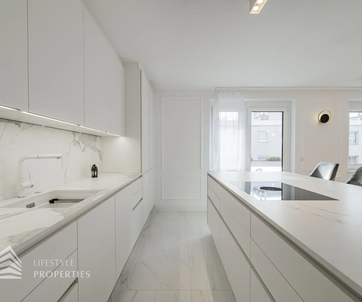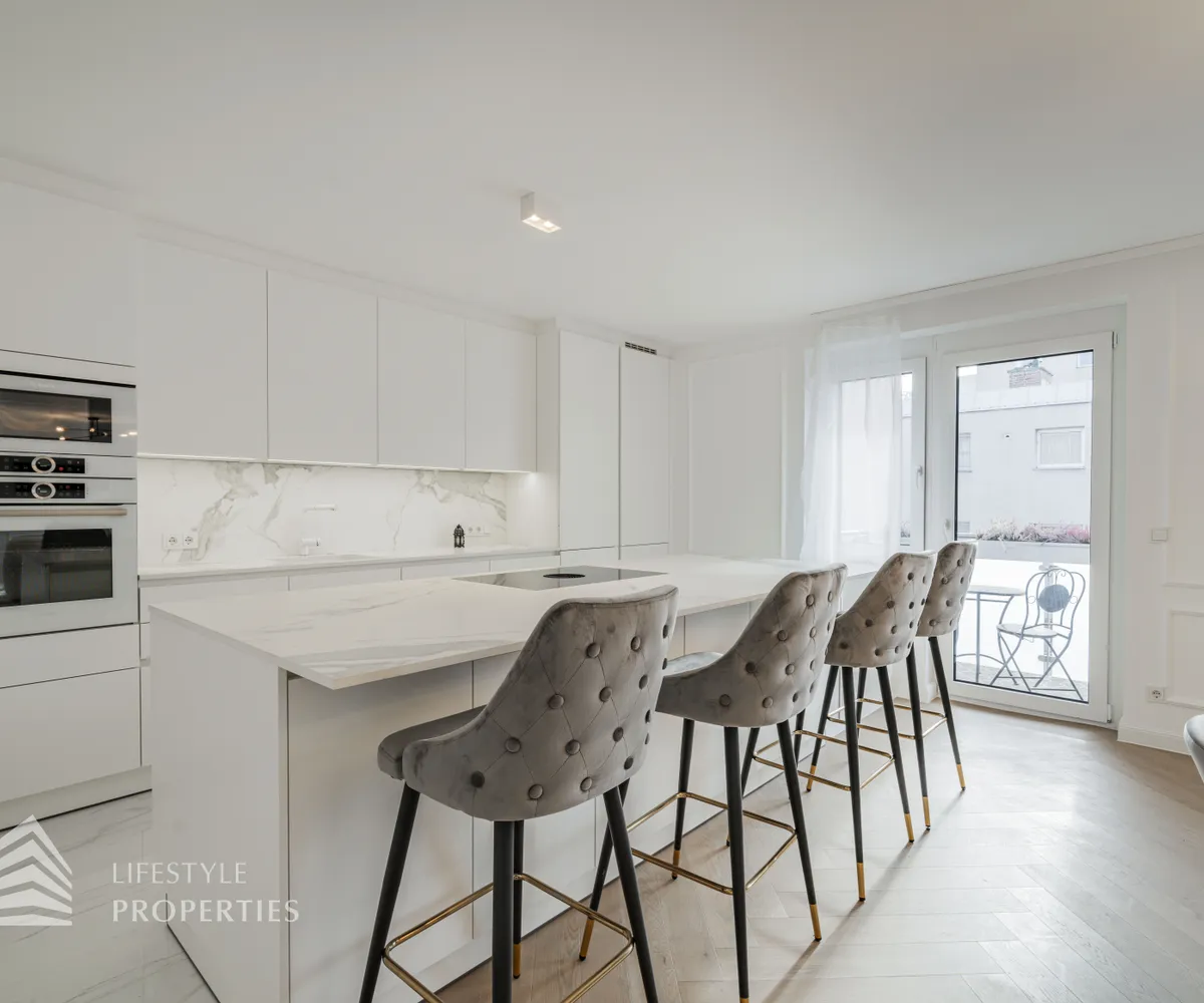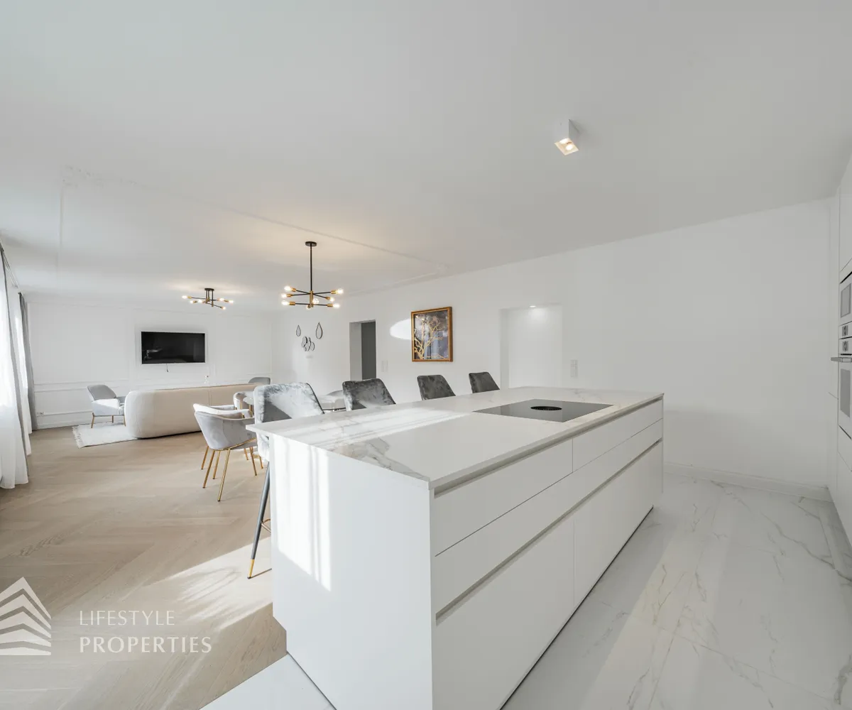 Sie betreten die Wohnung und gelangen in den großzügigen Vorraum, der genügend Platz für eine Garderobe bietet. Rechts finden Sie das Herzstück dieser eleganten Wohnung vor, die ca. 54 m² große Wohnküche mit Zugang zum ca. 4 m² großen Balkon, der Platz für eine gemütliche Sitzgelegenheit zum Entspannen bietet. Die Designerküche ist mit hochwertigen Geräten der Marke Siemens ausgestattet und bietet viel Stauraum. Gegenüber finden Sie die drei weiteren Zimmer vor. Ganz rechts befindet sich das mit ca. 18 m² größte der drei Zimmer, in dem Sie ausreichend Platz für ein großes Bett und einen Kleiderschrank finden. Das Badezimmer en Suite ist mit einer wunderbaren Glasdusche sowie einer Toilette ausgestattet. Hier treffen Sie außerdem auf edle Keramik sowie Designerarmaturen. Das zweite Zimmer bietet mit ca. 10 m² Fläche Platz für ein weiteres Schlafzimmer. Das dritte, etwas kleinere Zimmer könnte beispielsweise als Arbeitszimmer genutzt werden. Vom Vorraum aus erreichen Sie außerdem das zweite Bad, den Abstellraum und das Gäste-WC. Das luxuriöse Bad ist mit einer Dusche sowie einer Badewanne ausgestattet. Die Wohnung wird mittels Elektroheizung beheizt.