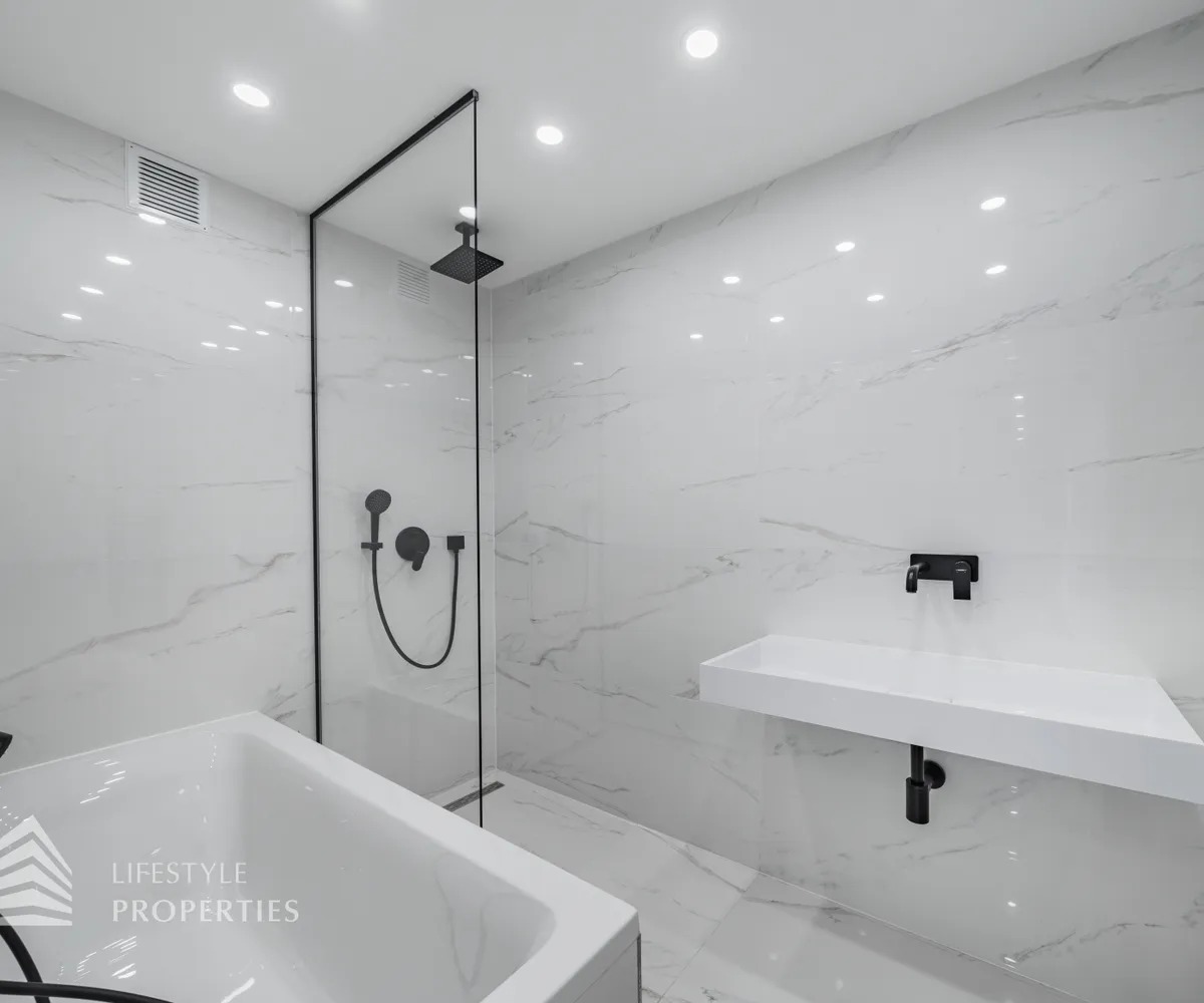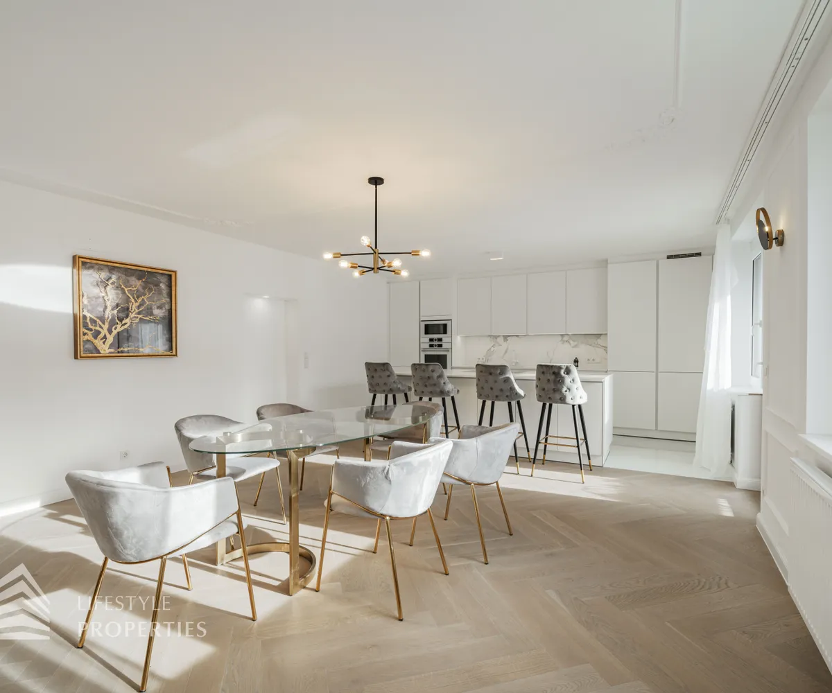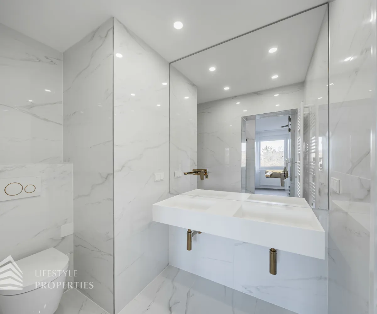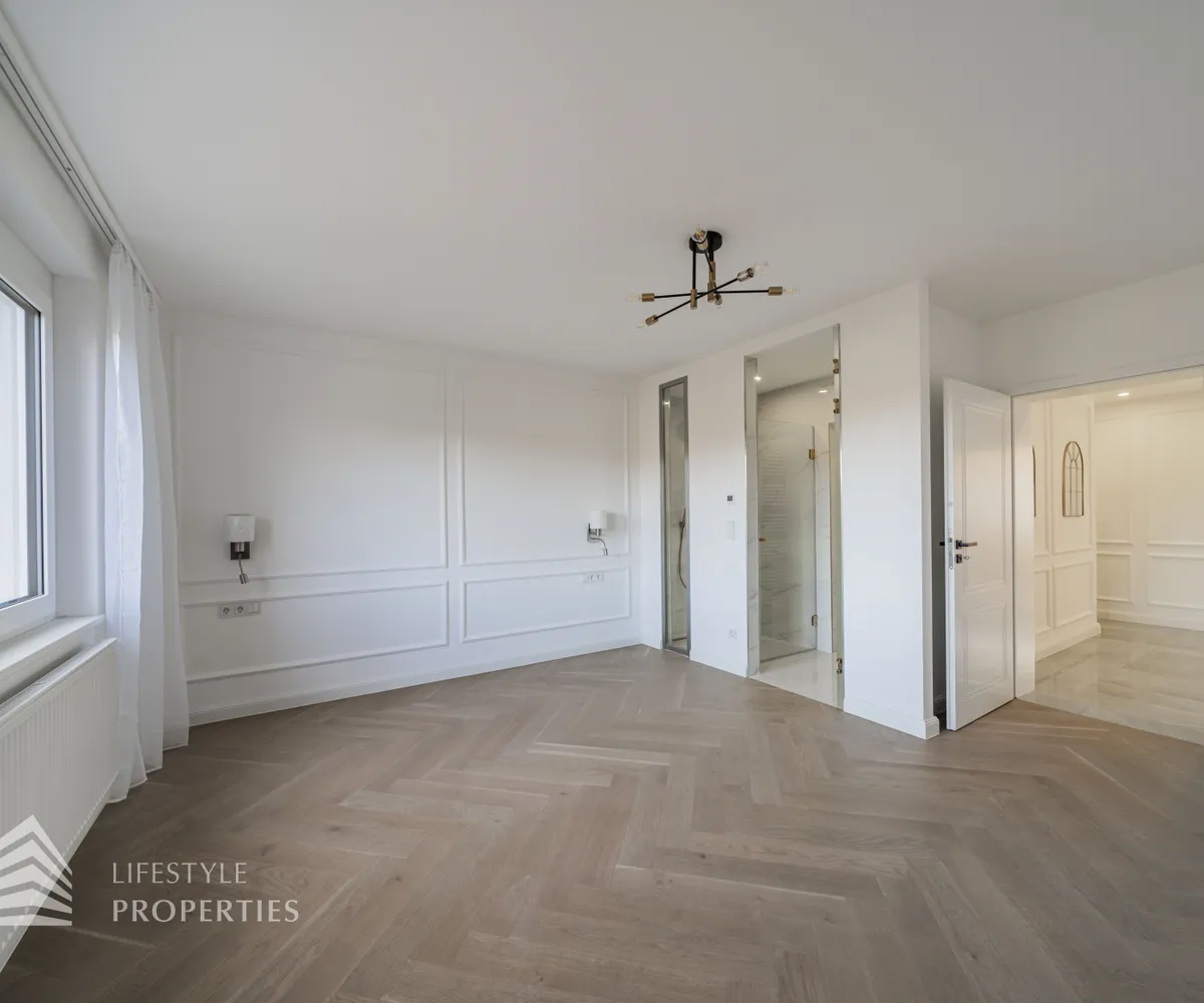 Sie betreten die Wohnung und gelangen in den großzügigen Vorraum, der genügend Platz für eine Garderobe bietet. Rechts finden Sie das Herzstück dieser eleganten Wohnung vor, die ca. 54 m² große Wohnküche mit Zugang zum ca. 4 m² großen Balkon, der Platz für eine gemütliche Sitzgelegenheit zum Entspannen bietet. Die Designerküche ist mit hochwertigen Geräten der Marke Siemens ausgestattet und bietet viel Stauraum. Gegenüber finden Sie die drei weiteren Zimmer vor. Ganz rechts befindet sich das mit ca. 18 m² größte der drei Zimmer, in dem Sie ausreichend Platz für ein großes Bett und einen Kleiderschrank finden. Das Badezimmer en Suite ist mit einer wunderbaren Glasdusche sowie einer Toilette ausgestattet. Hier treffen Sie außerdem auf edle Keramik sowie Designerarmaturen. Das zweite Zimmer bietet mit ca. 10 m² Fläche Platz für ein weiteres Schlafzimmer. Das dritte, etwas kleinere Zimmer könnte beispielsweise als Arbeitszimmer genutzt werden. Vom Vorraum aus erreichen Sie außerdem das zweite Bad, den Abstellraum und das Gäste-WC. Das luxuriöse Bad ist mit einer Dusche sowie einer Badewanne ausgestattet. Die Wohnung wird mittels Elektroheizung beheizt.