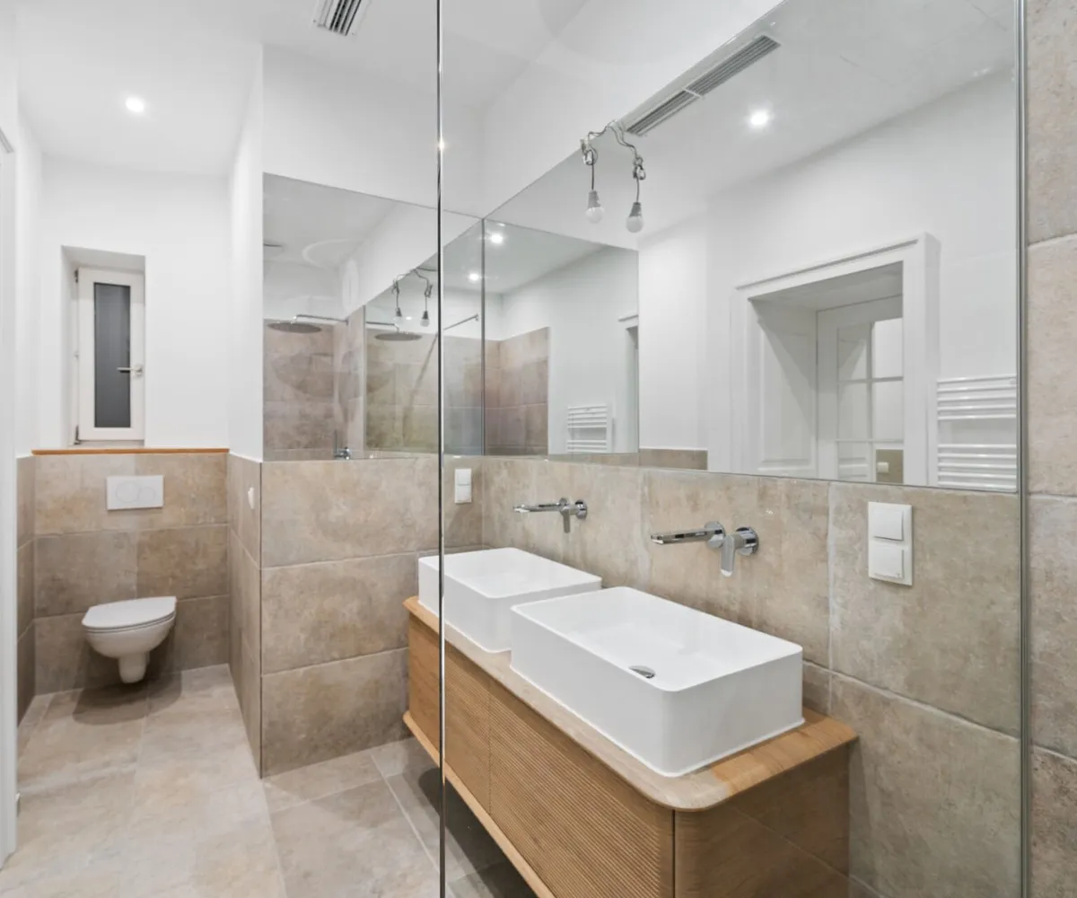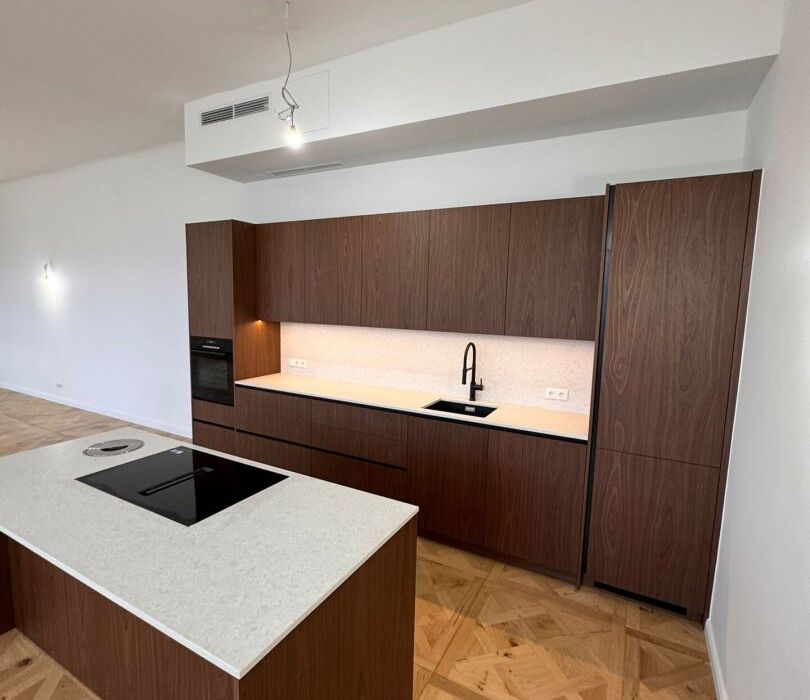 Der Mittelpunkt der Wohnung ist die weitläufige Wohnküche mit hochwertiger Tischlerküche, Kochinsel und Stein-Arbeitsfläche – ein Raum, der sowohl repräsentativ als auch alltagstauglich ist. Zwei Schlafzimmer verfügen jeweils über ein Bad en suite, ergänzt durch ein separates Gäste-WC. Ein großzügiger Abstell- bzw. Technikraum sorgt für Ordnung und Funktionalität.