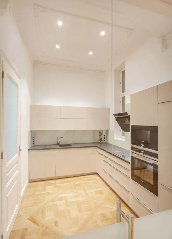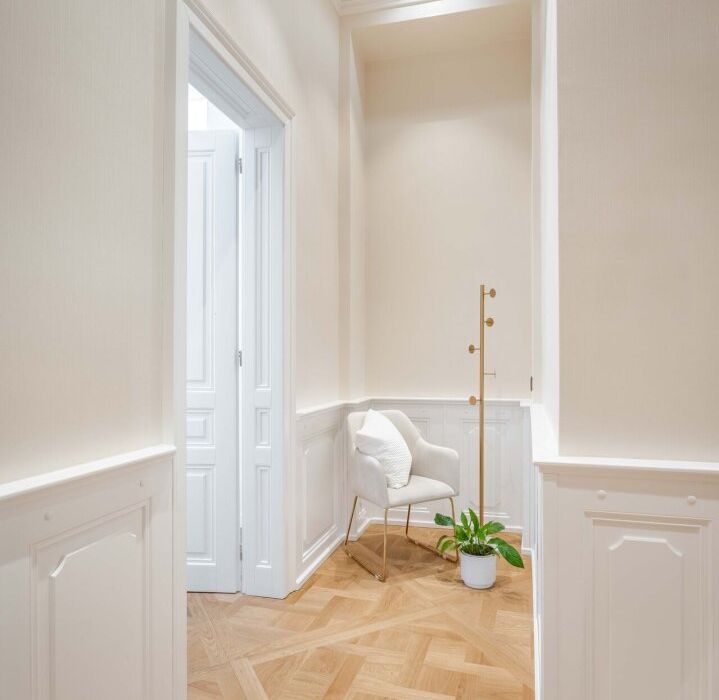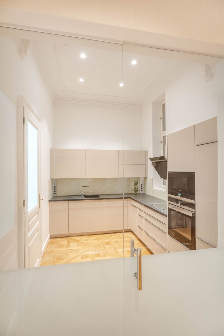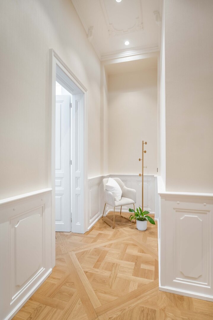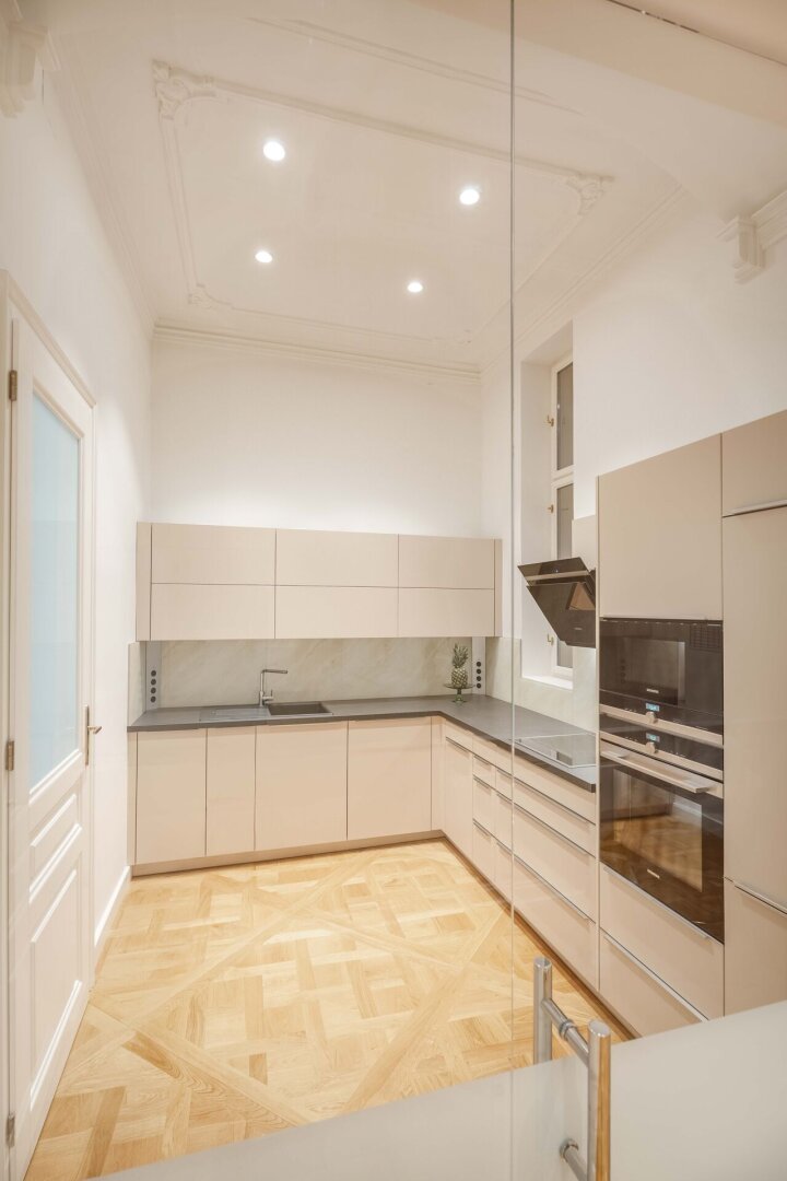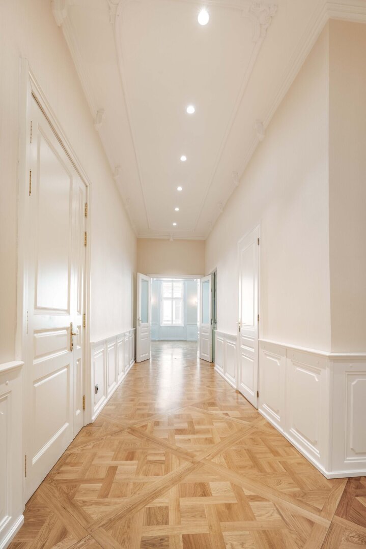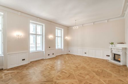 Diese exklusive Altbauwohnung befindet sich im 2. Liftstock eines kernsanierten historischen Palais im Herzen des 1. Bezirks. Auf rund 143 m² Wohnfläche bietet sie eine außergewöhnliche Raumhöhe von ca. 4,2 Metern, klassische Stuckdecken, Flügeltüren und hochwertiges Fischgrätparkett.
