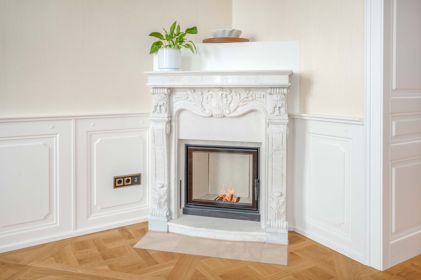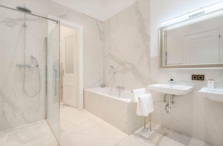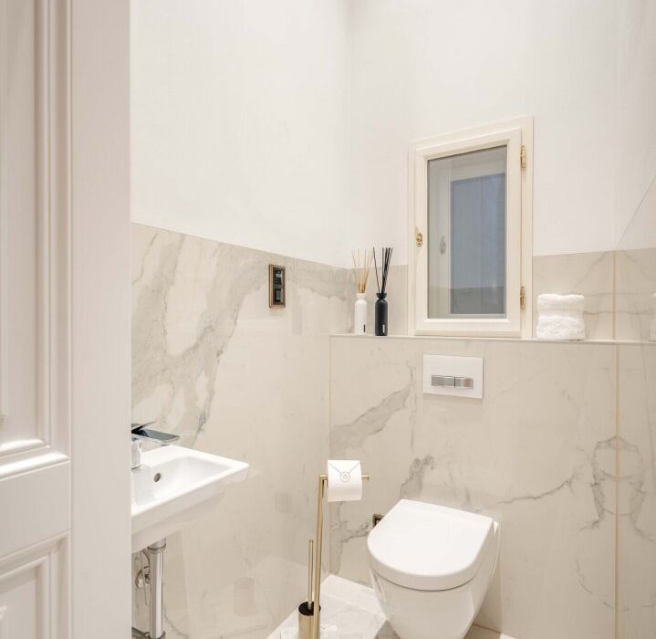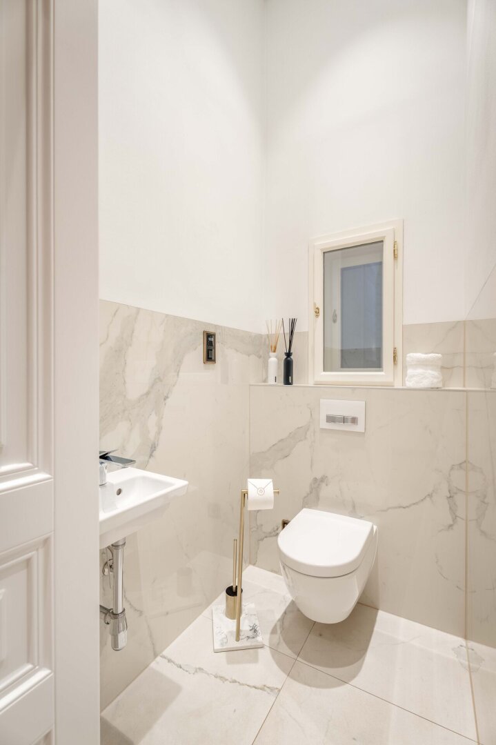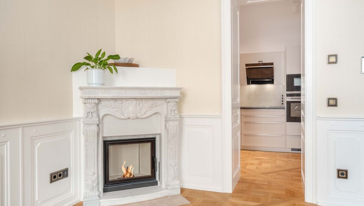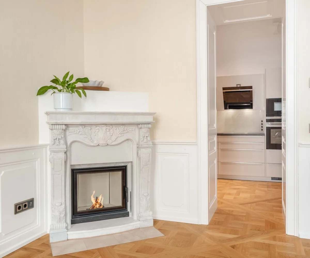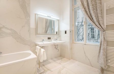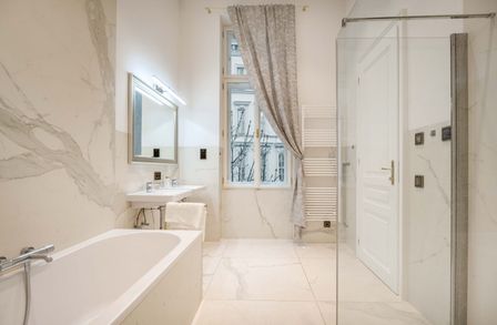 Der repräsentative Salon mit Marmorkamin bildet das Herzstück der Wohnung. Das Schlafzimmer liegt ruhig zum Innenhof und ist über ein angrenzendes Kabinett ergänzt, das sich ideal als Ankleide, Homeoffice oder Gästezimmer eignet. Ein elegantes Marmorbad mit Fenster, Badewanne, bodentiefer Dusche und WC sowie ein separates Gäste-WC und ein voll ausgestatteter Hauswirtschaftsraum runden das Raumangebot ab.