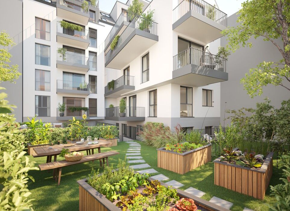 Die 21 Wohnungen – vom kompakten City-Apartment bis zur großzügigen Dachgeschosswohnung – überzeugen durch hochwertige Ausstattung: Echtholzparkett, Fußbodenheizung, elegante Feinsteinzeugfliesen, bodenbündige Duschen mit Glasabtrennung und elektrische Außenraffstores sorgen für Komfort und Stil. Große Fensterflächen bringen viel Licht in die Wohnräume, während Terrassen, Balkone oder Eigengärten private Freiräume im Grünen schaffen.