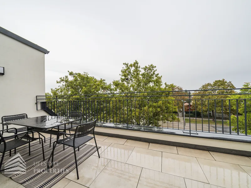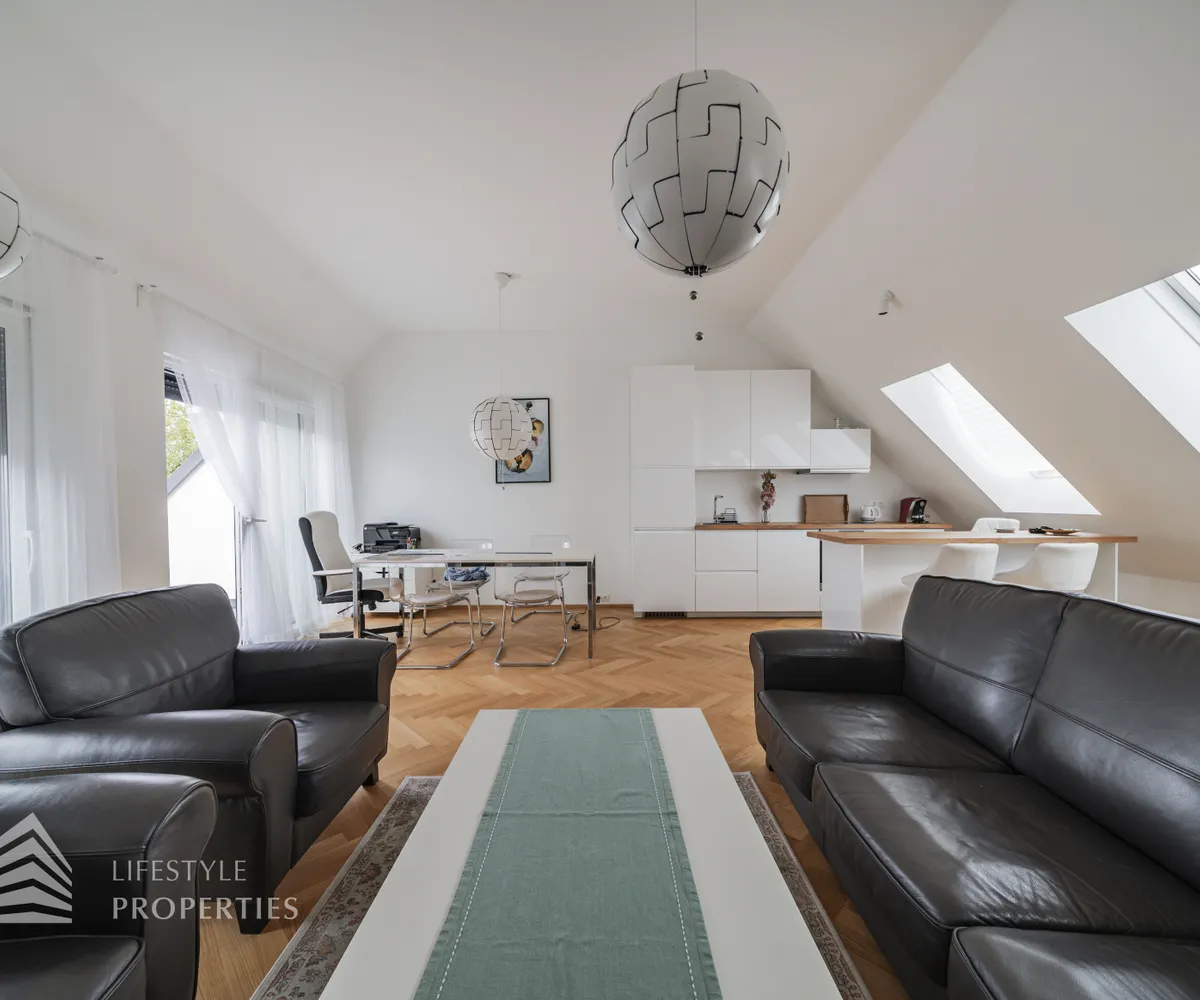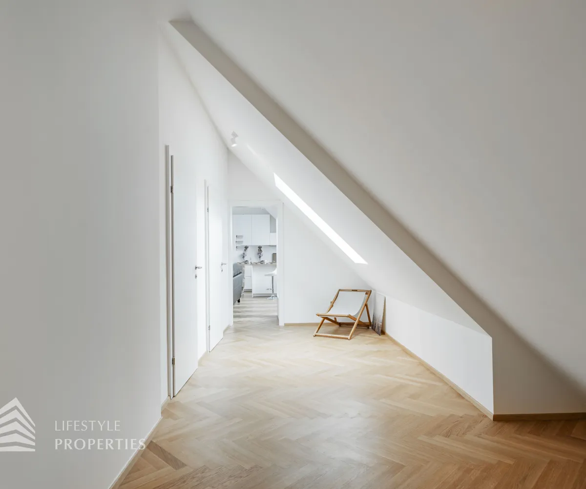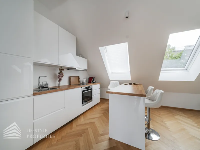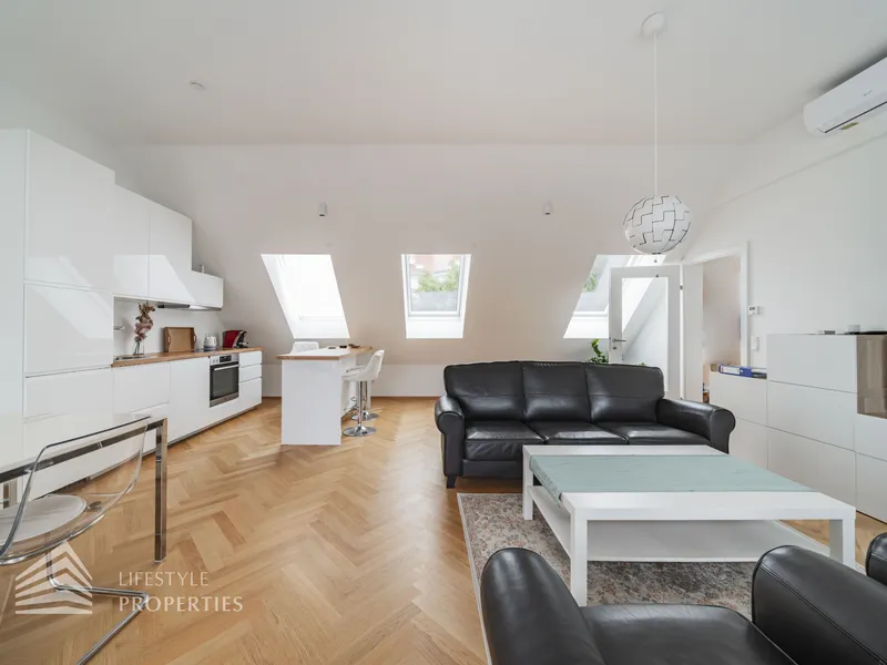 mit einer Fläche von ca. 75 m² liegt im Dachgeschoss eines 2022 fertiggestellten Neubaus und ist bequem über einen Personenaufzug erreichbar. Beim Betreten der Wohnung gelangen Sie in den hellen Vorraum, welcher ausreichend Platz für eine Garderobe und viele Gestaltungsmöglichkeiten bietet. Gegenüber der Eingangstüre gelangen Sie in die geräumige Wohnküche mit Zugang zur Terrasse. Der helle Wohnraum mit einer Fläche von ca. 38 m² wird beidseitig mit natürlichem Licht durchflutet. Hier haben Sie ausreichend Platz für eine Couchlandschaft, einen Esstisch sowie weitere Möbel. Eine moderne Einbauküche ist bereits im Kaufpreis inkludiert. Die überaus großzügige Fläche des Raumes bietet zudem, wie auf dem beigefügten Plan bereits ersichtlich, die Möglichkeit den Raum zu trennen um ein weiteres Zimmer zu schaffen. Auf der über 18 m² großen Terrasse können Sie Ihren Vorstellungen und Wünschen bei der Gestaltung Ihrer Wohlfühloase freien Lauf lassen.