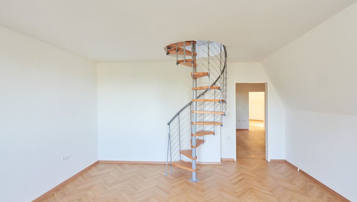• Wendeltreppe führt in den Dachboden mit zusätzlichem Stauraum oder Spielbereich