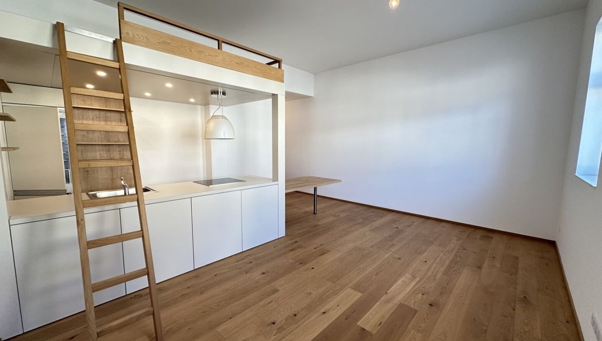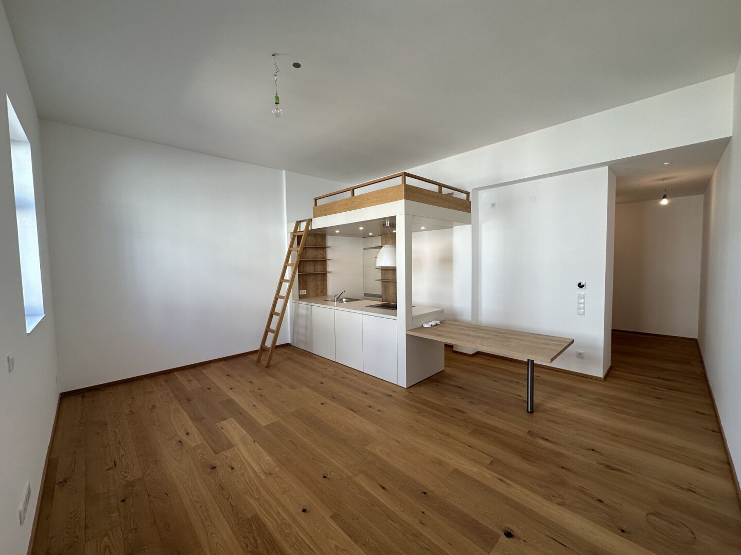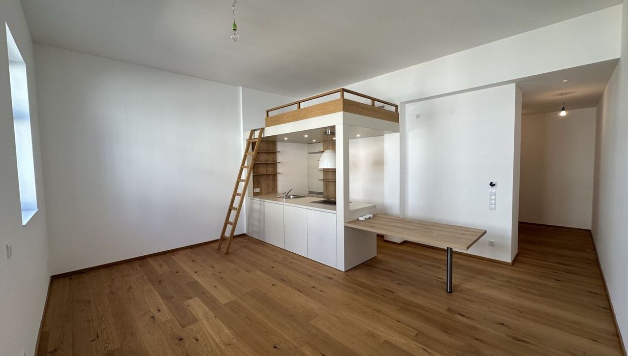 • Wohn-/Schlafbereich mit integrierter Kochnische und fix verbautem Hochbett – platzsparend & gemütlich