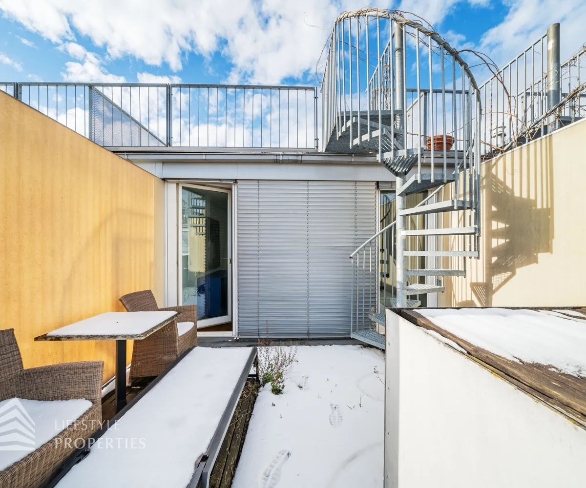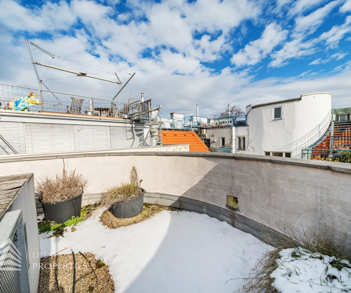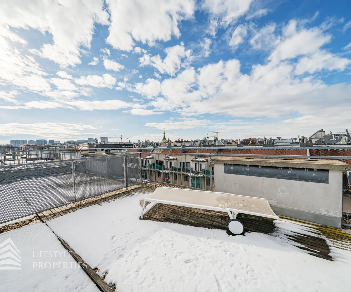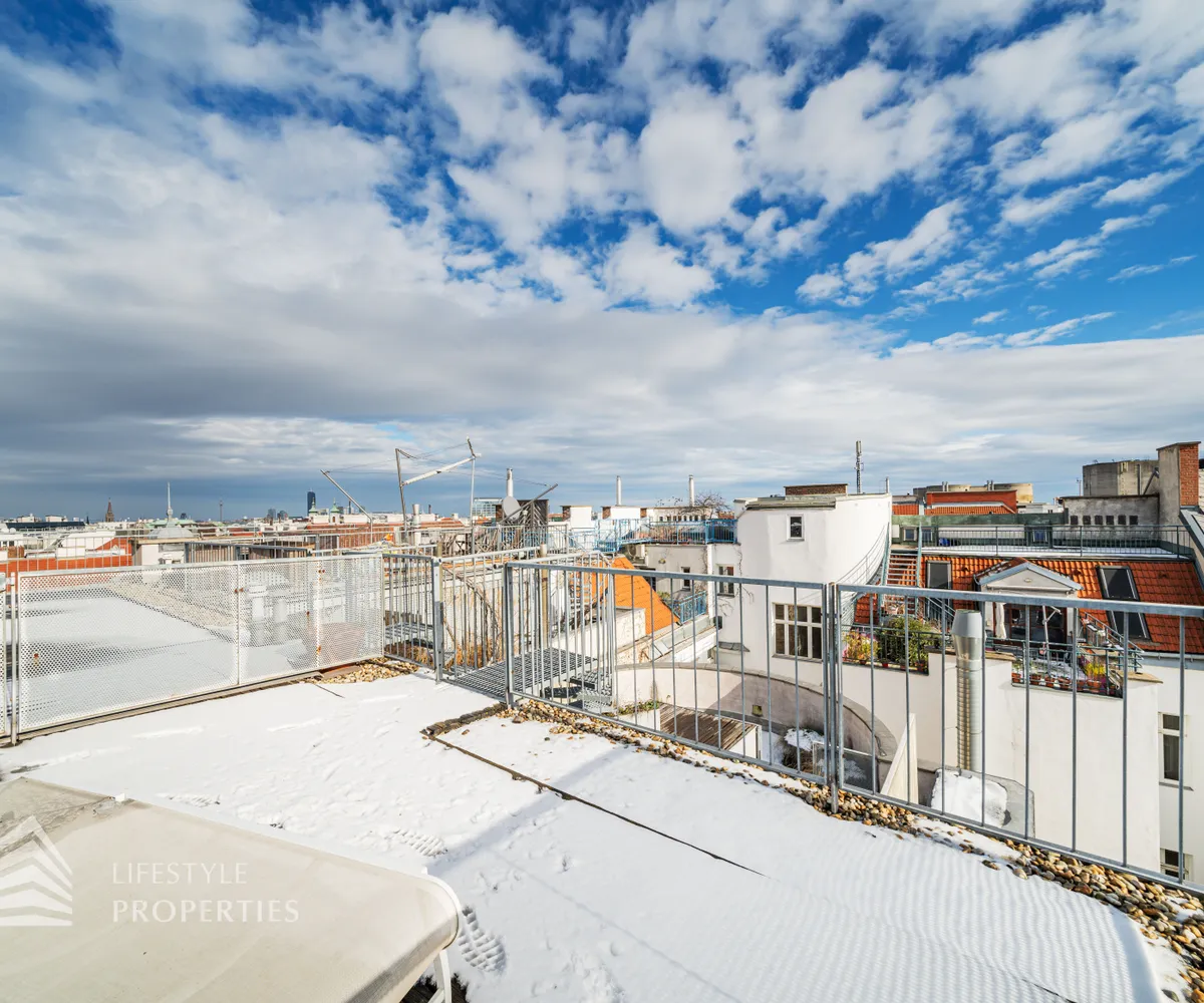 Bei Betreten der Wohnung gelangen Sie in den ca. 3 m² großen Vorraum. Links von Ihnen befindet sich das ca. 5 m² große, mit Badewanne, Waschtisch und Waschmaschinenanschluss ausgestattete, Badezimmer. Rechts von Ihnen befindet sich das WC. Der Vorraum führt Sie gerade hindurch in die moderne Küche, welche geschickt vom Wohnraum abgetrennt ist, aber dennoch dank einem gut geplanten Wanddurchbruch wie eine offen gestaltete Wohnküche wirkt. Vis-à-vis der Küche ist eine große Nische, welche Platz für einen riesigen Einbauschrank und genug Stauraum bietet. Den lichtdurchfluteten Wohnraum erreichen Sie, wenn Sie vom Vorraum gerade an der Küche vorbeigehen. Auf einer Fläche von ca. 44 m² haben Sie genügend Platz für einen großen Esstisch und eine gemütliche Sofalandschaft. Der Raum wird von einer Fensterfront ganztägig mit viel Licht durchflutet. Hinter der Glasfront verbirgt sich eine der Terrassen. Sie können diese über den Wohnraum betreten. Auf der ca. 12 m² großen Terrasse, welche sich über die gesamte Wohnlänge erstreckt, haben Sie ausreichend Platz für einen gemütlichen Frühstückstisch und weitere Möbel um die frische Luft genießen zu können. Zurück im Wohnraum, über die Treppe gelangen Sie in das nächste Geschoss. Die Treppe führt Sie direkt in das ca. 17 m² große Schlafzimmer. Das zugehörige Badezimmer, welches mit einer Dusche, einem Waschbecken und einer Toilette ausgestattet ist, kann direkt vom Schlafzimmer aus betreten werden. Im Schlafzimmer können Sie einen kleinen Arbeitsbereich mit einem Schreibtisch und einen Schlafbereich mit einem großes Bett schaffen. Die Fensterfront, welches den kompletten Raum mit viel natürlichem Licht durchflutet sorgt für eine angenehme Wohlfühlatmosphäre. Von dem Schlafzimmer können Sie die ruhige Richtung Innenhof gelegene ca. 14 m² große Terrasse sowie das absolute Highlight der Wohnung betreten. Eine Wendeltreppe führt Sie von der Terrasse auf die ca. 12 m² große Dachterrasse, welche Ihnen einen 360° Stadtblick über die Dächer Wiens bietet. Hier können Sie Ihre Wohlfühloase mitten in Wien errichten.