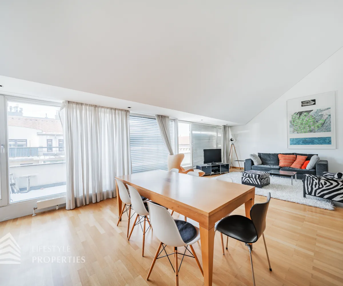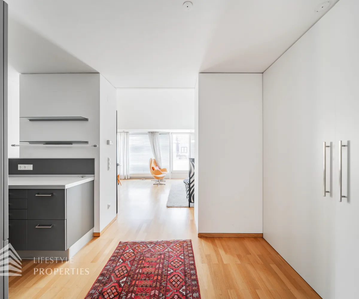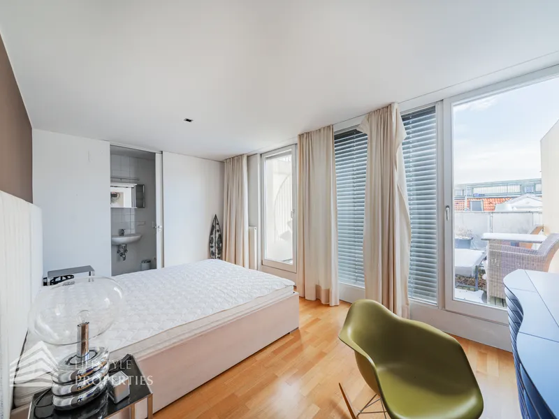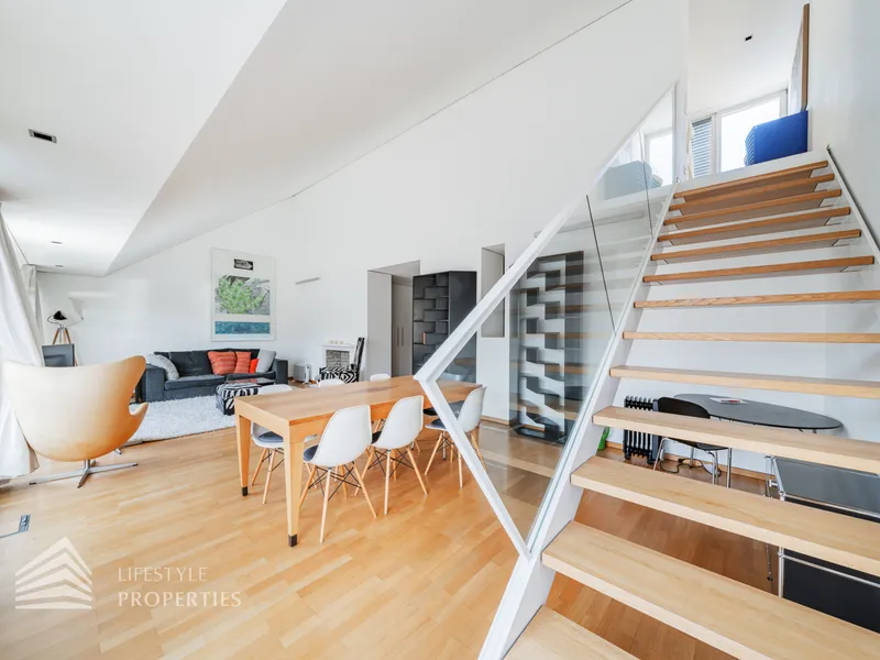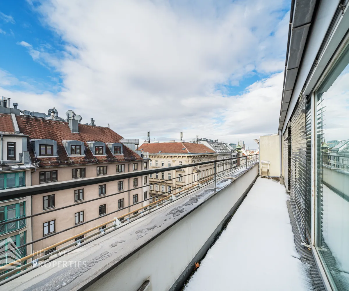 Bei Betreten der Wohnung gelangen Sie in den ca. 3 m² großen Vorraum. Links von Ihnen befindet sich das ca. 5 m² große, mit Badewanne, Waschtisch und Waschmaschinenanschluss ausgestattete, Badezimmer. Rechts von Ihnen befindet sich das WC. Der Vorraum führt Sie gerade hindurch in die moderne Küche, welche geschickt vom Wohnraum abgetrennt ist, aber dennoch dank einem gut geplanten Wanddurchbruch wie eine offen gestaltete Wohnküche wirkt. Vis-à-vis der Küche ist eine große Nische, welche Platz für einen riesigen Einbauschrank und genug Stauraum bietet. Den lichtdurchfluteten Wohnraum erreichen Sie, wenn Sie vom Vorraum gerade an der Küche vorbeigehen. Auf einer Fläche von ca. 44 m² haben Sie genügend Platz für einen großen Esstisch und eine gemütliche Sofalandschaft. Der Raum wird von einer Fensterfront ganztägig mit viel Licht durchflutet. Hinter der Glasfront verbirgt sich eine der Terrassen. Sie können diese über den Wohnraum betreten. Auf der ca. 12 m² großen Terrasse, welche sich über die gesamte Wohnlänge erstreckt, haben Sie ausreichend Platz für einen gemütlichen Frühstückstisch und weitere Möbel um die frische Luft genießen zu können. Zurück im Wohnraum, über die Treppe gelangen Sie in das nächste Geschoss. Die Treppe führt Sie direkt in das ca. 17 m² große Schlafzimmer. Das zugehörige Badezimmer, welches mit einer Dusche, einem Waschbecken und einer Toilette ausgestattet ist, kann direkt vom Schlafzimmer aus betreten werden. Im Schlafzimmer können Sie einen kleinen Arbeitsbereich mit einem Schreibtisch und einen Schlafbereich mit einem großes Bett schaffen. Die Fensterfront, welches den kompletten Raum mit viel natürlichem Licht durchflutet sorgt für eine angenehme Wohlfühlatmosphäre. Von dem Schlafzimmer können Sie die ruhige Richtung Innenhof gelegene ca. 14 m² große Terrasse sowie das absolute Highlight der Wohnung betreten. Eine Wendeltreppe führt Sie von der Terrasse auf die ca. 12 m² große Dachterrasse, welche Ihnen einen 360° Stadtblick über die Dächer Wiens bietet. Hier können Sie Ihre Wohlfühloase mitten in Wien errichten.
