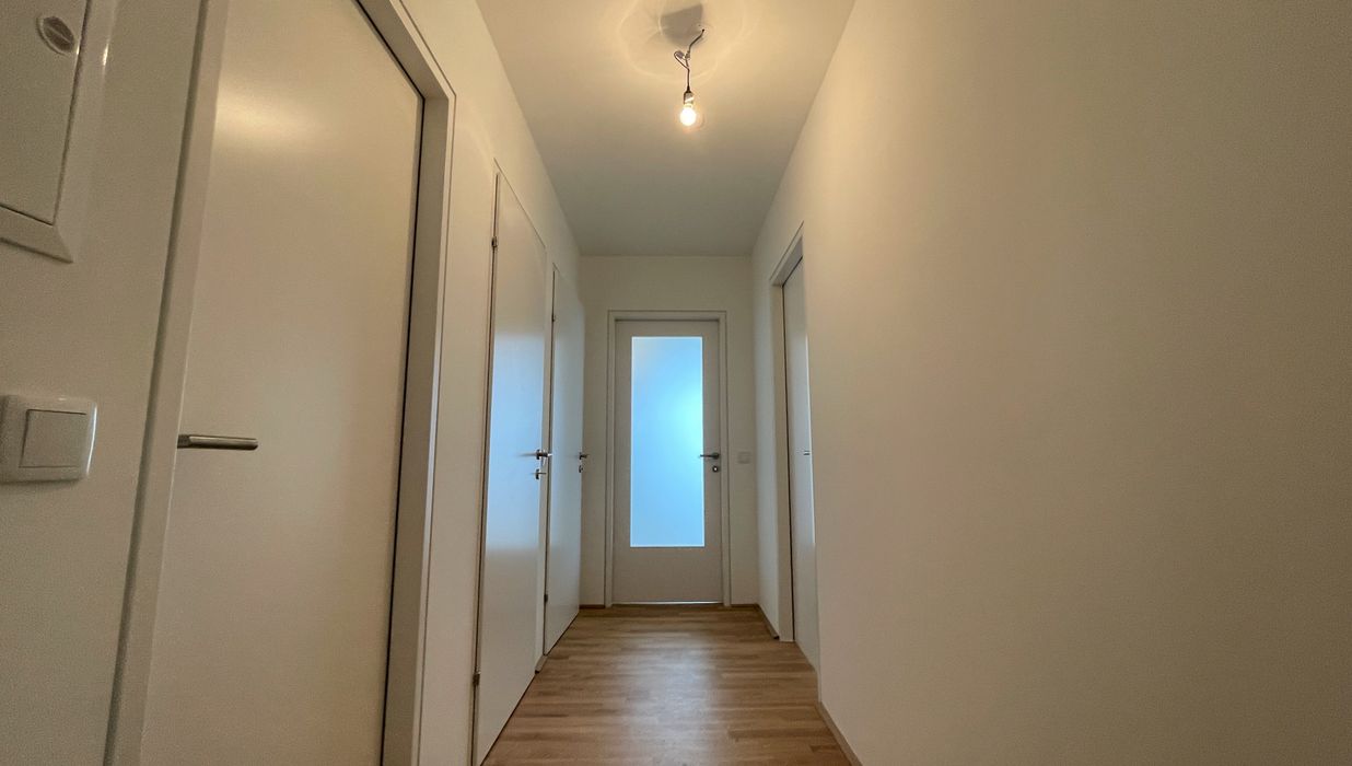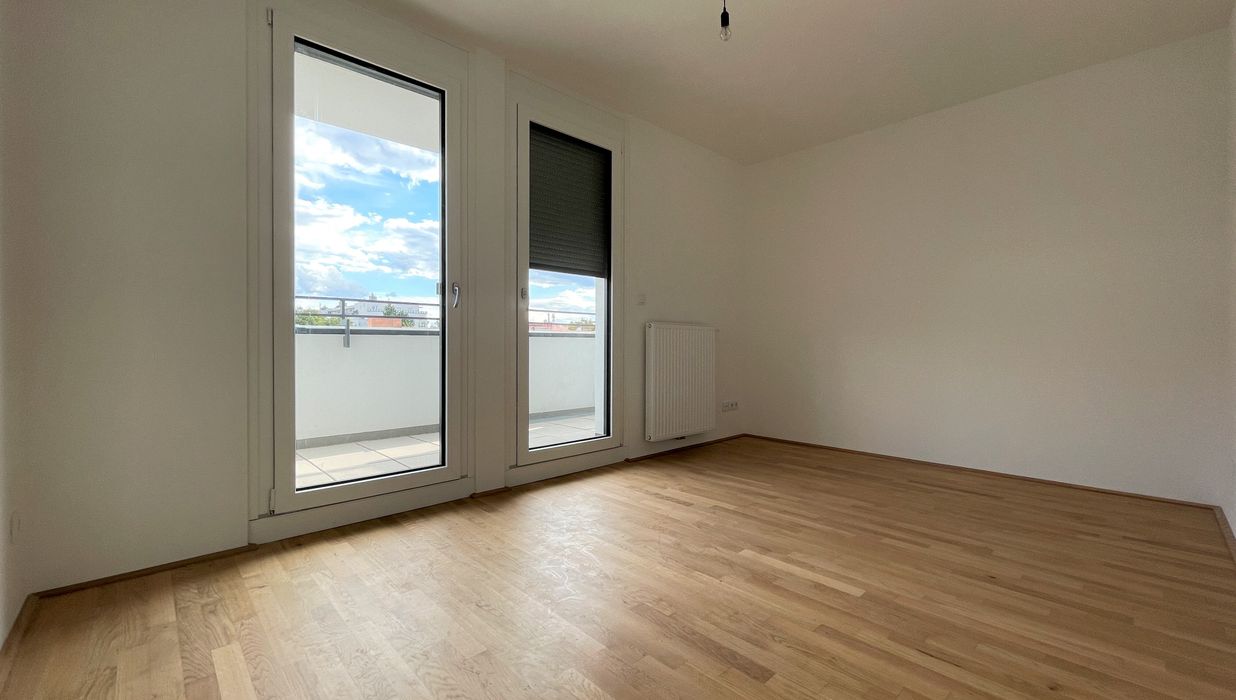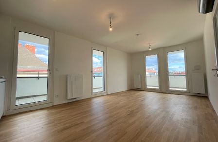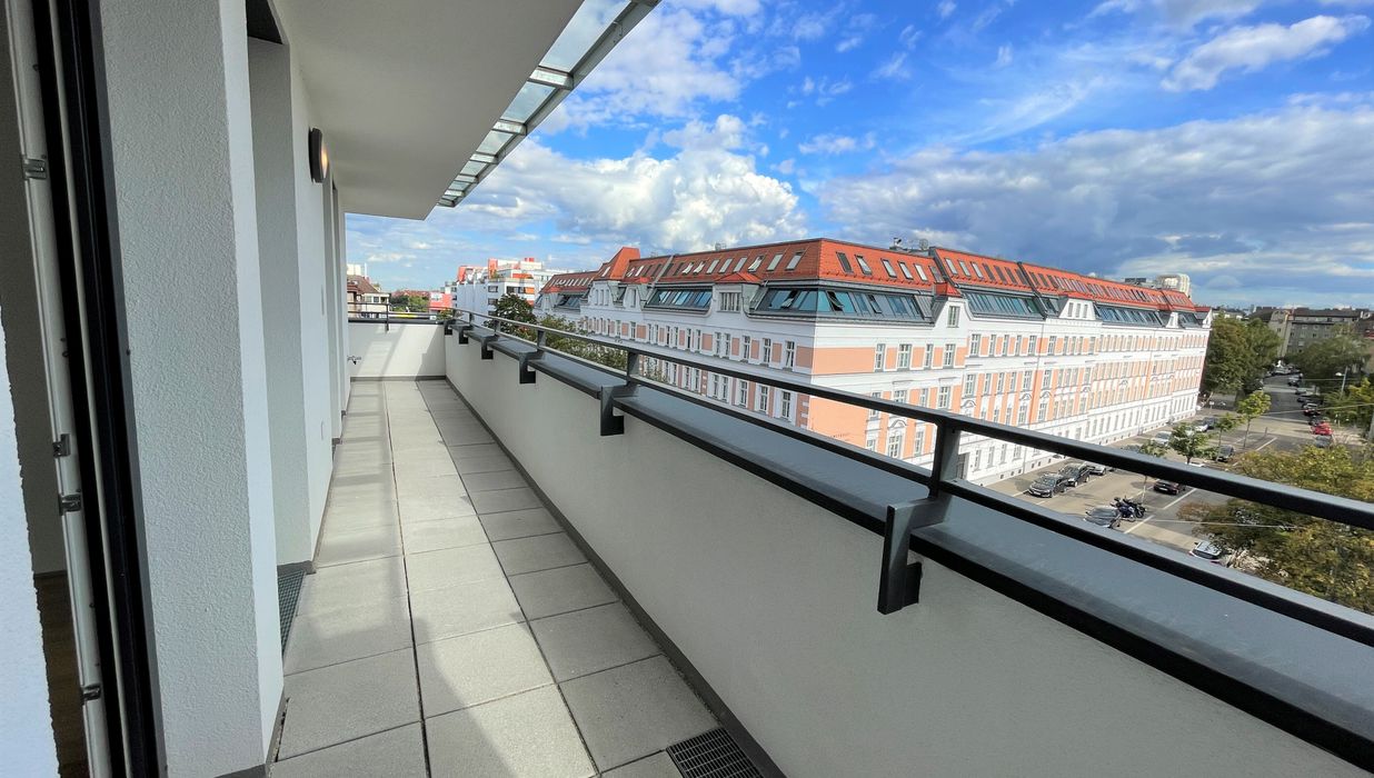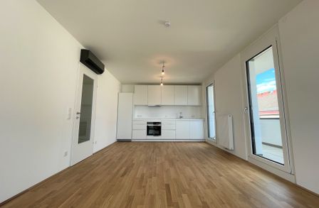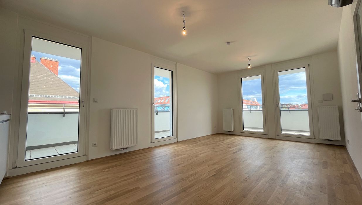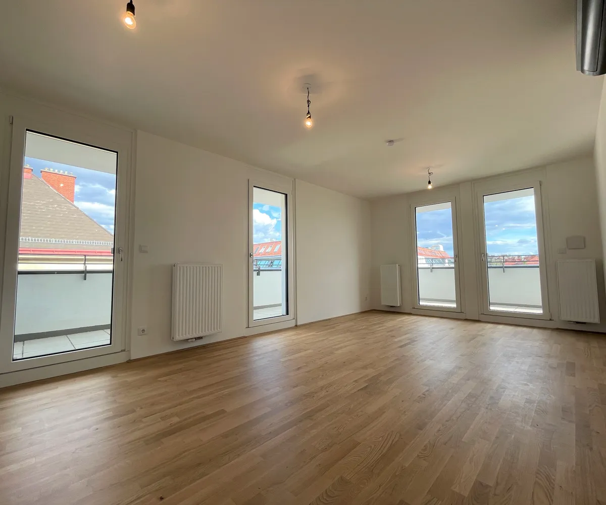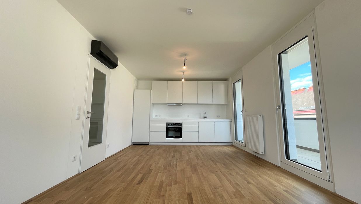 Die Wohnung befindet sich im ersten Dachgeschoss des 2022 fertiggestellten Neubauprojekts und ist durch die Ecklage und die Ausrichtung nach Osten wie auch Süden lichtdurchflutet und bietet insgesamt sechs Zugänge zur 21m² großen Terrasse. Gegliedert ist die klimatisierbare Wohnung in einen zentralen Vorraum von dem aus sowohl das Badezimmer mit Badewanne, das separate WC, der Abstellraum mit Waschmaschinenanschluss sowie das Schlafzimmer und die gut aufgeteilte Wohnküche zugänglich sind.