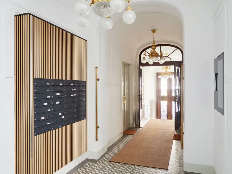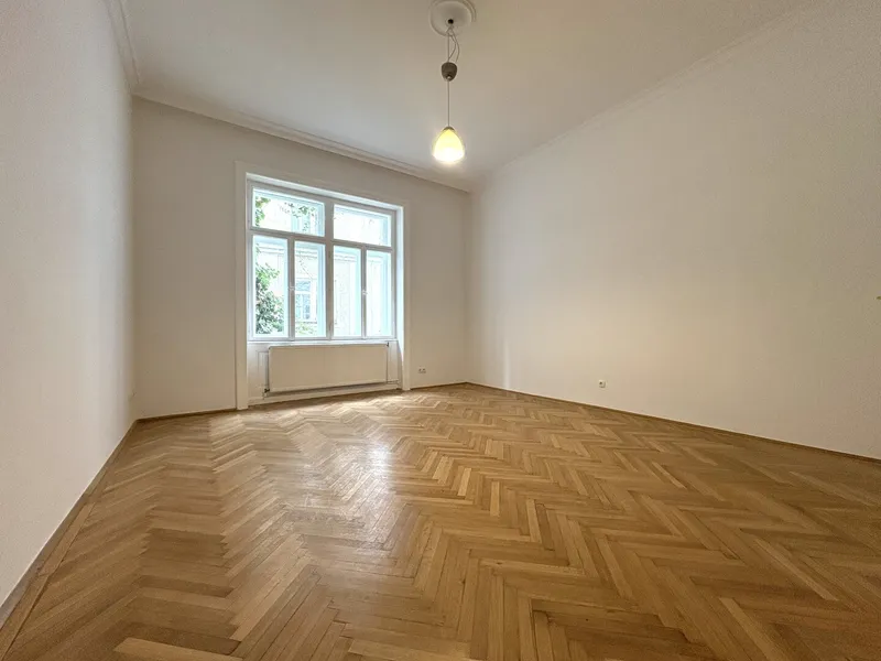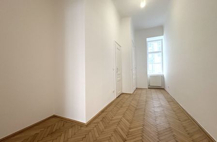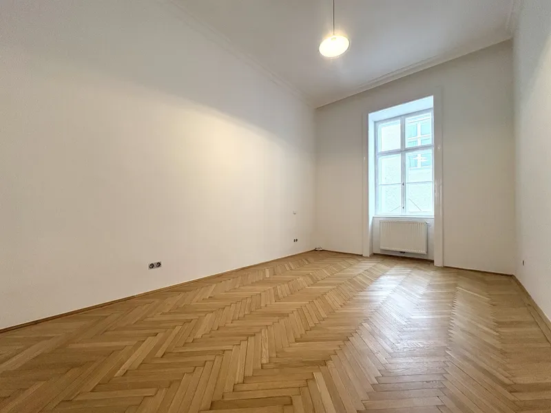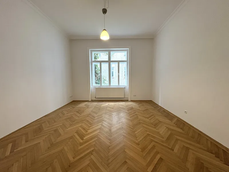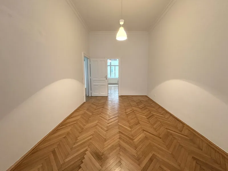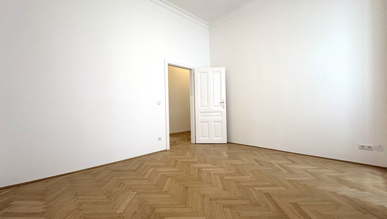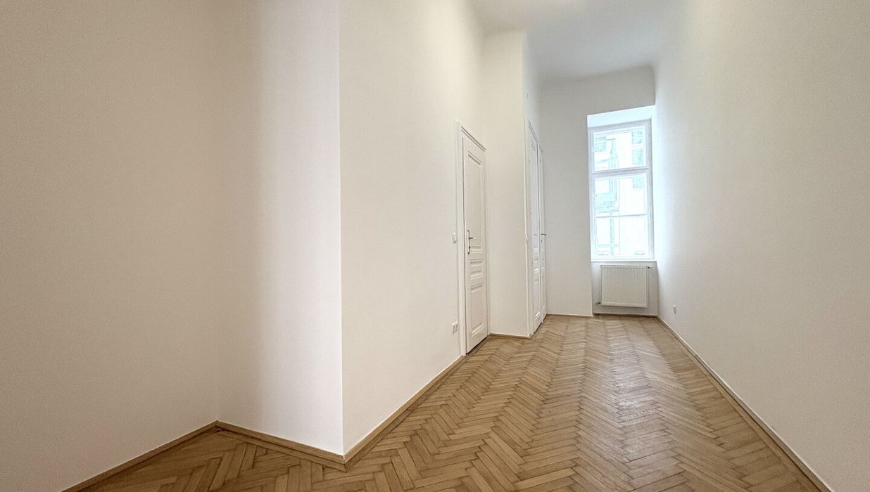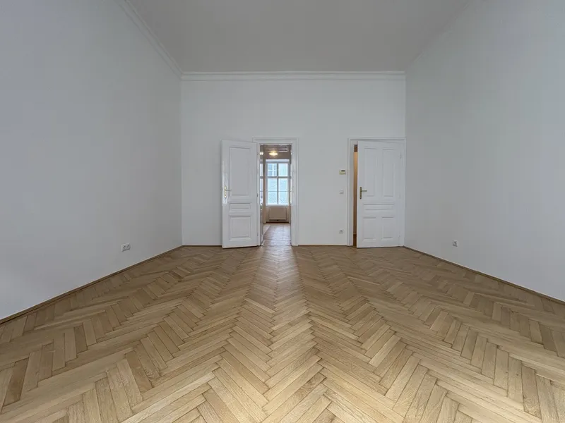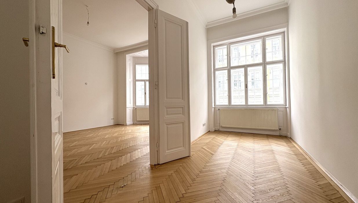 Die Wohnung liegt im Mezzanin, leicht erhöht und damit abgeschirmt vom direkten Straßenleben. Die Kombination aus Straßen- und Innenhofausrichtung sorgt für Helligkeit und Ruhe zugleich. Der klassische Grundriss bietet eine hervorragende Basis für individuelle Gestaltung – ob zeitlos elegant oder modern interpretiert.