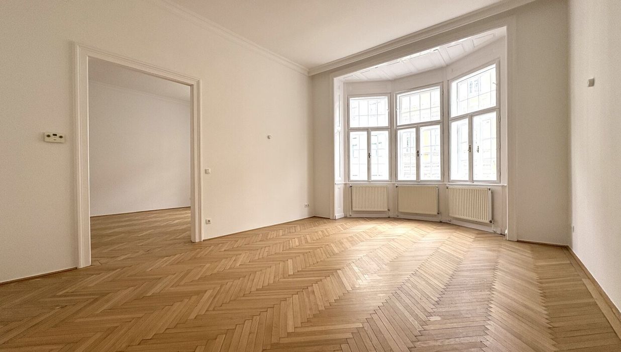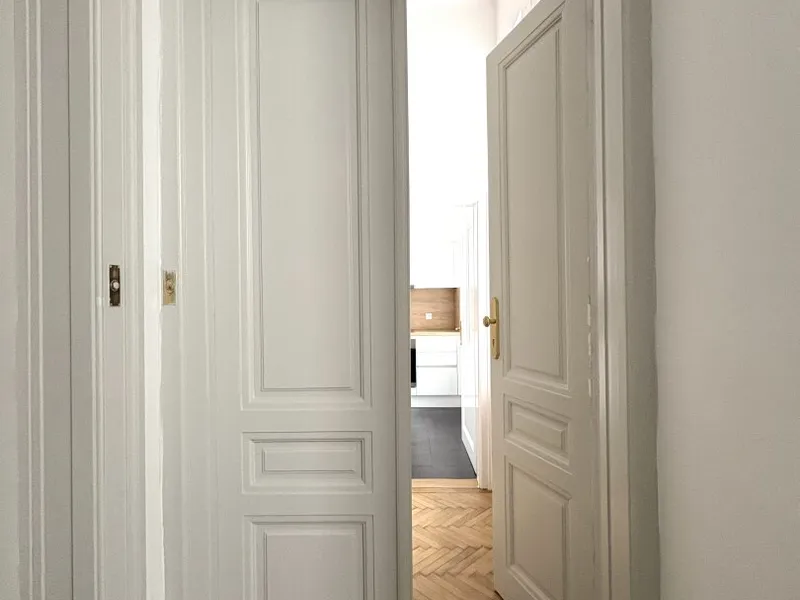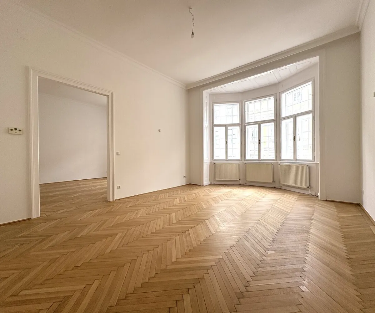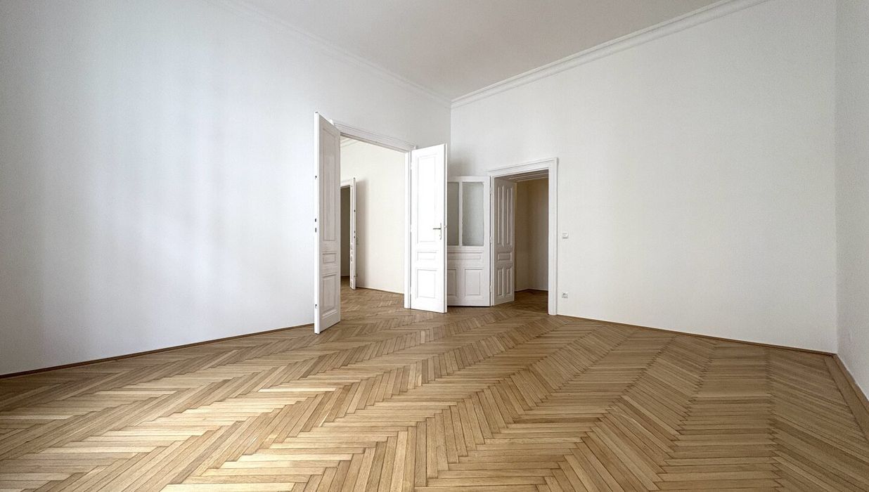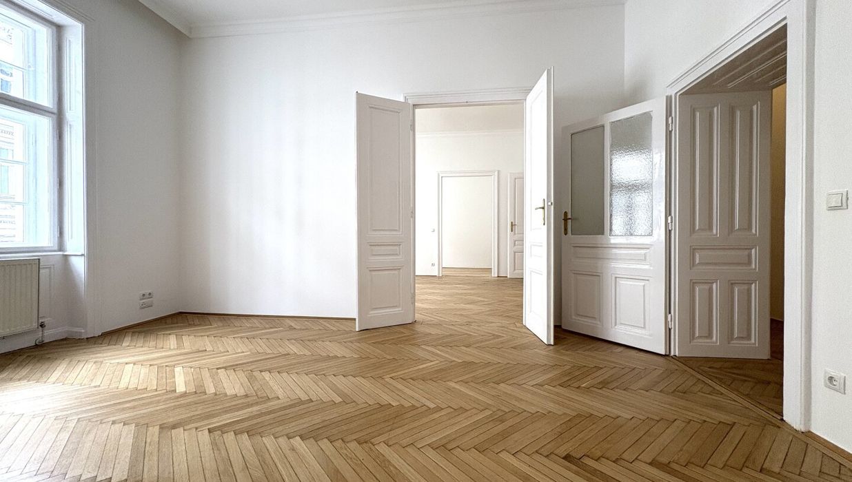 Top 13 ist eine klassische Wiener Altbauwohnung mit einer selten gut funktionierenden Aufteilung. Auf 103,80 m² Wohnfläche verteilen sich vier separat begehbare Zimmer, ein großzügiger Wohnraum, eine eigene Küche, Bad und separates WC sowie ein zentraler Vorraum, der die Wohnung sauber erschließt.