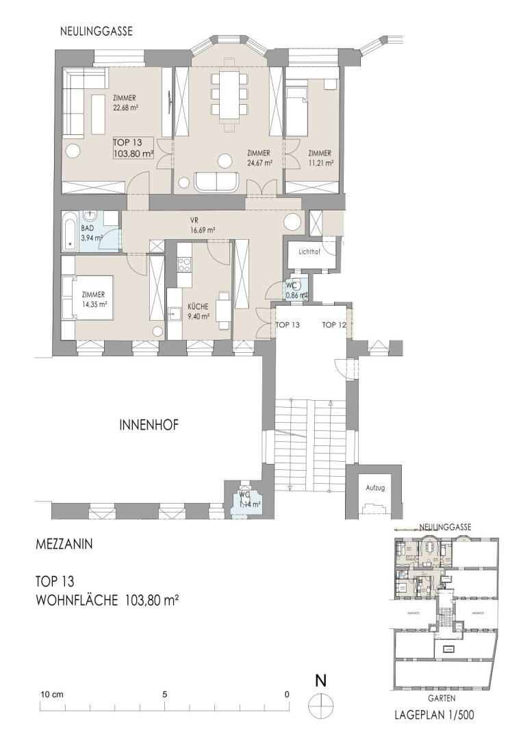 Die Neulinggasse 19 liegt in einer ruhigen, gewachsenen Wohngegend mit sehr guter Alltagsinfrastruktur. Einkaufsmöglichkeiten, Gastronomie und öffentliche Verkehrsmittel befinden sich in fußläufiger Distanz. Der Innenhof des Hauses sorgt für zusätzliche Ruhe, während zentrale Wiener Lagen rasch erreichbar sind.