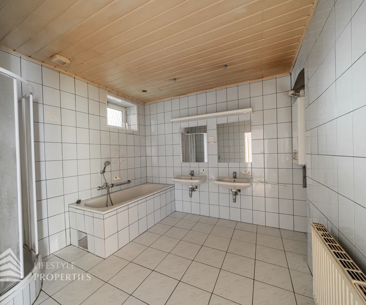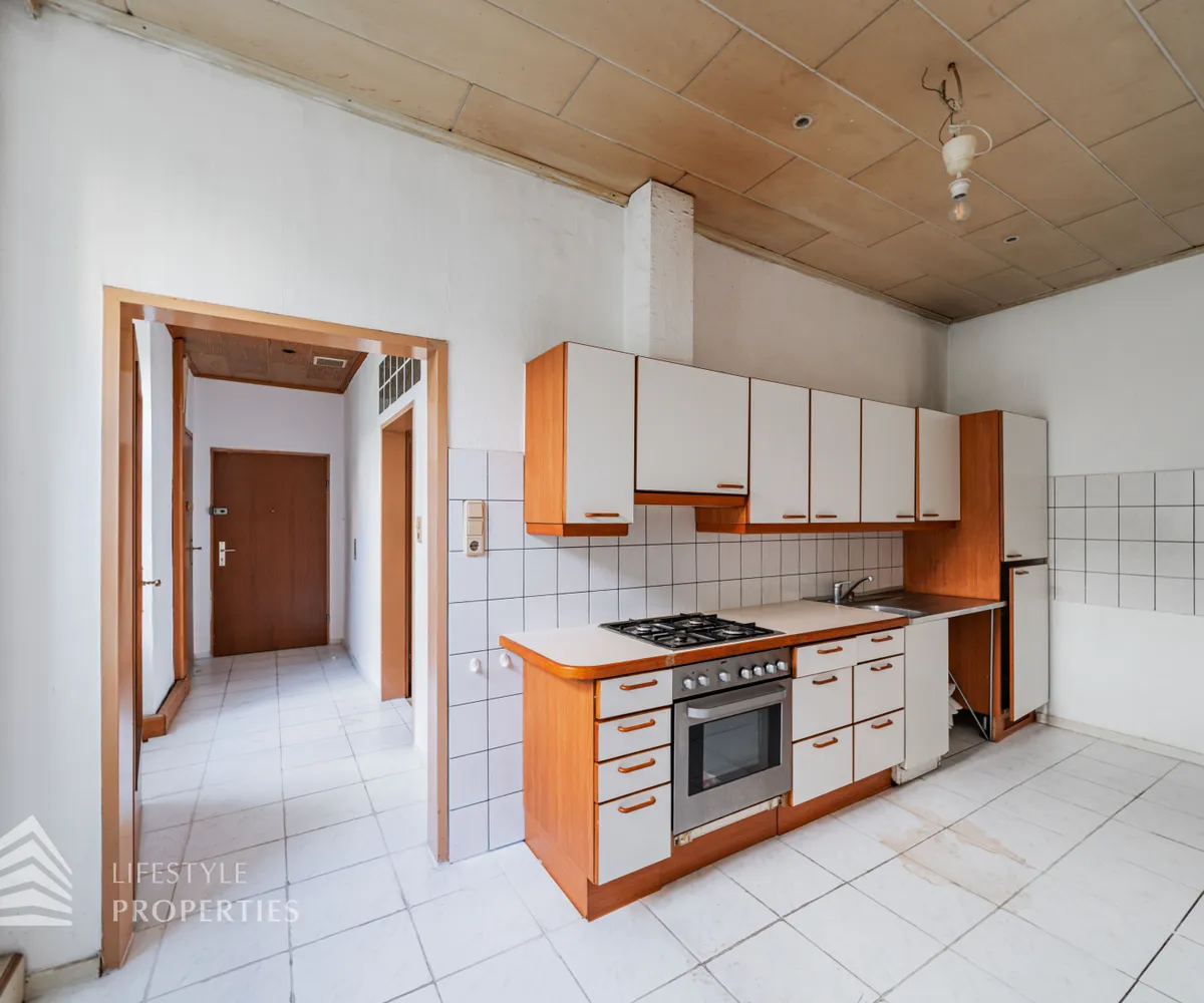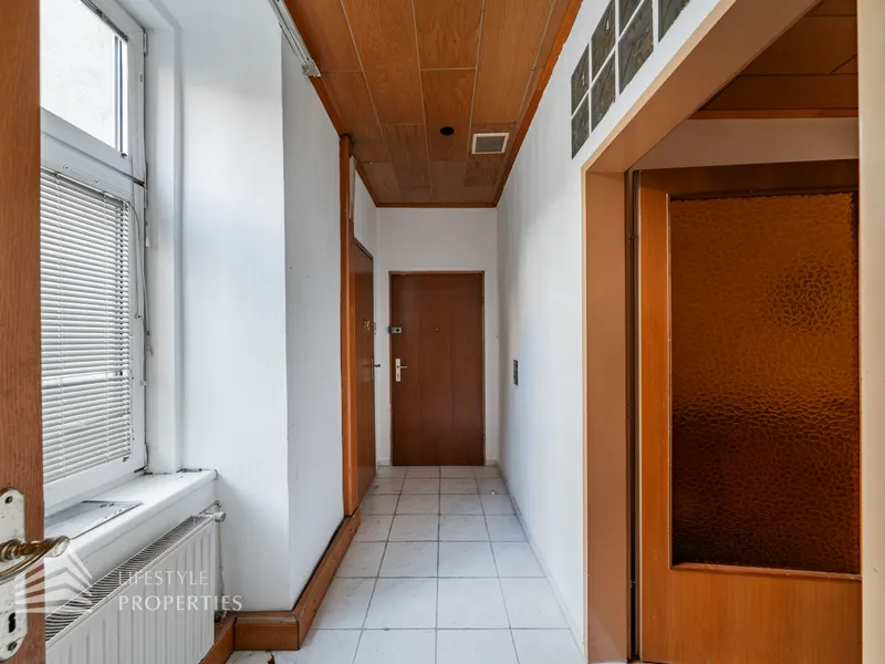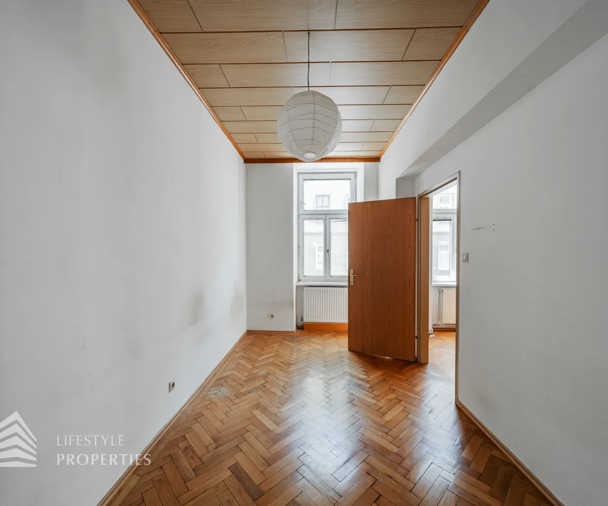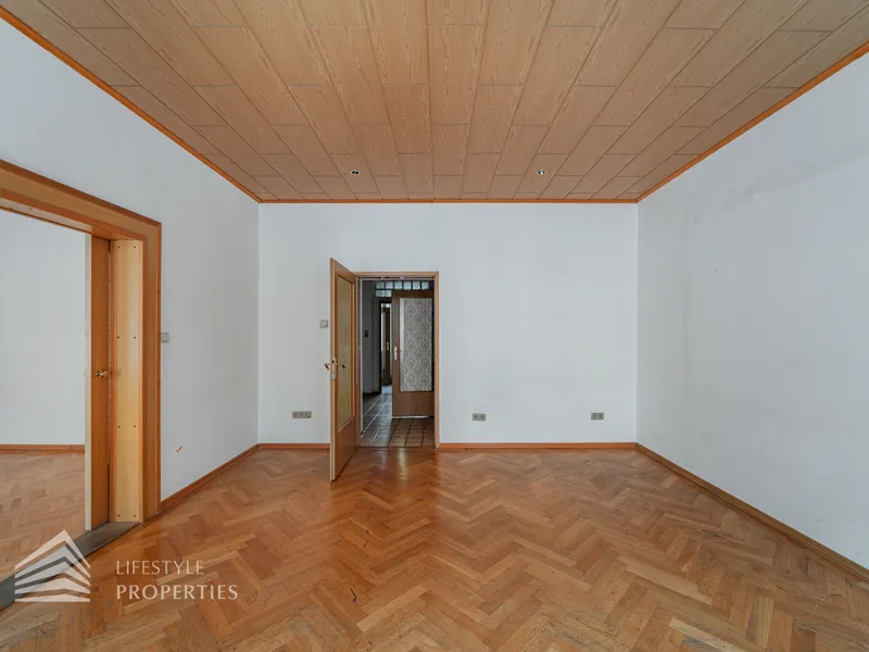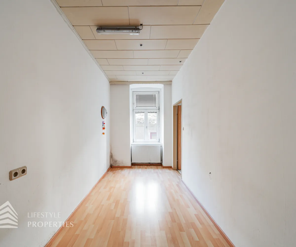Sie betreten die Wohnung und gelangen in einen Vorraum, der in einen Gang mündet. Auf der linken Seite finden Sie die Küche, die mit einem Gaskochfeld und einem Backrohr ausgestattet ist. Von der Küche haben Sie Zugang zu einem fast 10 m² großen Raum, welches sich perfekt als Arbeitsraum oder großen Abstellraum eignet. Zurück zum Vorraum, befindet sich rechts ein weiteres Vorzimmer, welches zu einem ca. 21m² großen Zimmer führt. Links davon befindet sich ein weiterer Raum, welcher aufgrund der Größe von knapp unter 10 m² zwar kein vollwertiges Zimmer ist, sich allerdings ideal beispielsweise als Ankleideraum nutzen lässt. Rechts finden Sie ein weiteres ca. 21 m² großes Zimmer. Zurück in den Vorraum, wo sich das großzügige Badezimmer samt Badewanne, zwei Waschbecken und einer Dusche befindet. Die Toilette finden Sie beim Eingang der Wohnung. Beheizt wird die Wohnung mittels Gasetagenheizung.