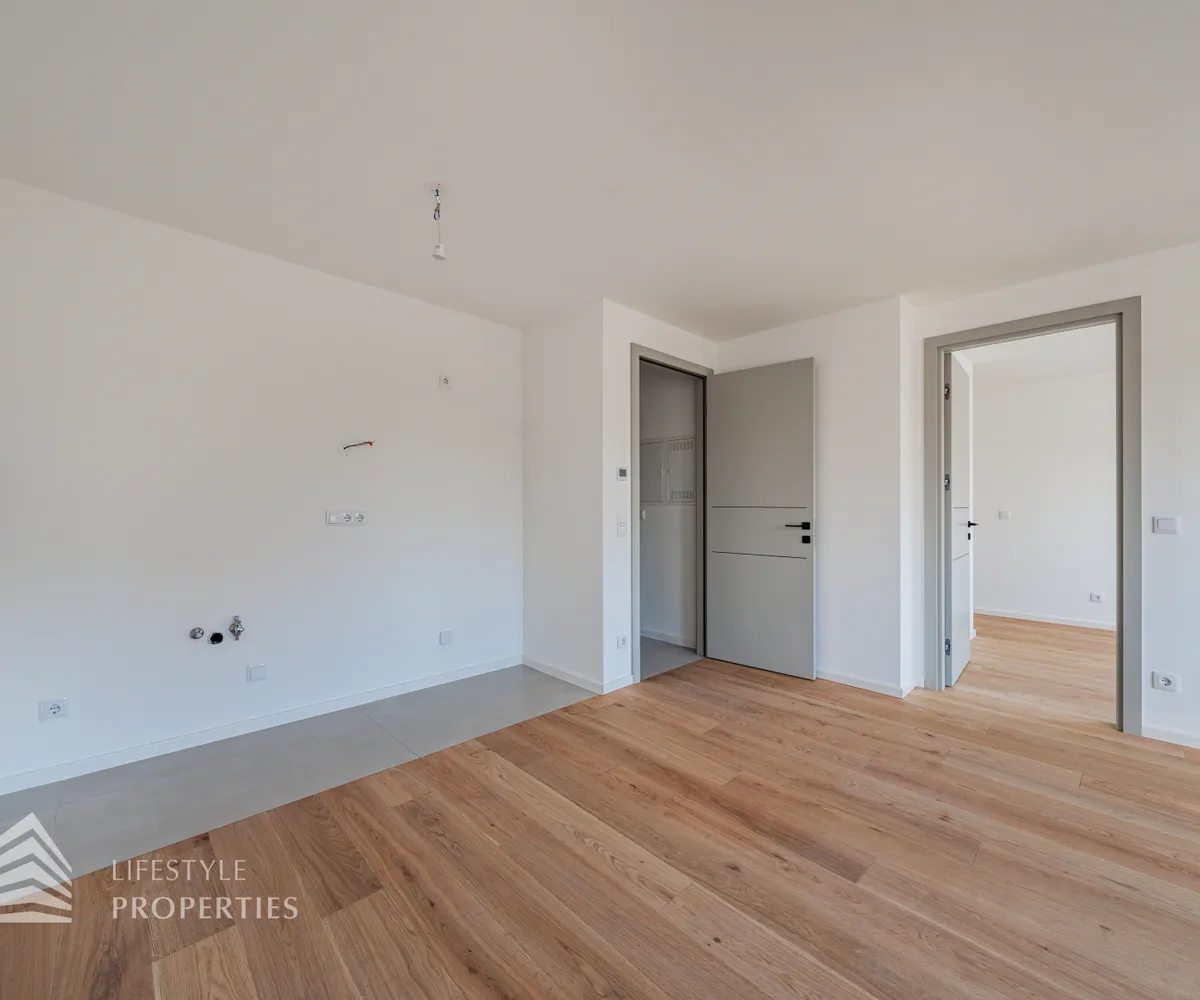 Beim Betreten der Wohnung finden Sie sich in einem charmanten Vorraum wieder. Nach links gelangen Sie in die geräumige Wohnküche, die mit französischen Fenstern viel Tageslicht hereinlässt und einen wunderbaren Blick bietet. Von hier aus haben Sie direkten Zugang zum Schlafzimmer, das dank einer praktischen Nische den perfekten Platz für eine Garderobe bietet.